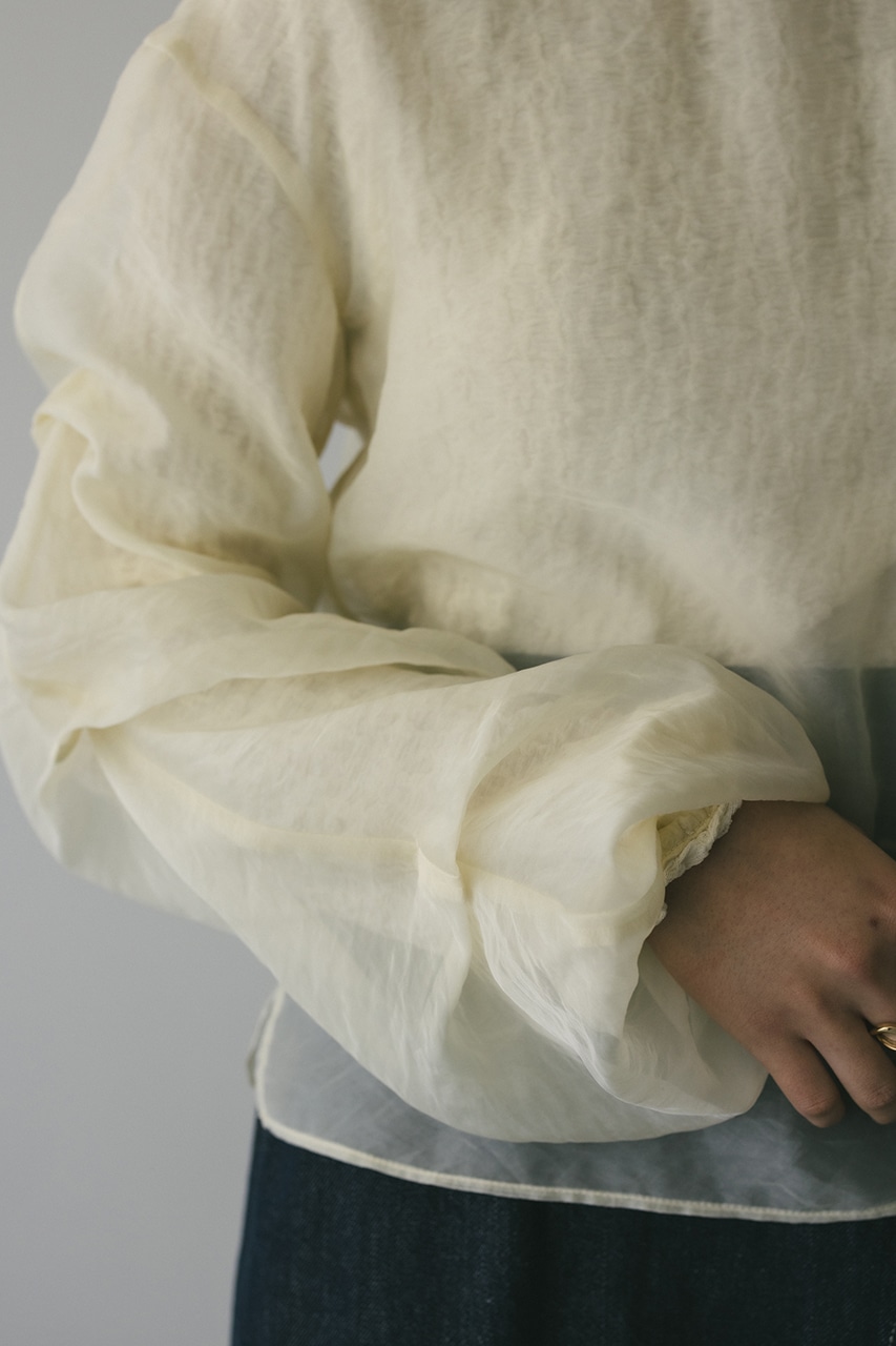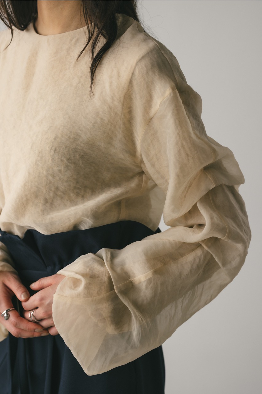 凹凸感のあるカットソー素材にシアー素材をレイヤードしたブラウス。袖のニュアンスのあるタックがモードフェミニン要素をプラス。袖口はゴム仕様で、たくしあげて着用することも可能。インナーは伸縮性のあるカットソー素材で着心地の良い一枚です。ストレッチあり(インナーのみ)、透け感なし。