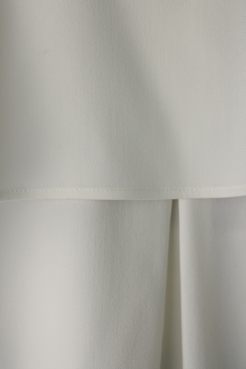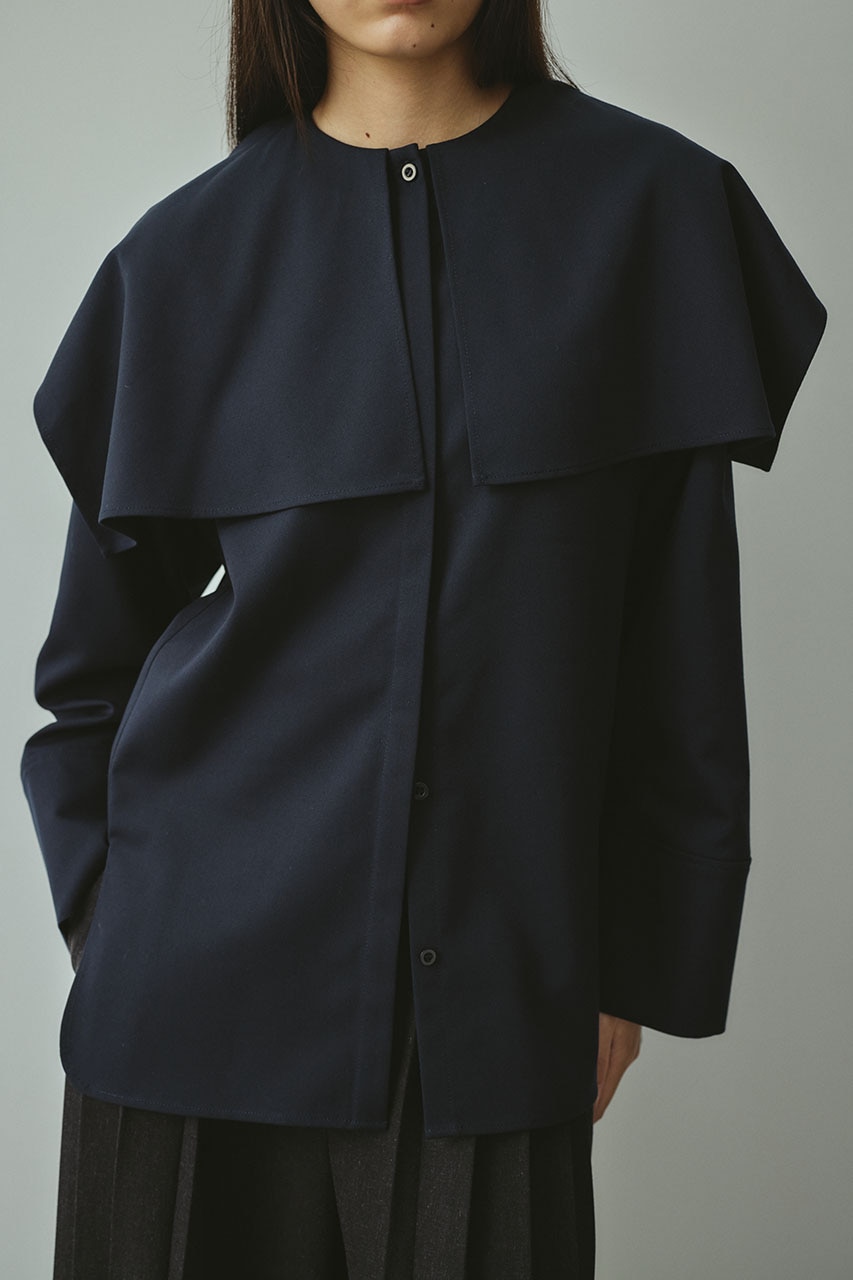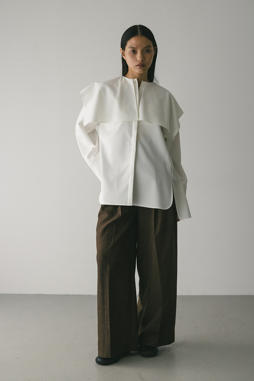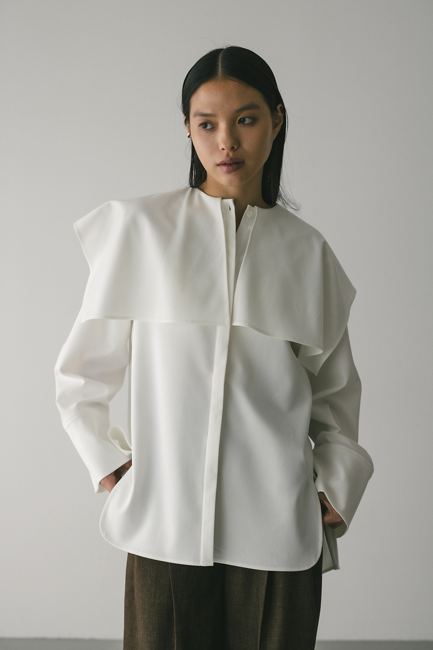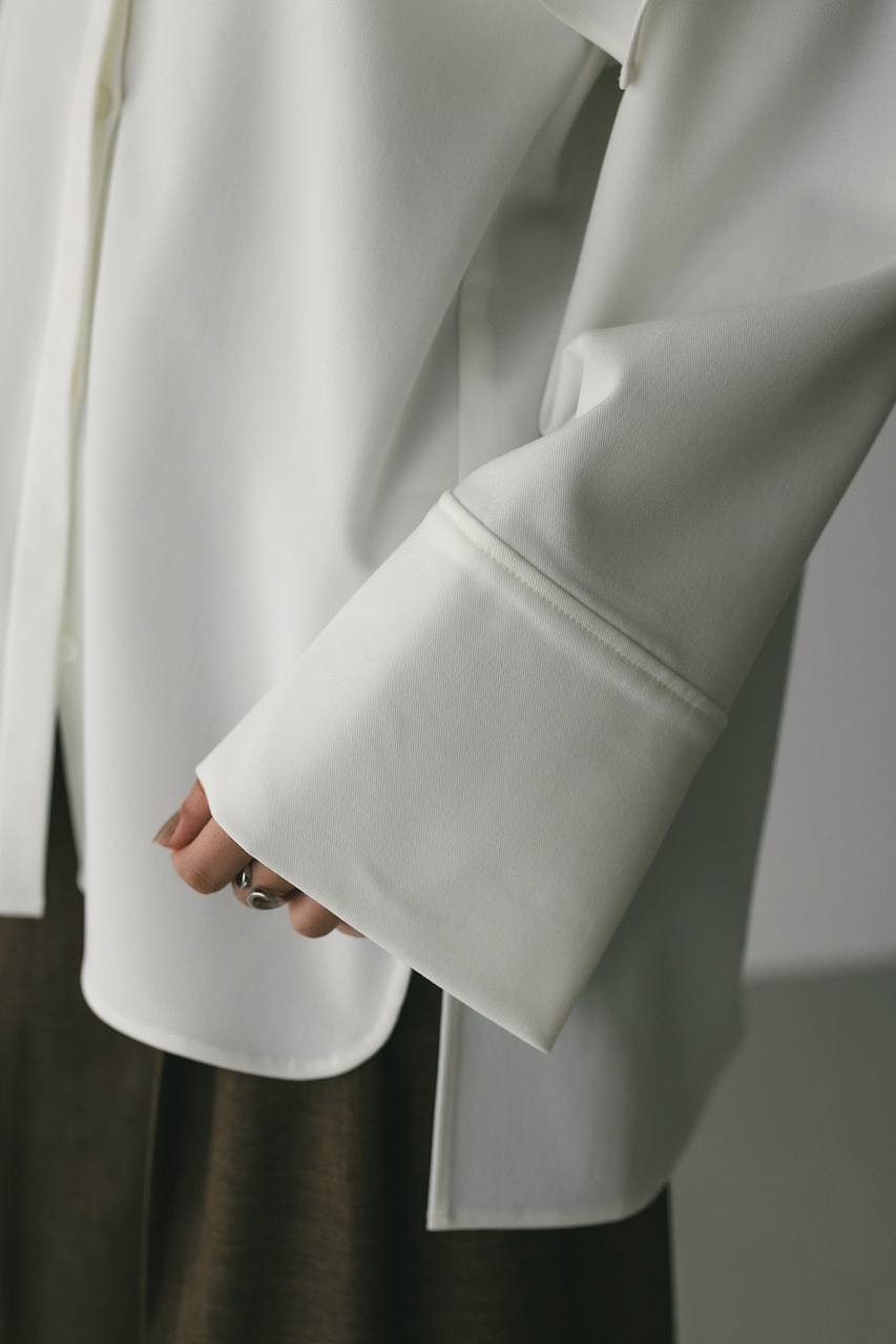 ビックカラーとモードなワイドカフがポイントのシャツトップ。オンオフ問わずお使いいただける素材感で、キレイめにもカジュアルにも着用頂けます。ストレッチなし、透け感WHTややあり。