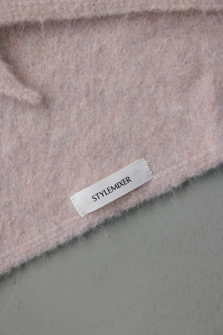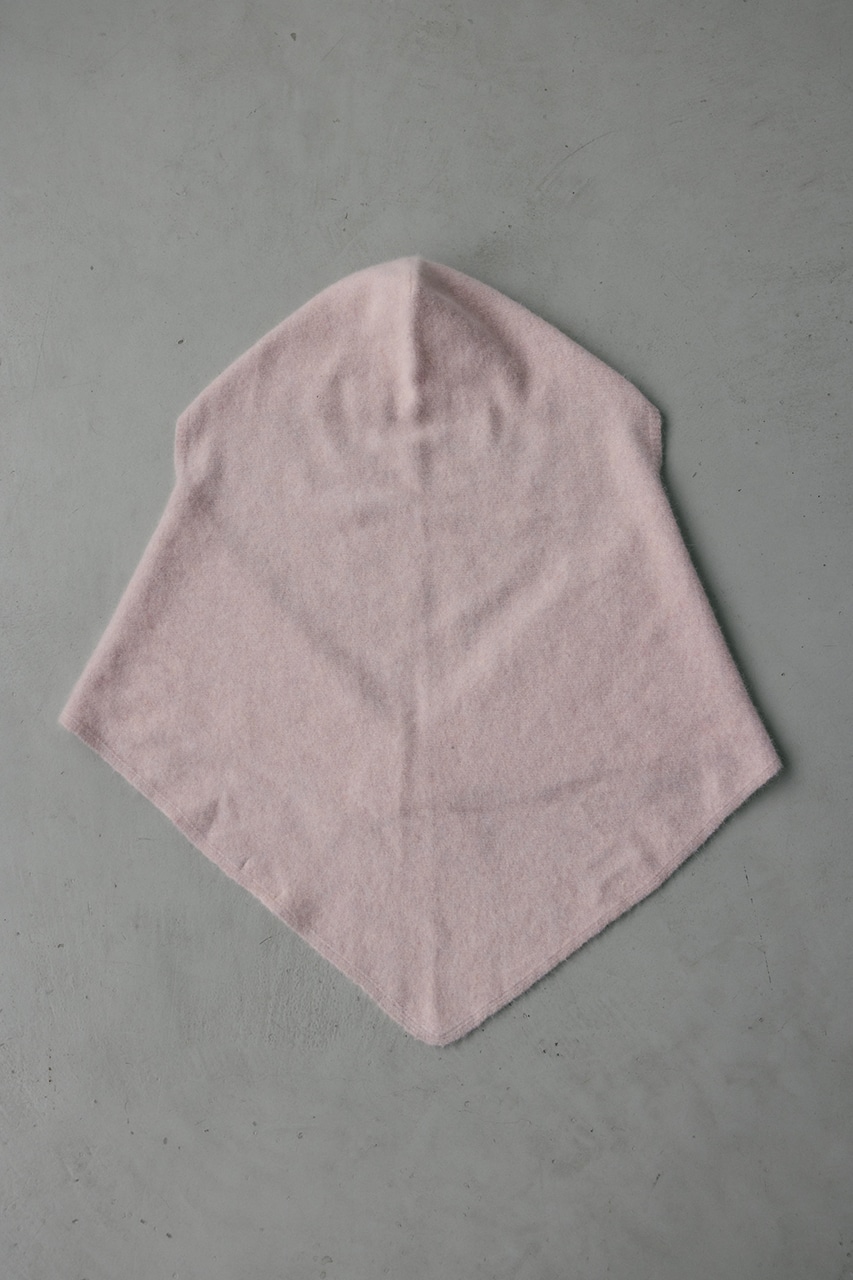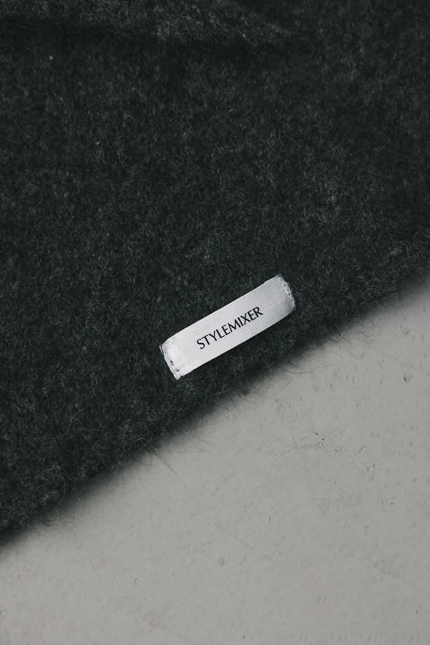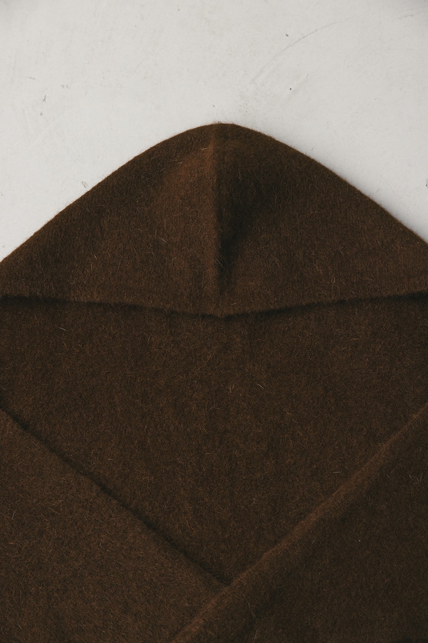 アンゴラ混の糸で編み上げた柔らかな風合いのニットスカーフ。三角型のスカーフにフード付きなので、防寒対策にもおすすめです。コートやニットの上に巻くだけでこなれた印象になれるアイテム。