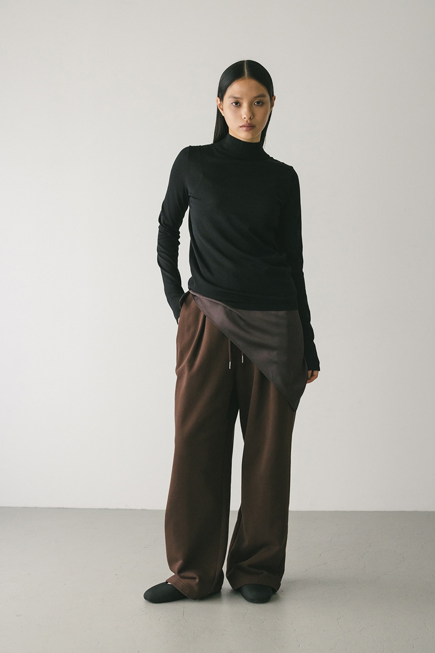 スタミキ定番人気のバックストリングデザインがポイントのニット。首に綺麗に沿うモックネックに施されたバックストリングデザインがモードで上品さを際立たせます。14Gのハイゲージで編みたてているので肌触りもよく、綺麗めにもカジュアルにも着用頂けます。透け感ややあり、ストレッチあり。