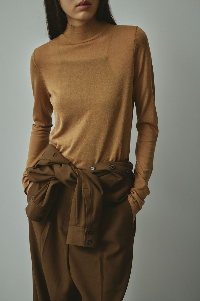 スタミキ定番人気のバックストリングデザインがポイントのニット。首に綺麗に沿うモックネックに施されたバックストリングデザインがモードで上品さを際立たせます。14Gのハイゲージで編みたてているので肌触りもよく、綺麗めにもカジュアルにも着用頂けます。透け感ややあり、ストレッチあり。