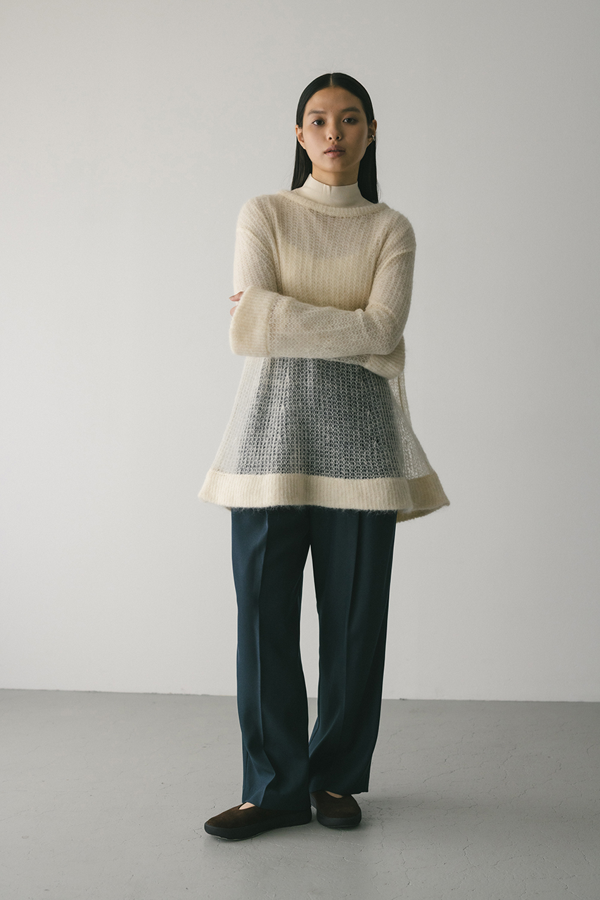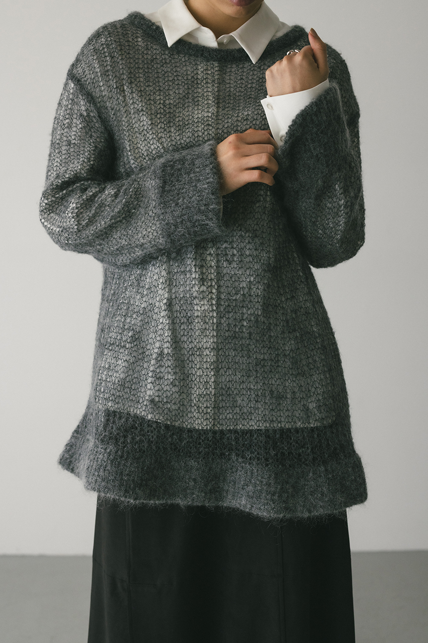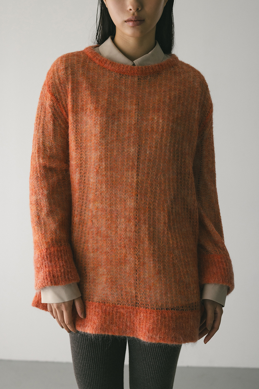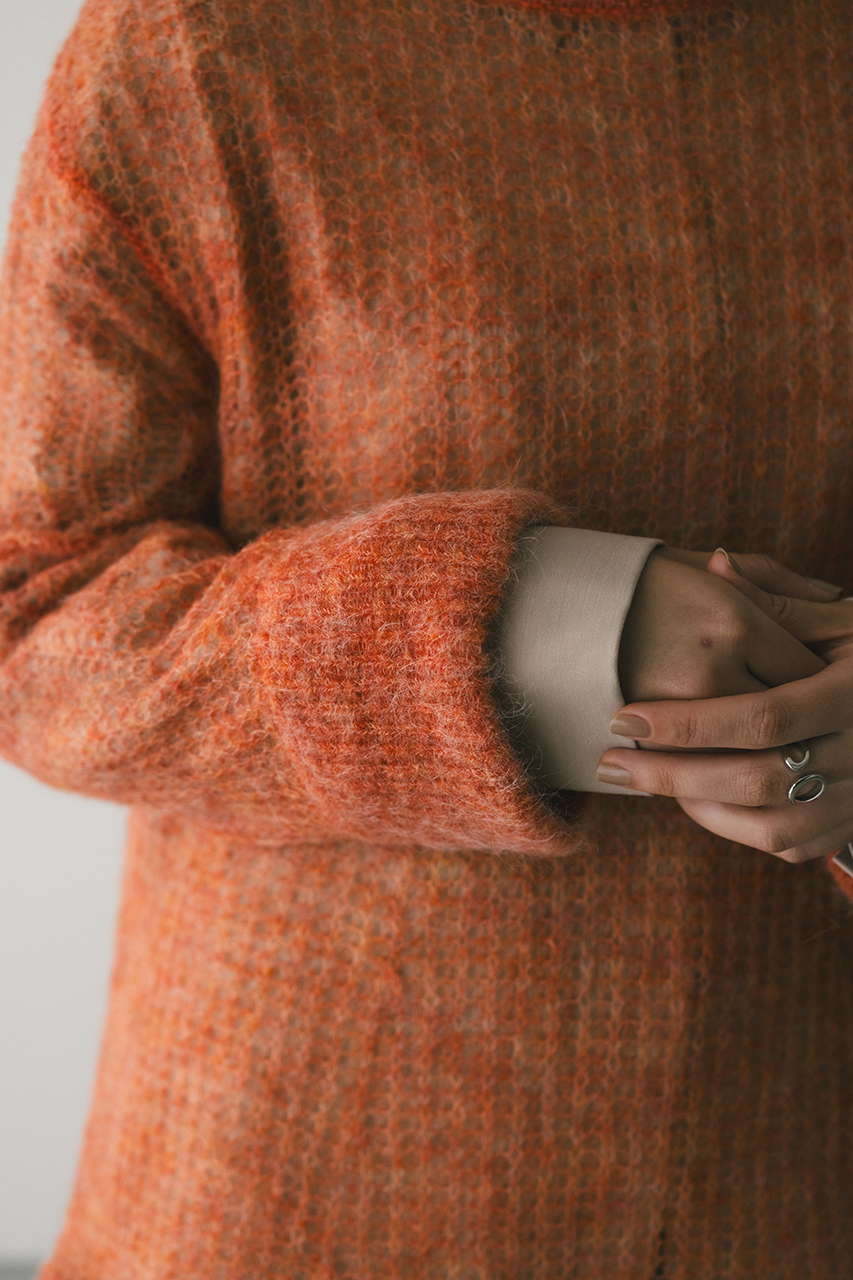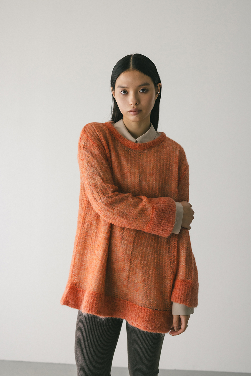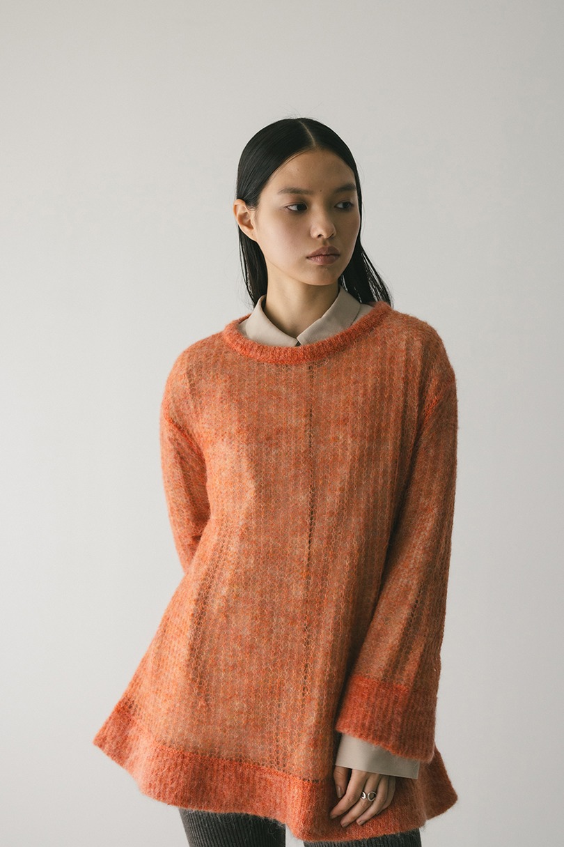 モヘア混糸をざっくりと緩めに編み上げたルーズニット。襟ぐり、袖口、裾はリブでしっかりとトリミングしてメリハリをプラス。動いた時でも360度可愛いフレアシルエットがポイントです。ゆったりしたサイズ感なのでインナーレイヤードを楽しんでいただけます。ストレッチあり、透け感あり。