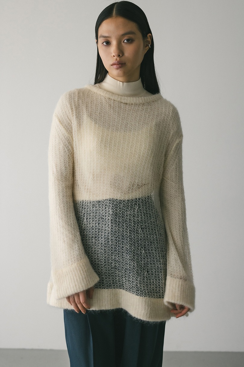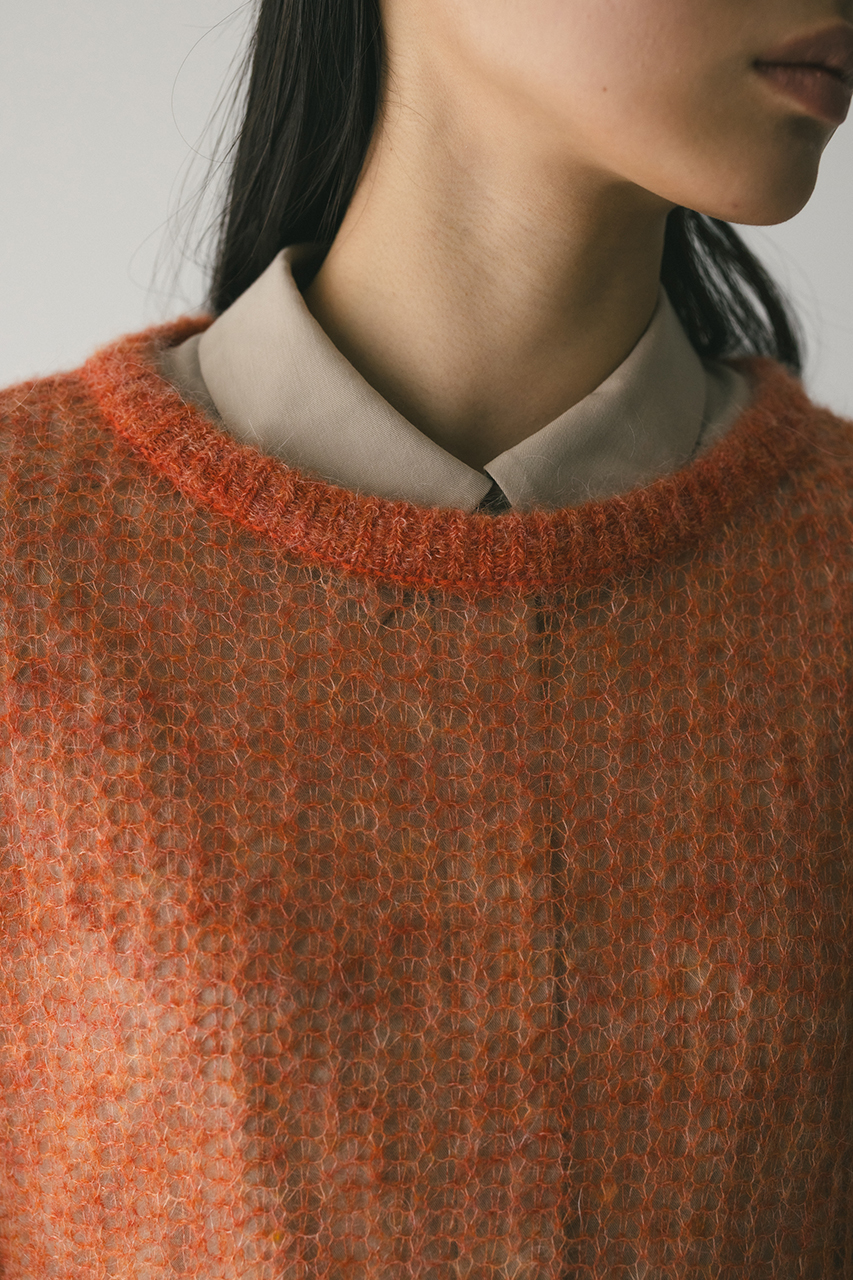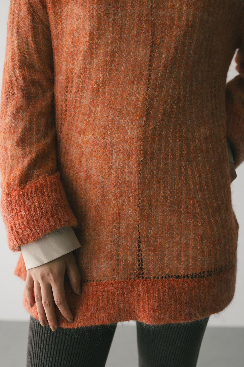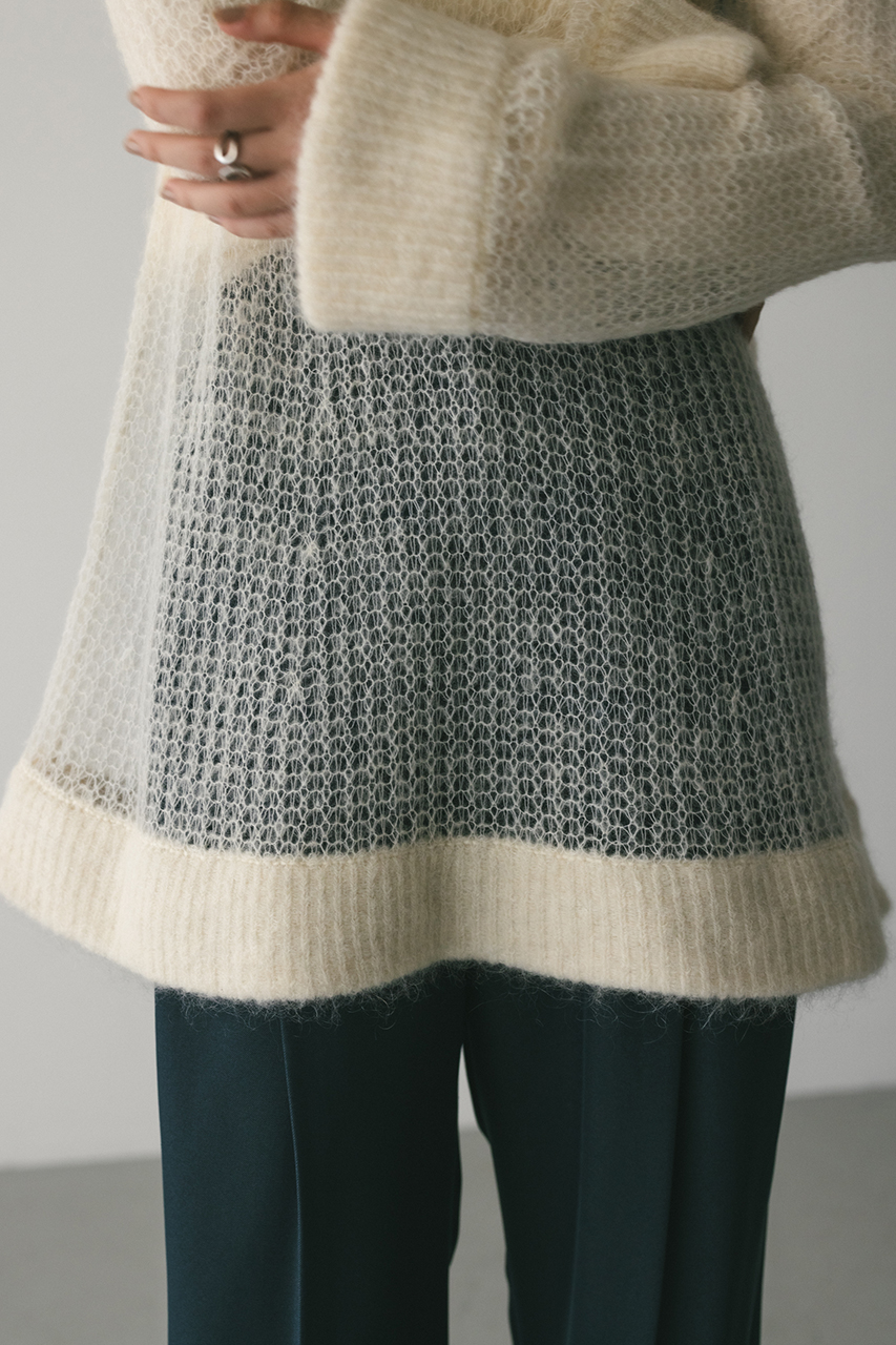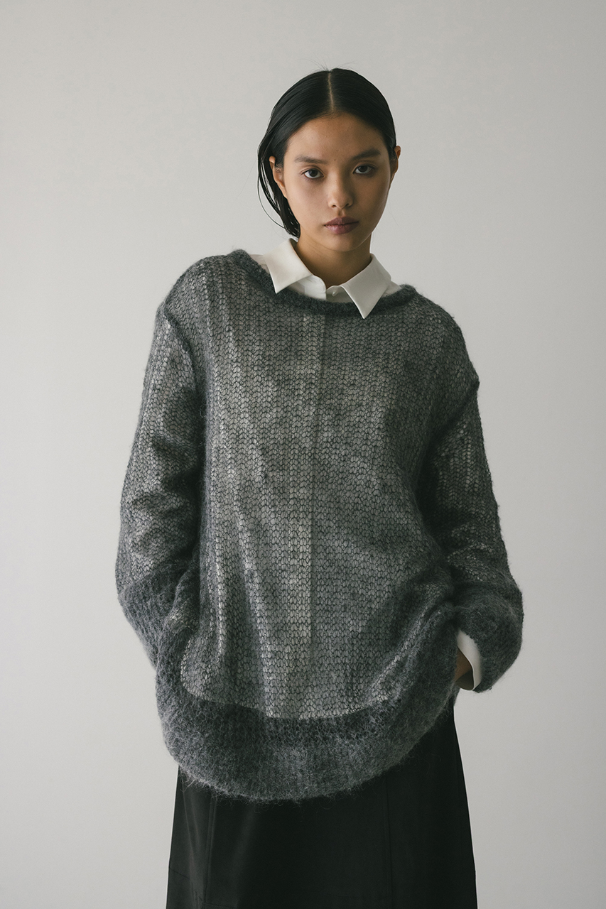 モヘア混糸をざっくりと緩めに編み上げたルーズニット。襟ぐり、袖口、裾はリブでしっかりとトリミングしてメリハリをプラス。動いた時でも360度可愛いフレアシルエットがポイントです。ゆったりしたサイズ感なのでインナーレイヤードを楽しんでいただけます。ストレッチあり、透け感あり。