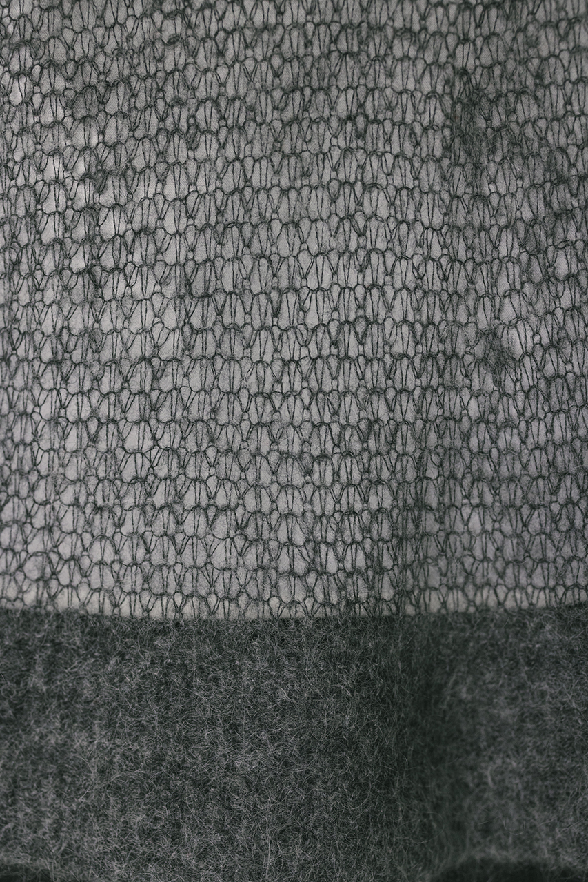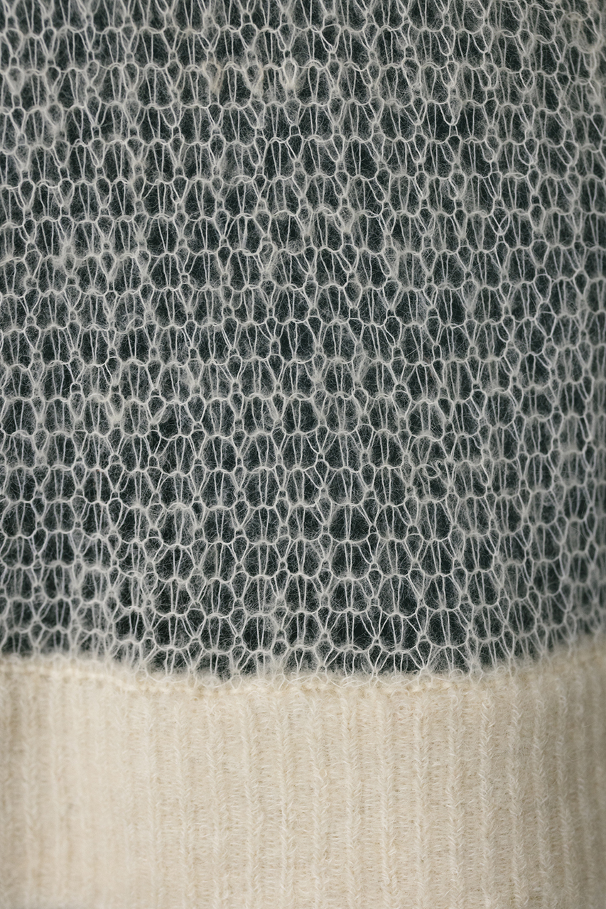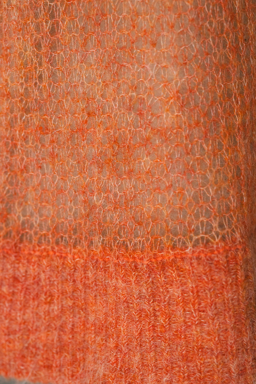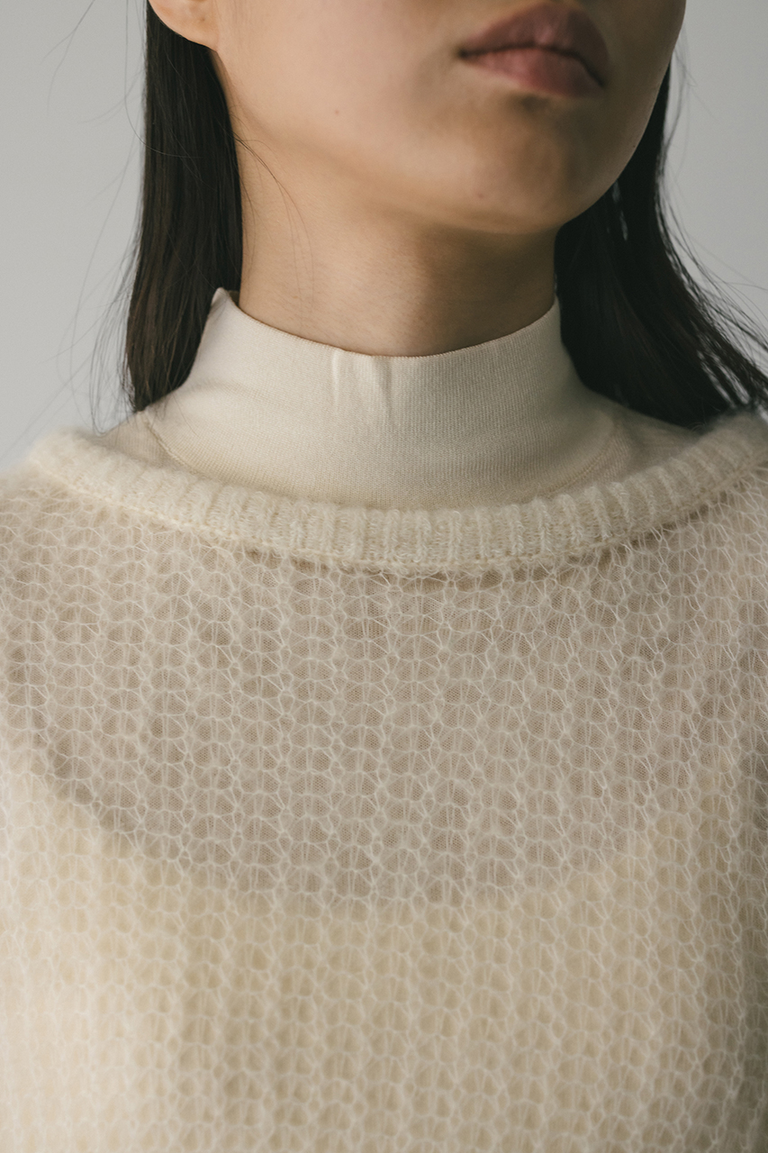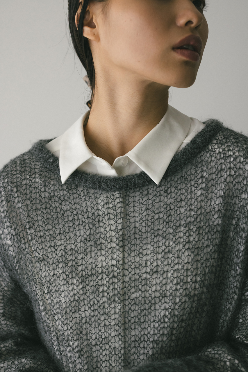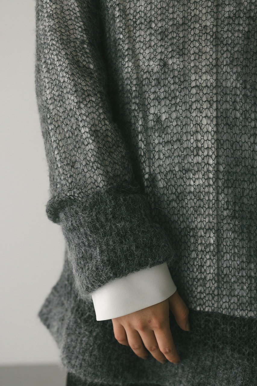 モヘア混糸をざっくりと緩めに編み上げたルーズニット。襟ぐり、袖口、裾はリブでしっかりとトリミングしてメリハリをプラス。動いた時でも360度可愛いフレアシルエットがポイントです。ゆったりしたサイズ感なのでインナーレイヤードを楽しんでいただけます。ストレッチあり、透け感あり。