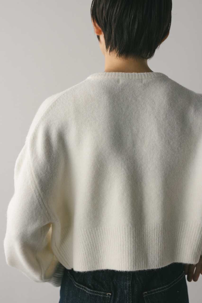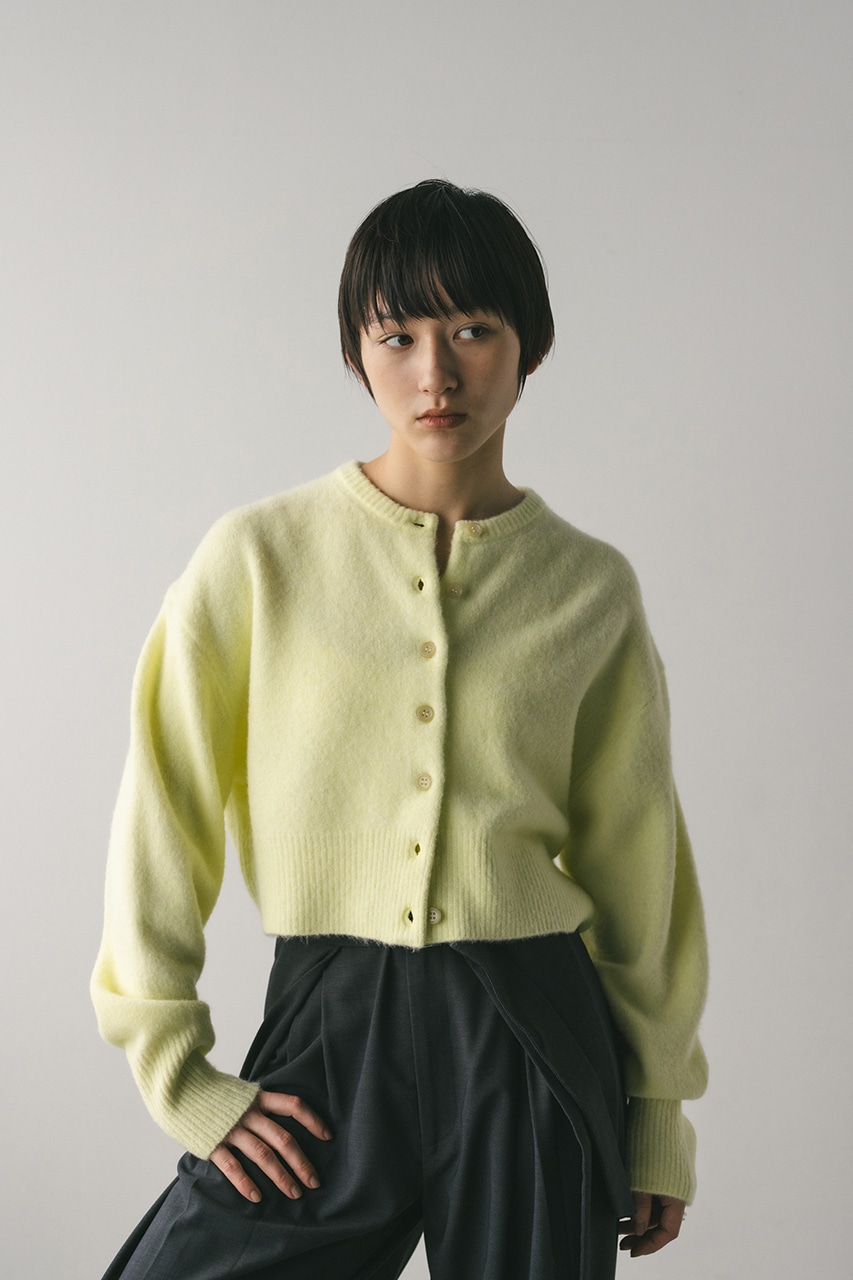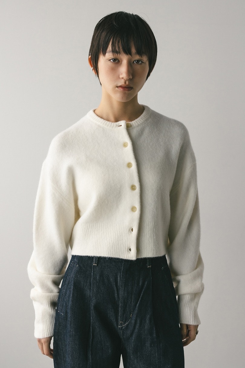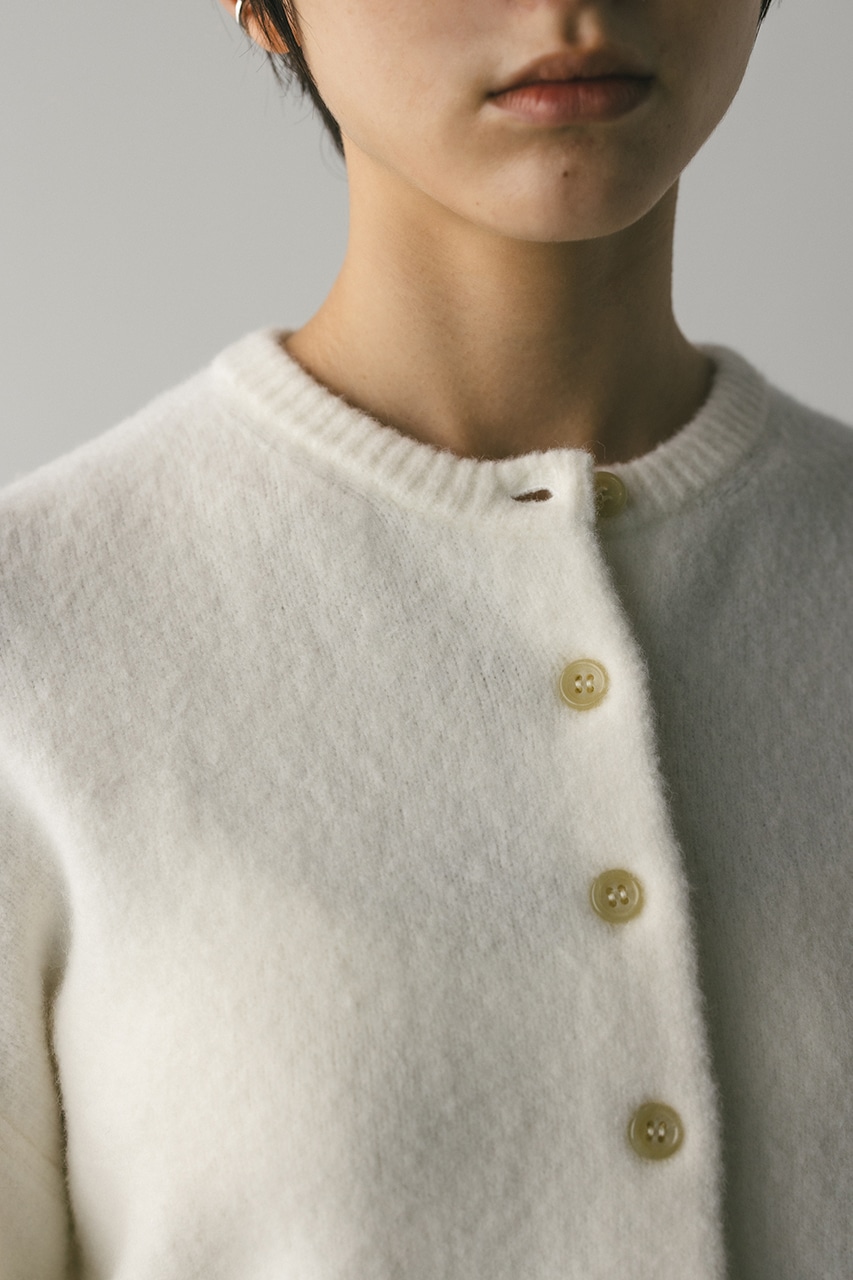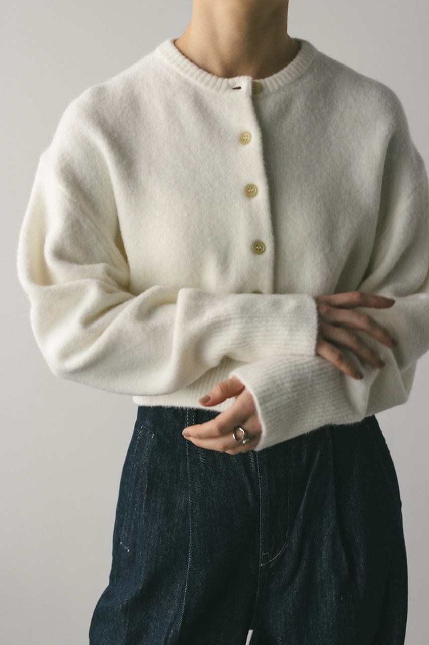 ウール混の膨らみのある糸を使用したニットカーディガン。軽さと温かさをかなえる長く使える万能な一枚。ショート丈なのでボトムスやワンピースとも相性がよく、スタイルアップ見せが叶います。透け感なし、ストレッチあり。