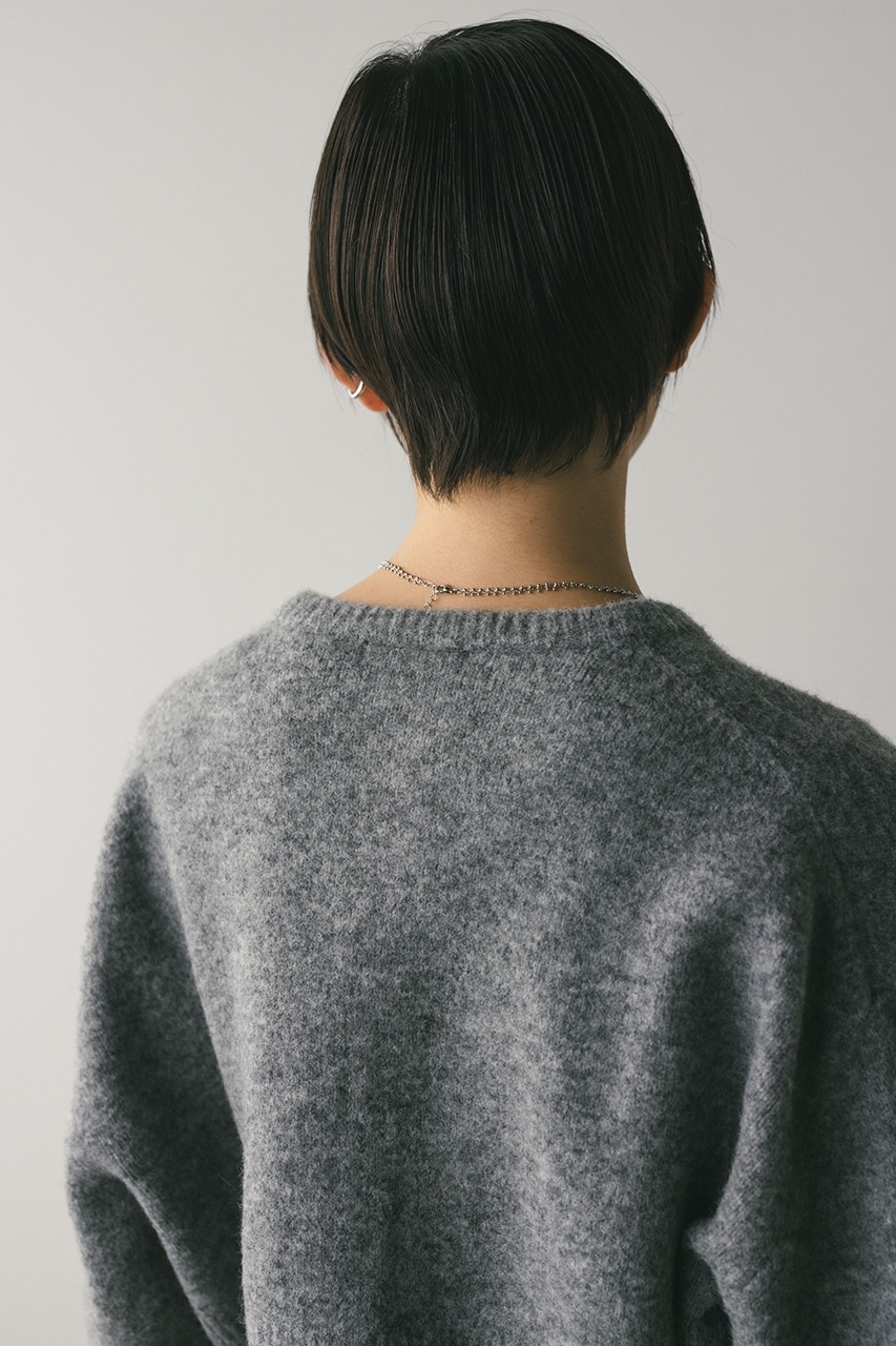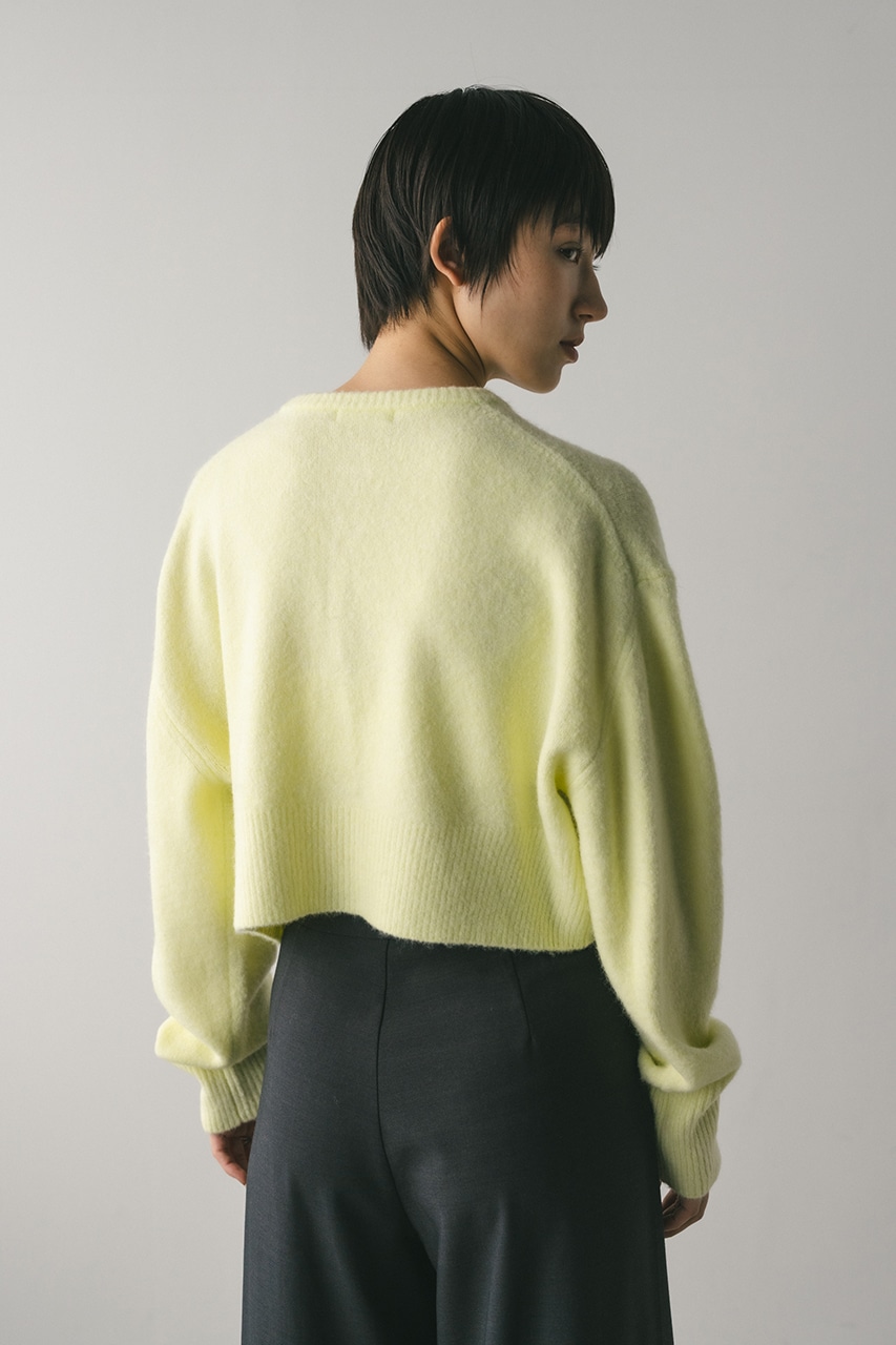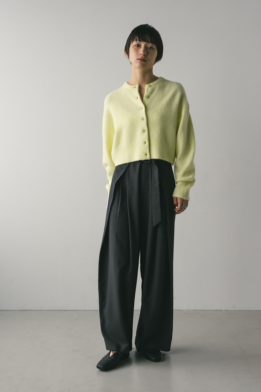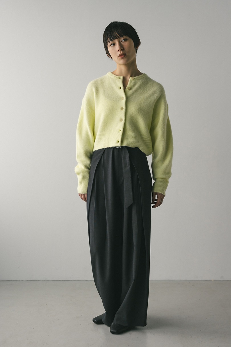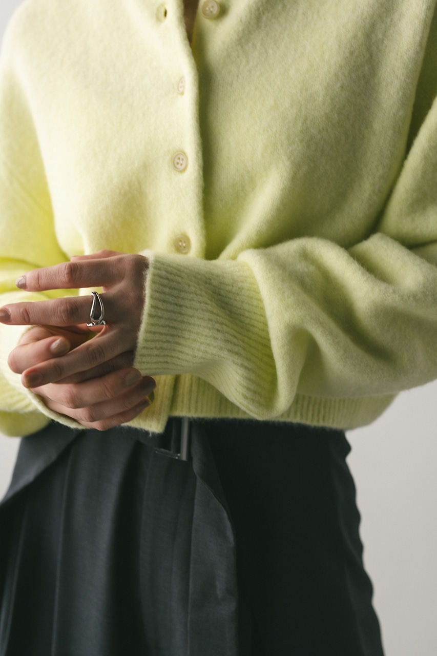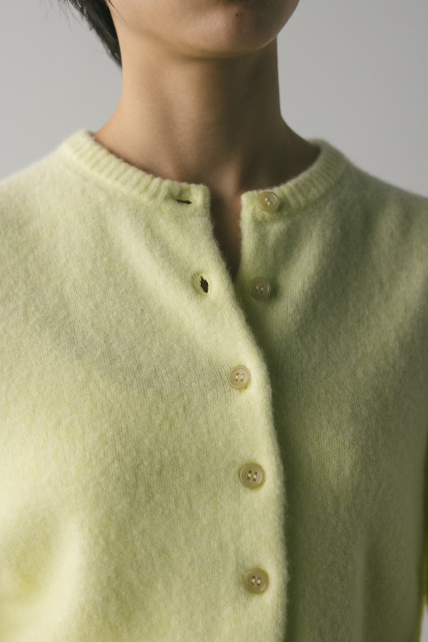 ウール混の膨らみのある糸を使用したニットカーディガン。軽さと温かさをかなえる長く使える万能な一枚。ショート丈なのでボトムスやワンピースとも相性がよく、スタイルアップ見せが叶います。透け感なし、ストレッチあり。