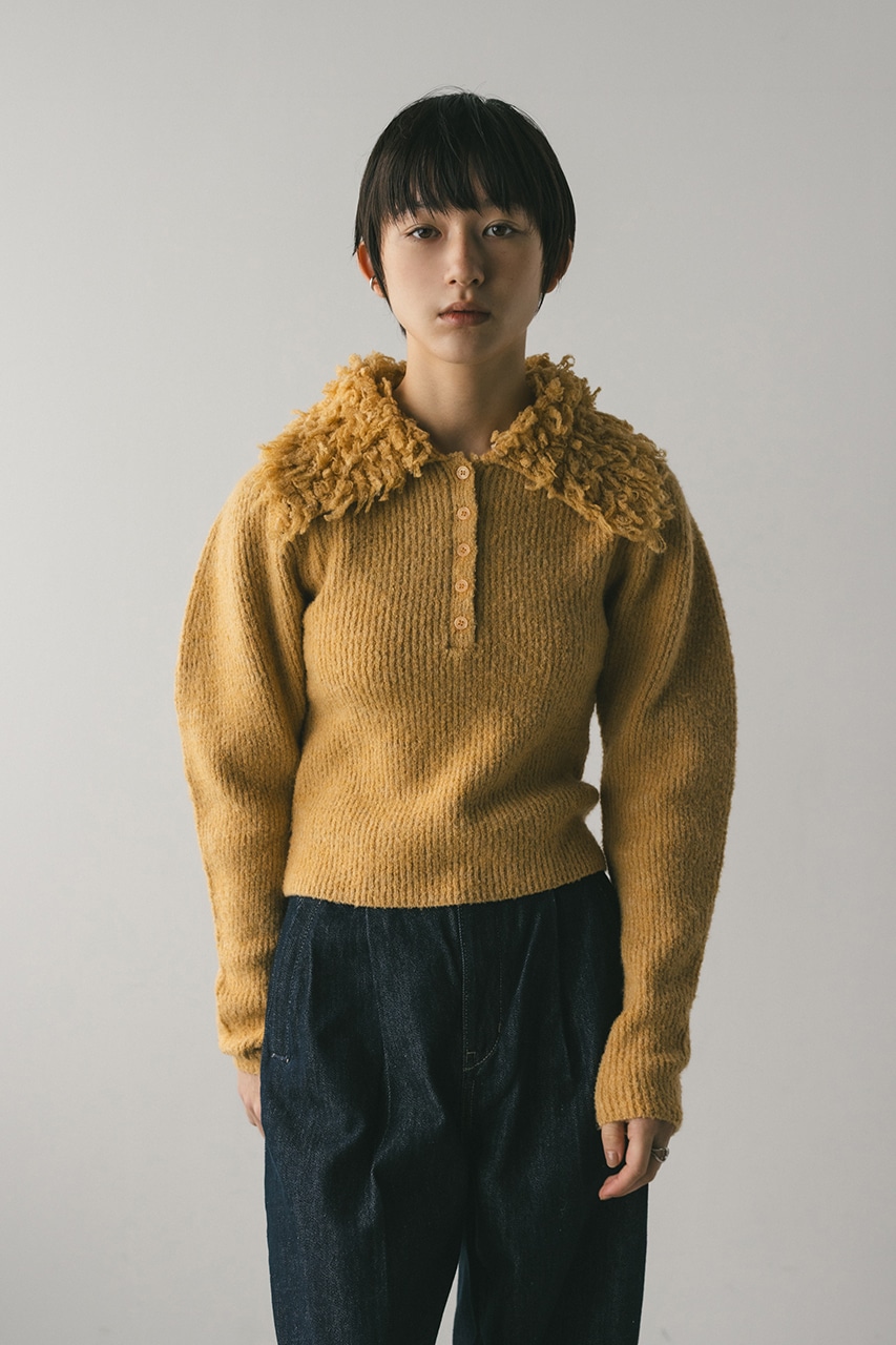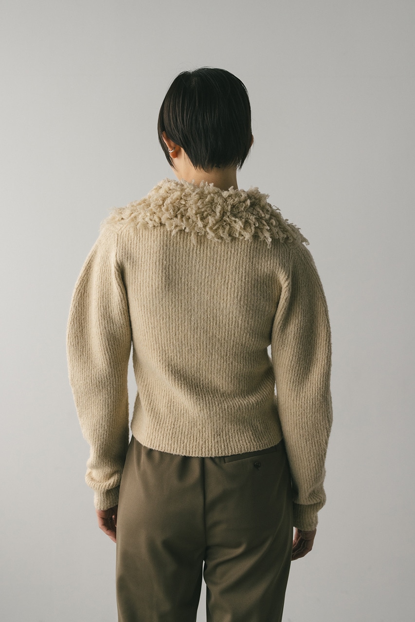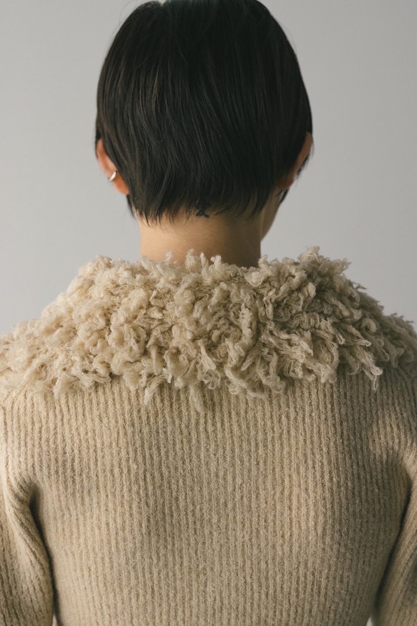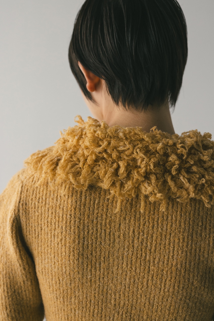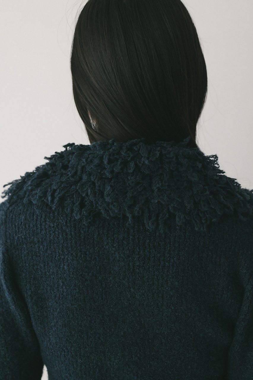 存在感とボリューム感のあるループ編みの襟が目をひく華やかなニット。肩山から肘あたりにかけてフォルムスリーブになっており、モードの雰囲気を与えつつ、二の腕カバーもかなう一枚。見頃はリブですっきりと仕上げ、メリハリのあるニットに仕上げました。ジャケットやアウターの上から襟だけ出したスタイリングもおすすめです。透け感なし、ストレッチあり。