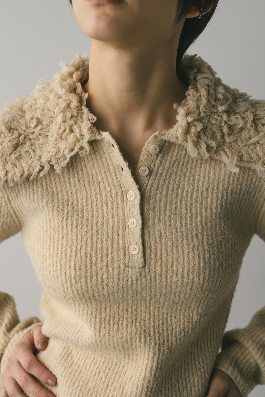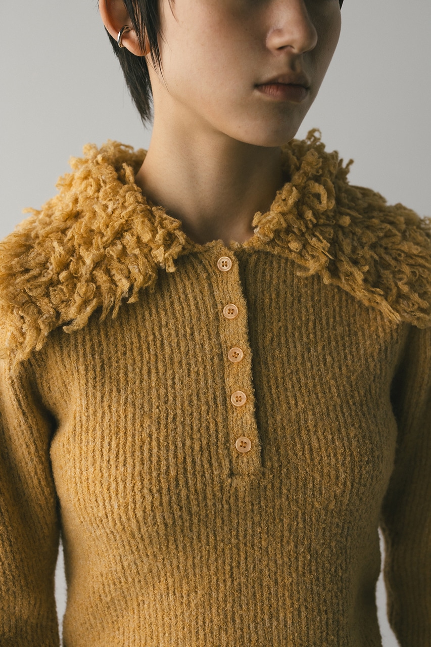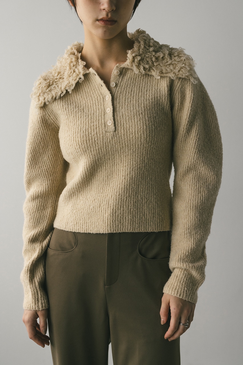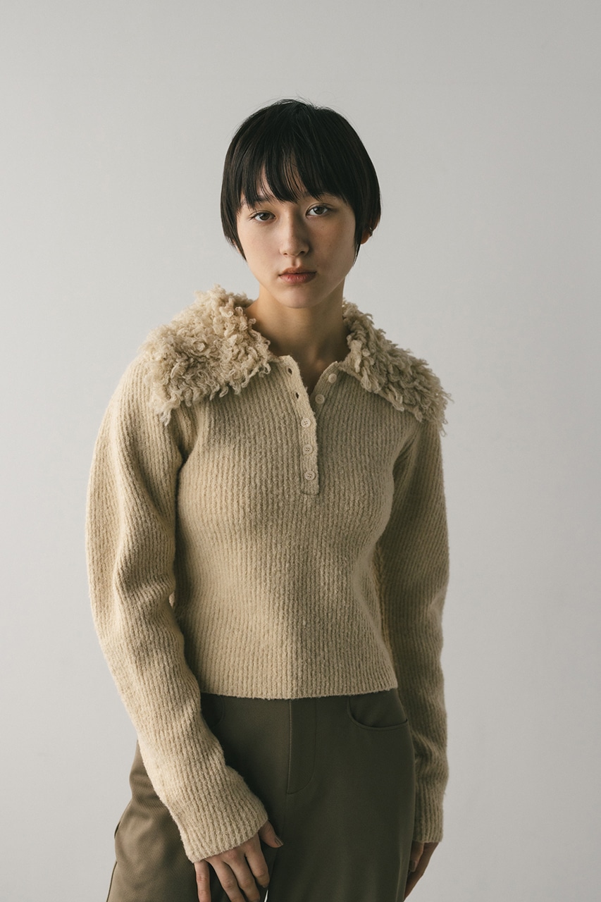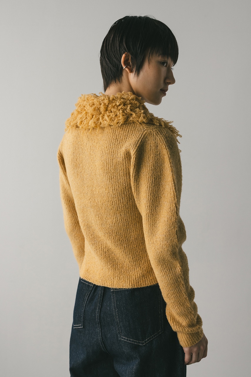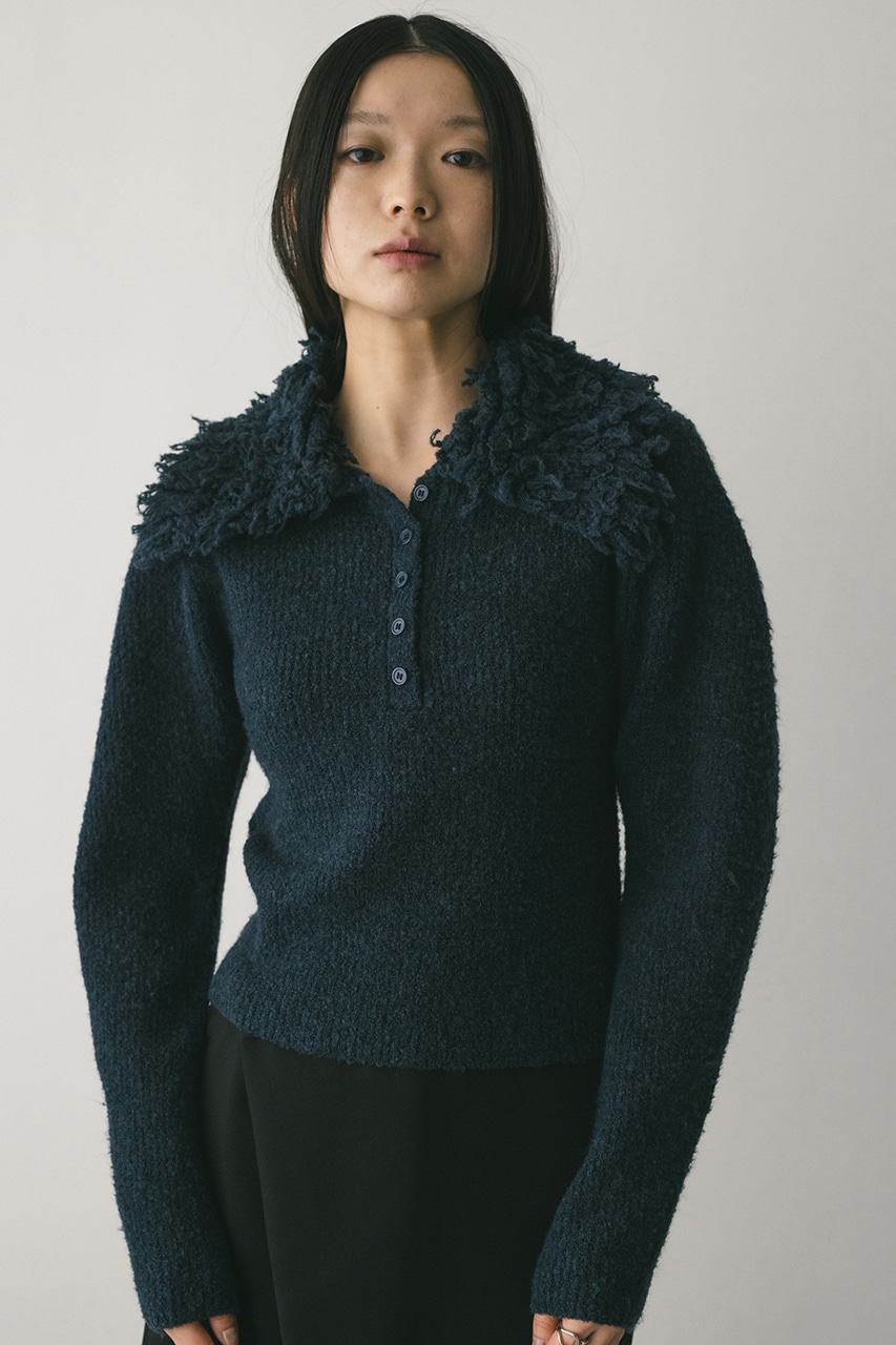 存在感とボリューム感のあるループ編みの襟が目をひく華やかなニット。肩山から肘あたりにかけてフォルムスリーブになっており、モードの雰囲気を与えつつ、二の腕カバーもかなう一枚。見頃はリブですっきりと仕上げ、メリハリのあるニットに仕上げました。ジャケットやアウターの上から襟だけ出したスタイリングもおすすめです。透け感なし、ストレッチあり。