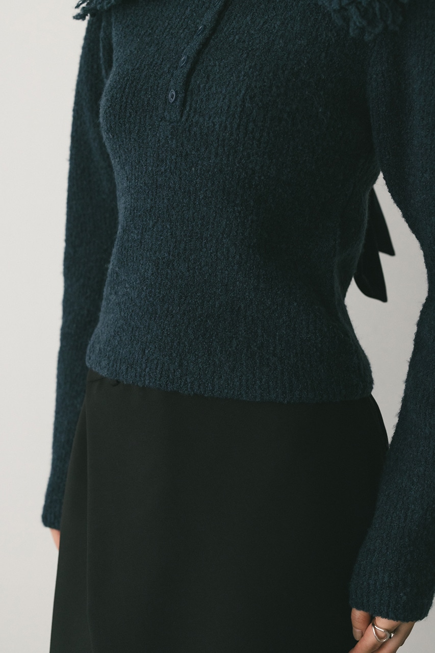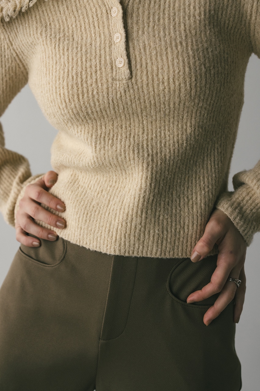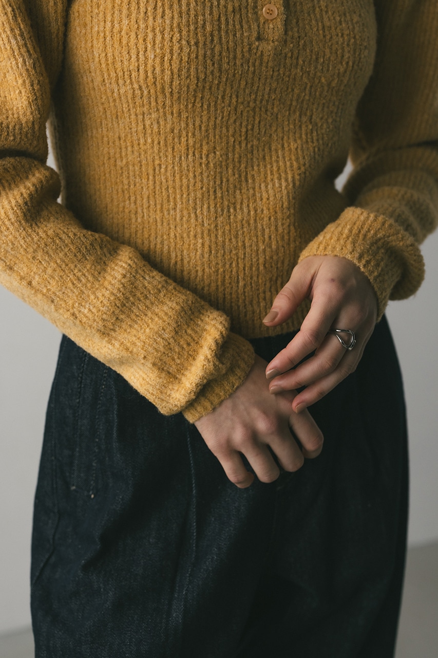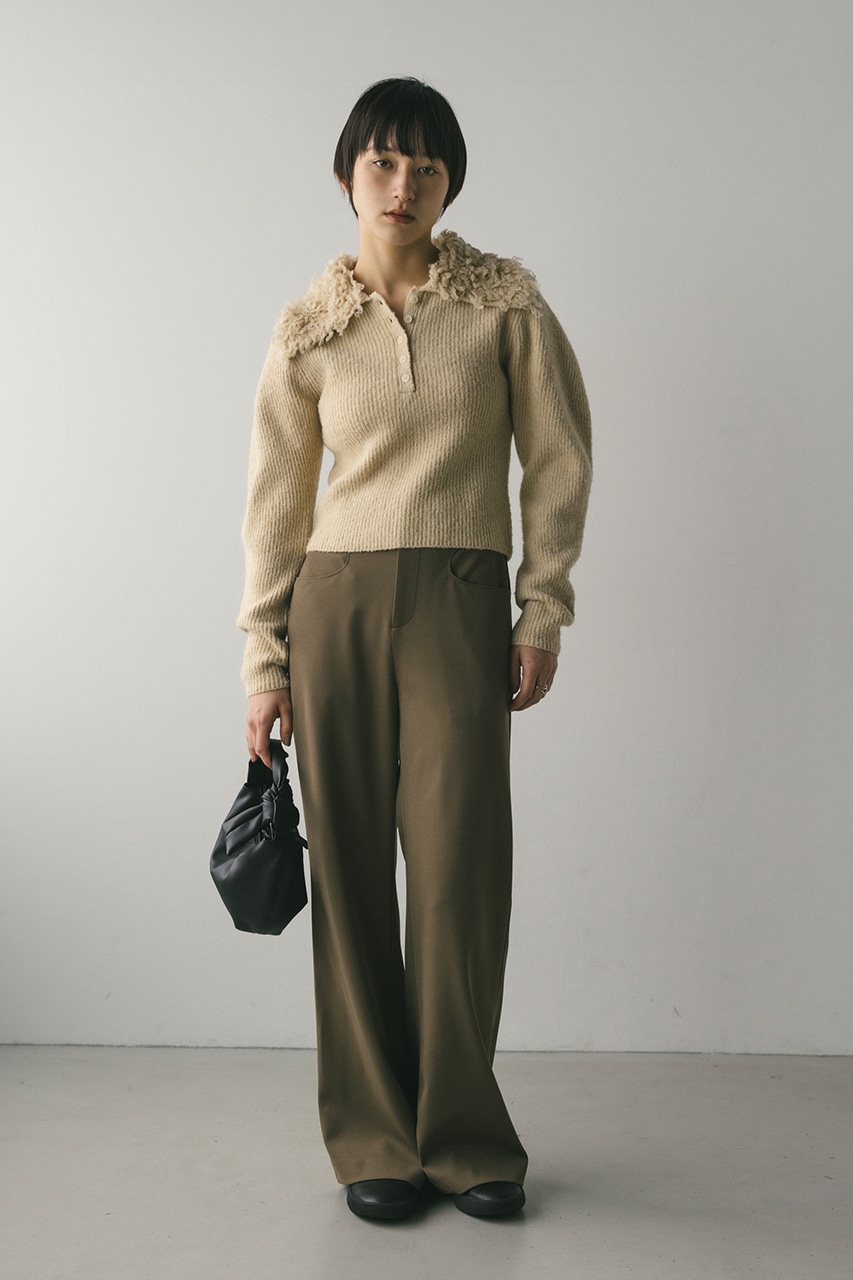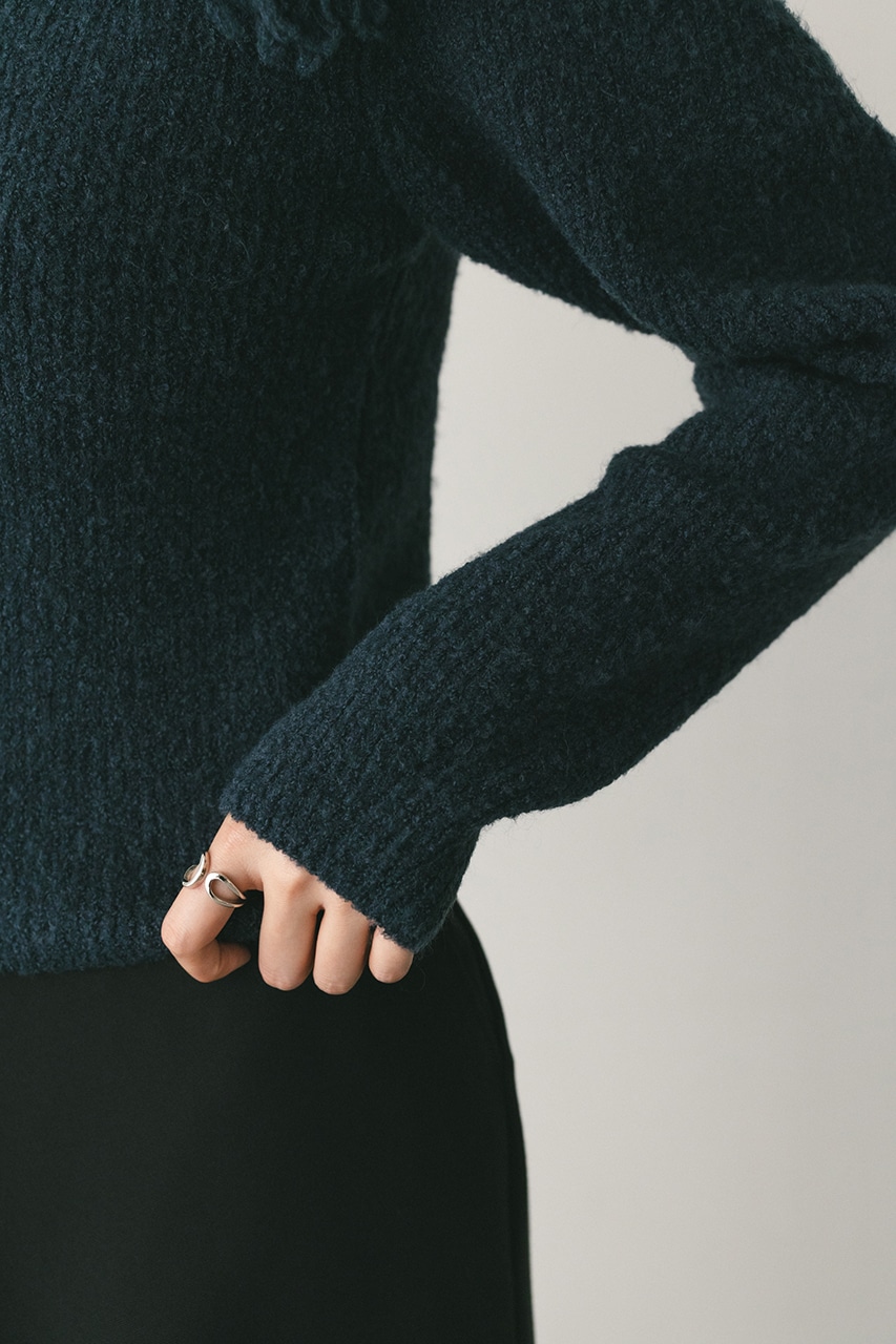 存在感とボリューム感のあるループ編みの襟が目をひく華やかなニット。肩山から肘あたりにかけてフォルムスリーブになっており、モードの雰囲気を与えつつ、二の腕カバーもかなう一枚。見頃はリブですっきりと仕上げ、メリハリのあるニットに仕上げました。ジャケットやアウターの上から襟だけ出したスタイリングもおすすめです。透け感なし、ストレッチあり。