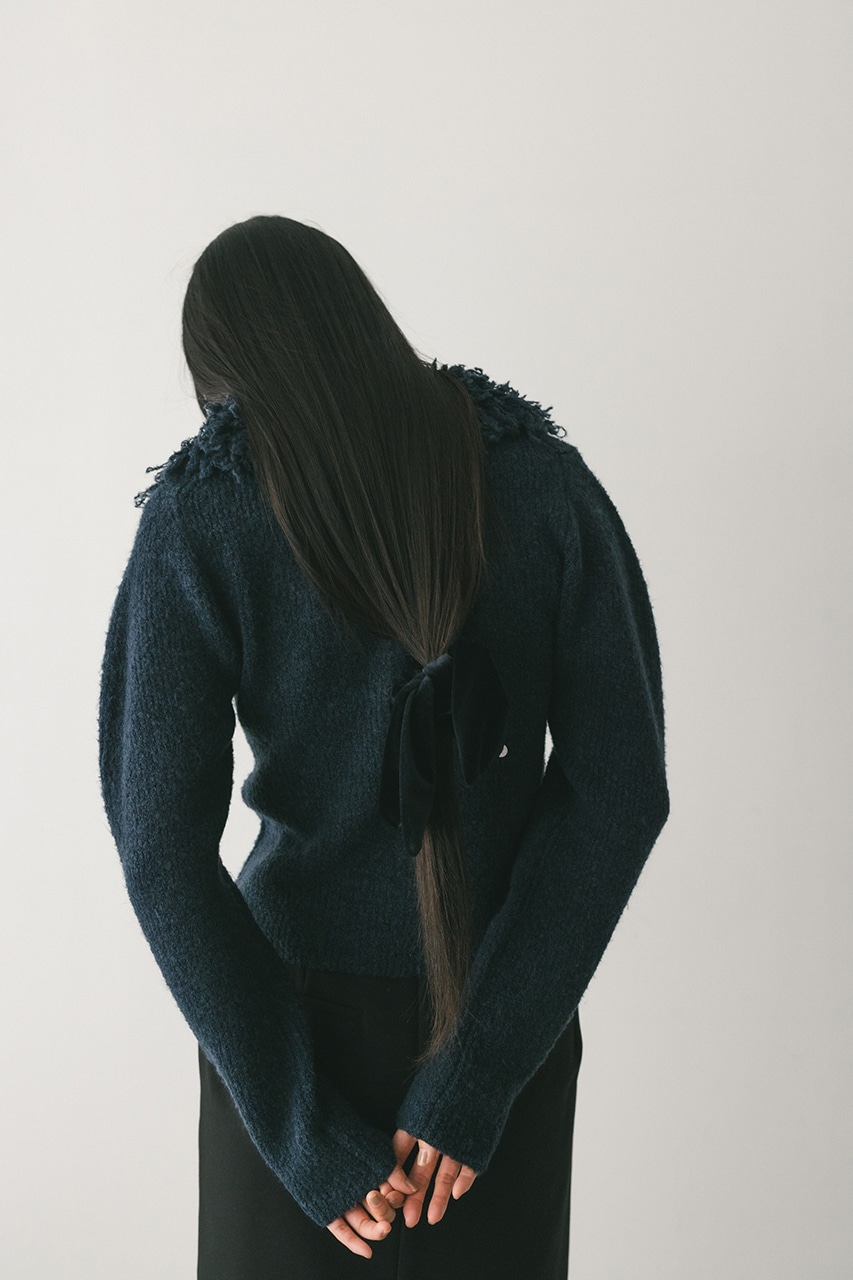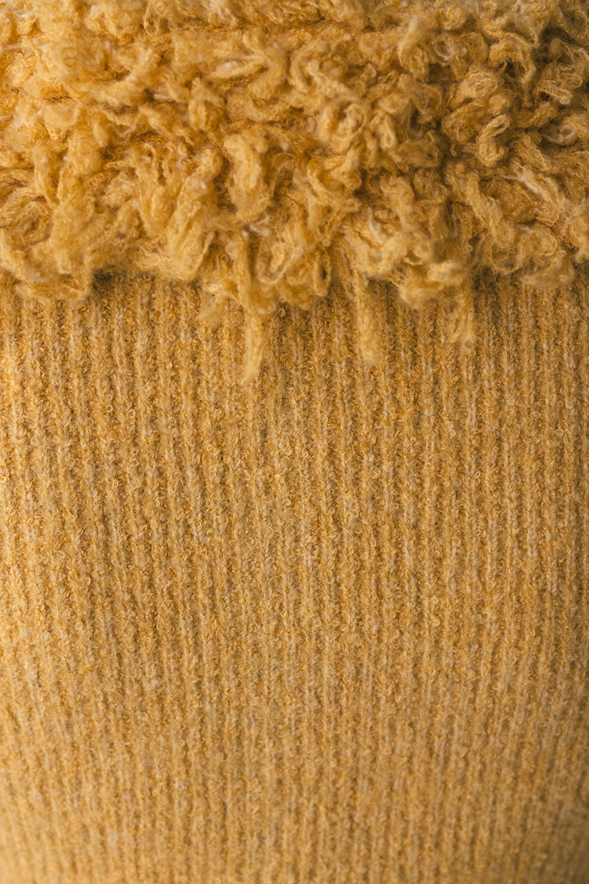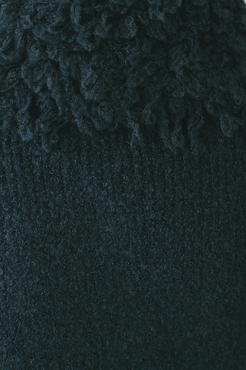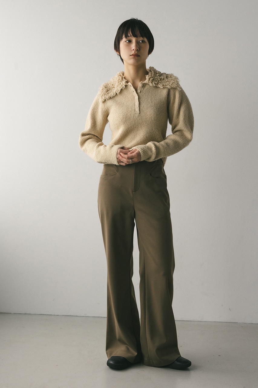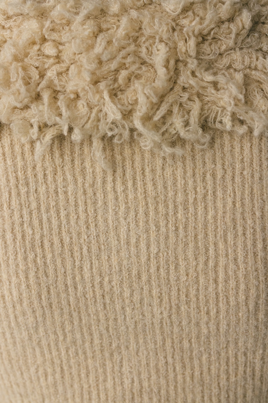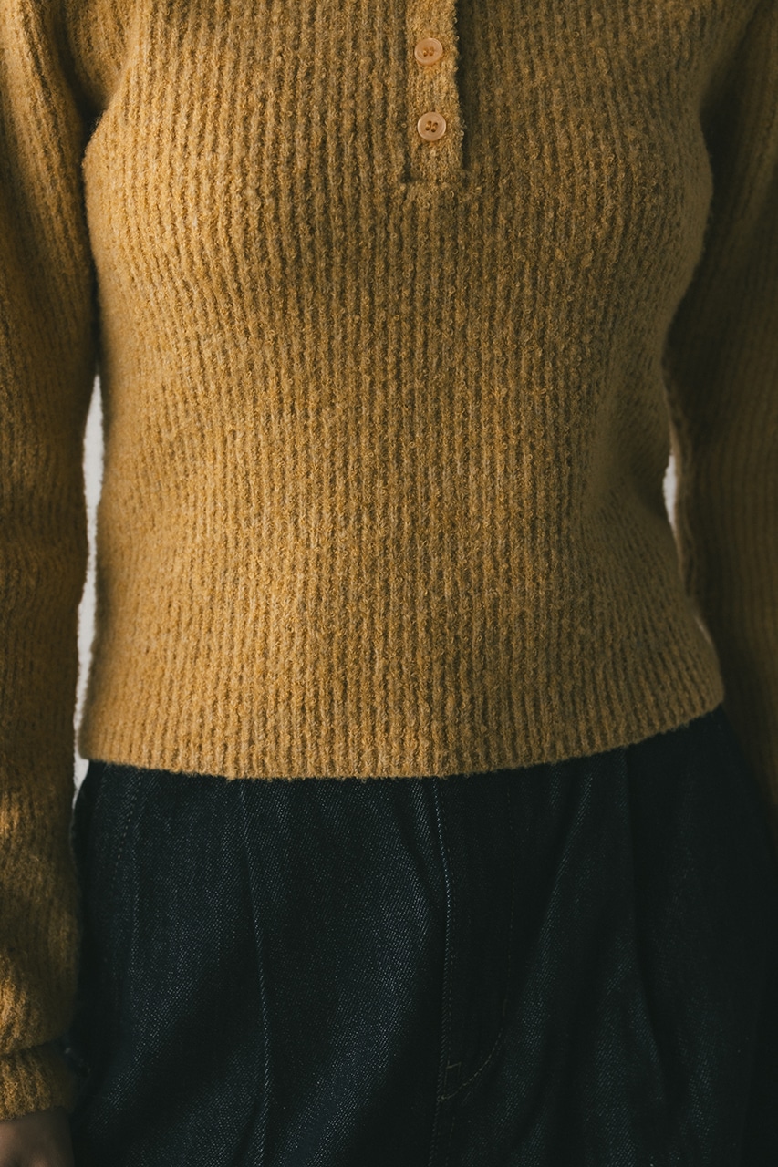 存在感とボリューム感のあるループ編みの襟が目をひく華やかなニット。肩山から肘あたりにかけてフォルムスリーブになっており、モードの雰囲気を与えつつ、二の腕カバーもかなう一枚。見頃はリブですっきりと仕上げ、メリハリのあるニットに仕上げました。ジャケットやアウターの上から襟だけ出したスタイリングもおすすめです。透け感なし、ストレッチあり。