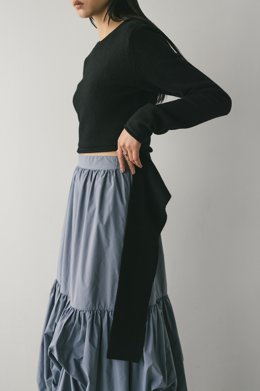 ウエストマークできるデザインがポイントのショート丈のコンパクトニット。ドッキングされているウエスト紐はルーズに片結びして垂らしたスタイリングがおすすめ。前後2WAY仕様で気分によって前で結んだり後ろで結ぶことも可能。もちっとしたソフトタッチな糸を使用して編み立てており、肌触りが良いのもポイントです。ストレッチあり、透け感なし。