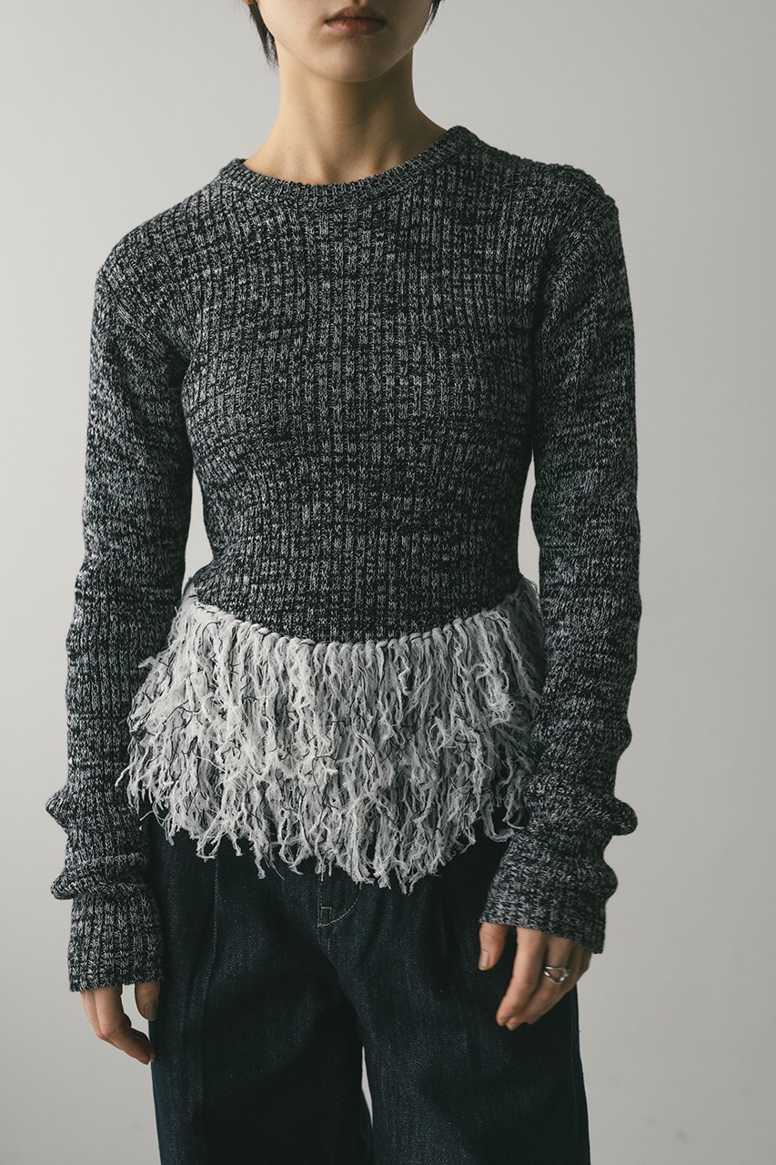 裾にチュール糸をたっぷりとあしらったアイキャッチーなフリンジペプラムニット。見頃と袖はリブですっきりとコンパクトに仕上げることで裾の甘さとメリハリをつけ、モード×フェミニンをかけあわせたトレンド感あふれる一枚に仕上げました。IVOY、GRYは単色糸を使用、柄BLKは黒と白のミックス糸を使用。存在感のあるスタイリングが完成します。ストレッチあり、透け感なし。