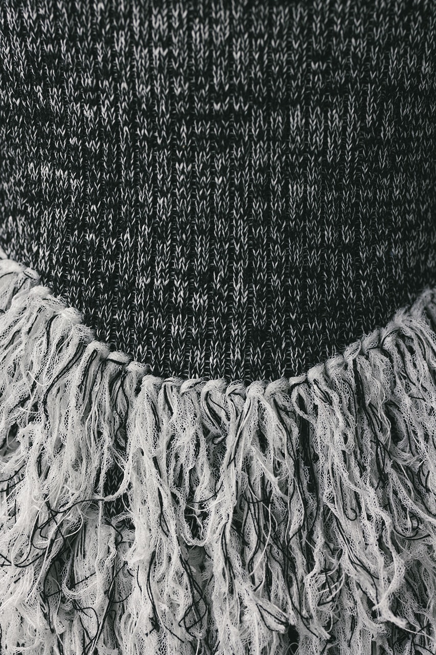 裾にチュール糸をたっぷりとあしらったアイキャッチーなフリンジペプラムニット。見頃と袖はリブですっきりとコンパクトに仕上げることで裾の甘さとメリハリをつけ、モード×フェミニンをかけあわせたトレンド感あふれる一枚に仕上げました。IVOY、GRYは単色糸を使用、柄BLKは黒と白のミックス糸を使用。存在感のあるスタイリングが完成します。ストレッチあり、透け感なし。
