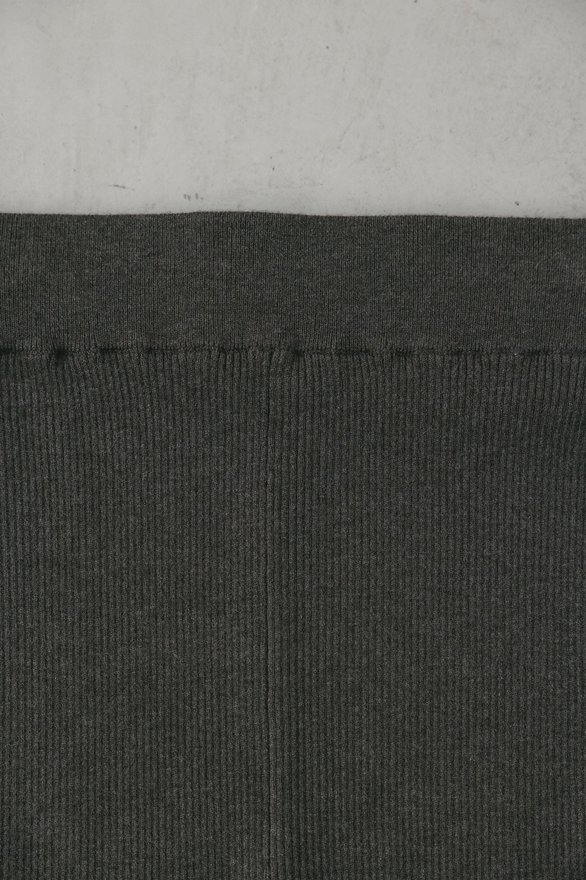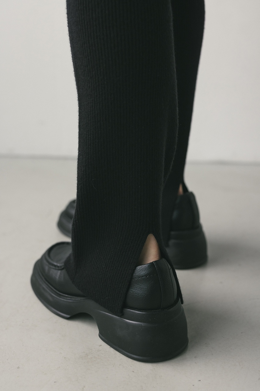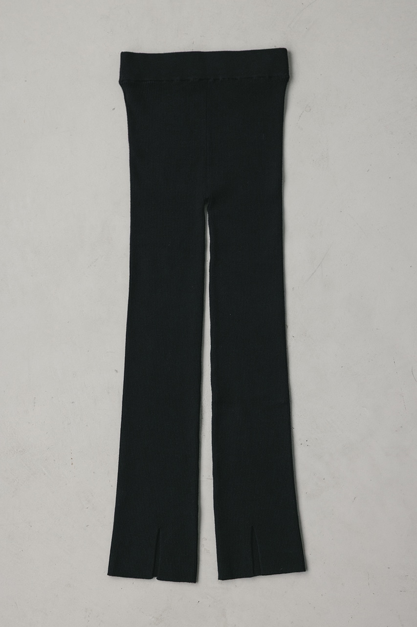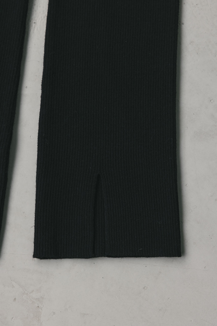 バックスリットがポイントのリブニットレギンス。キックバックが良く、暖かみを感じる滑らかな肌触りの糸を使用しているので着心地の良い一枚です。あえて長め丈に仕上げていて、シューズの上にレギンスを被せたりスリットからシューズをのぞかしたスタイリングがおすすめです。ストレッチあり、透け感なし。