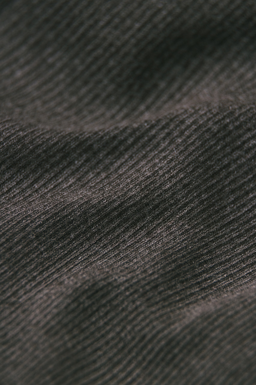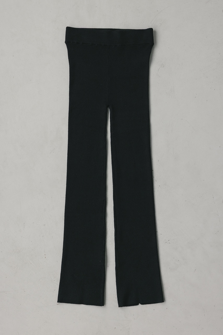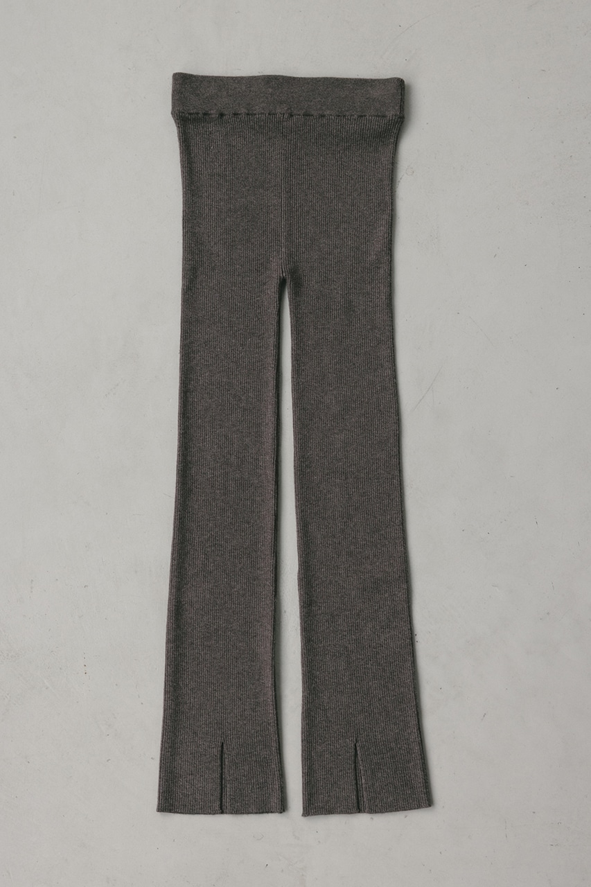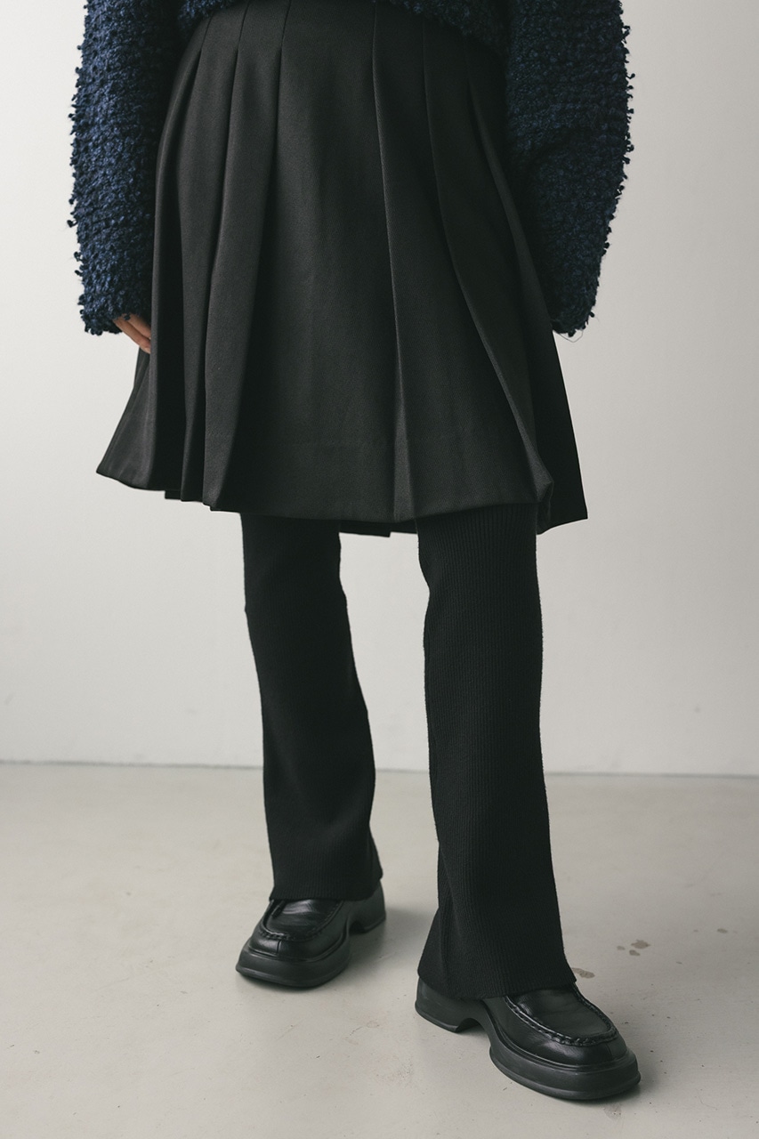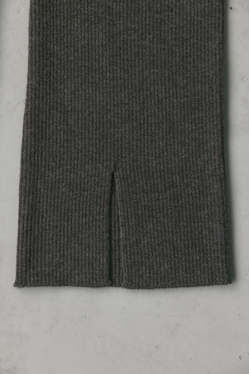 バックスリットがポイントのリブニットレギンス。キックバックが良く、暖かみを感じる滑らかな肌触りの糸を使用しているので着心地の良い一枚です。あえて長め丈に仕上げていて、シューズの上にレギンスを被せたりスリットからシューズをのぞかしたスタイリングがおすすめです。ストレッチあり、透け感なし。