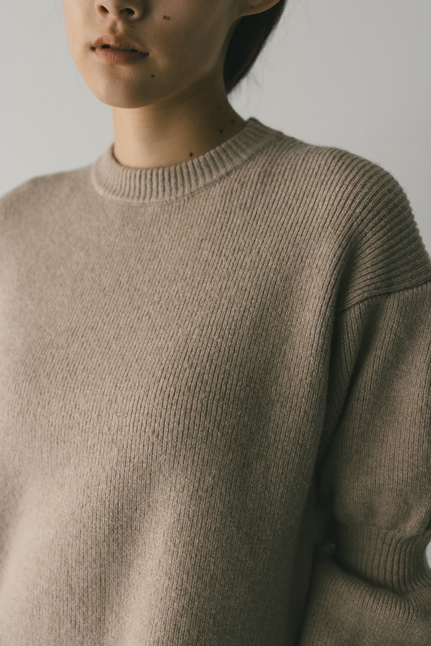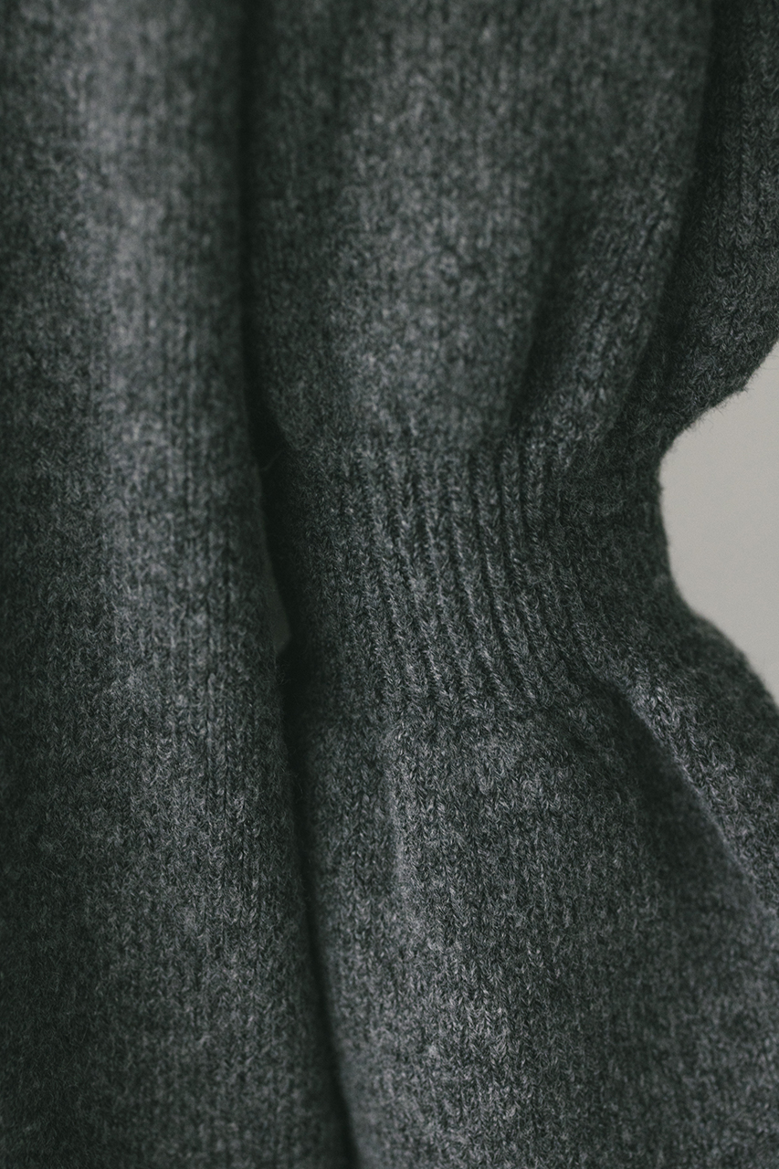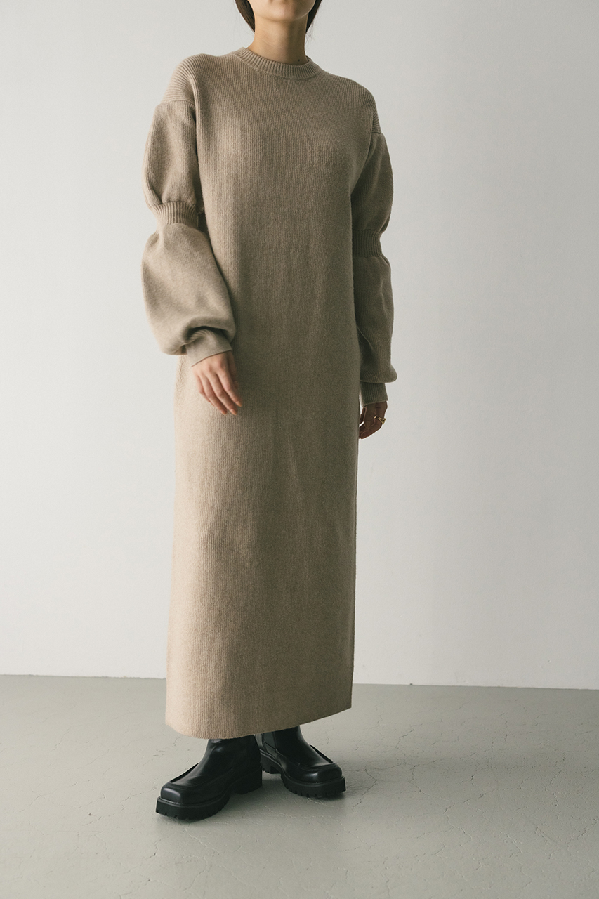 キャンディーのようにパフっとした袖がポイントのニットワンピース。身頃は片畦で編みたてることで、しっかりとした厚みがある身体のラインを拾いにくい仕様に仕上げました。あえて身頃はストレートシルエット、ロング丈にすることで、甘さの中にもスタミキらしいモードな雰囲気をプラスしています。透け感なし、ストレッチあり。