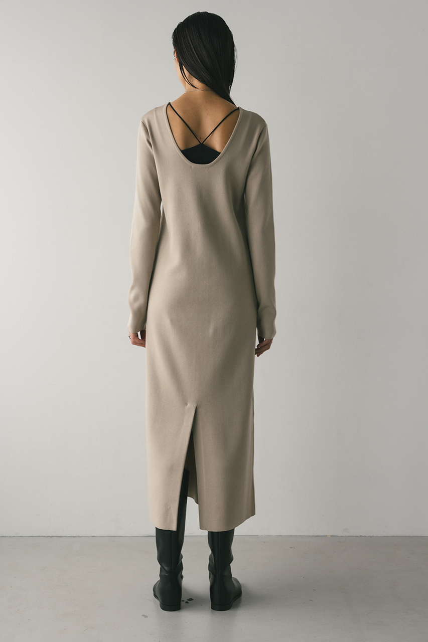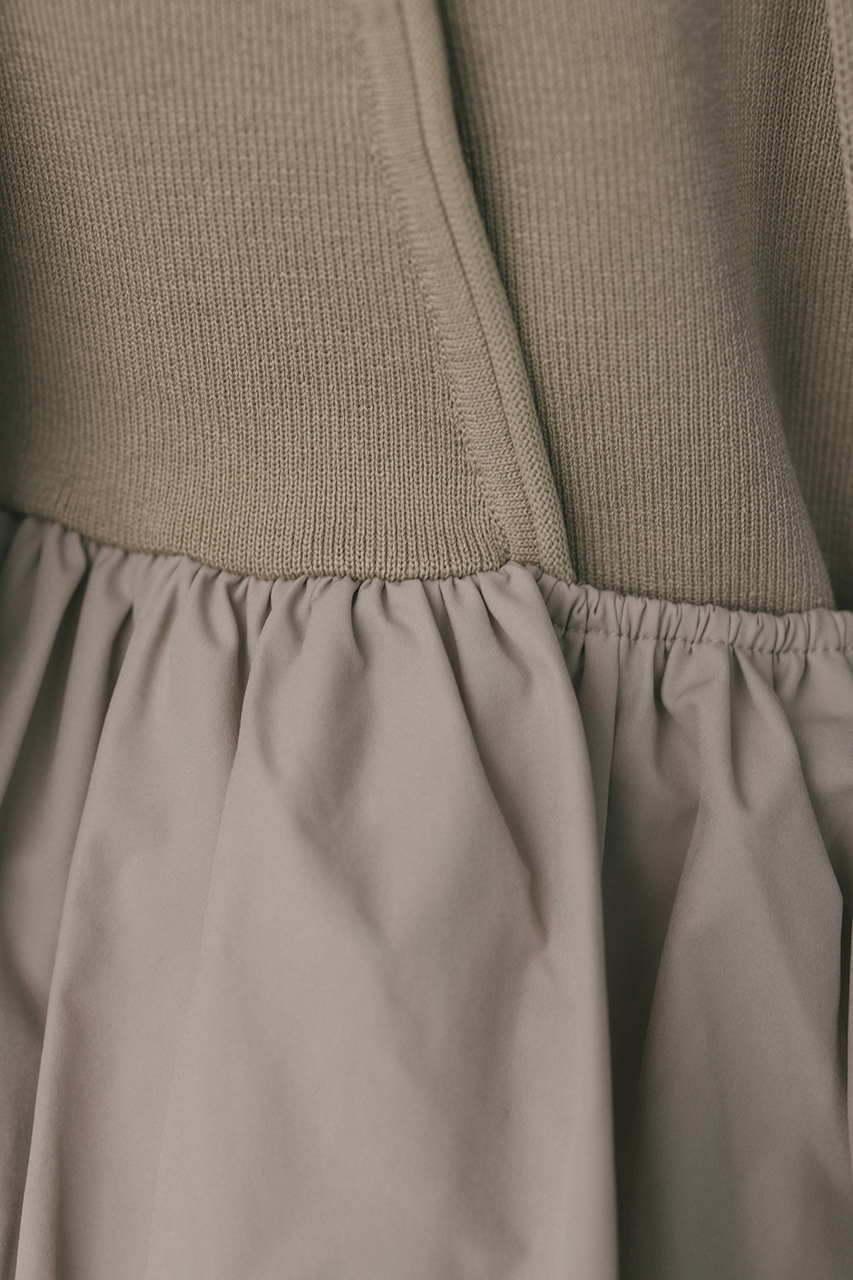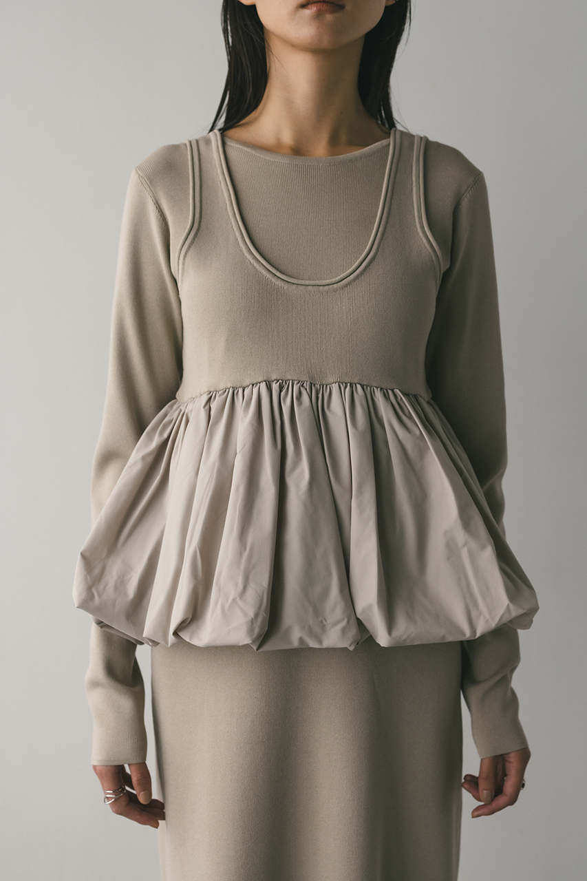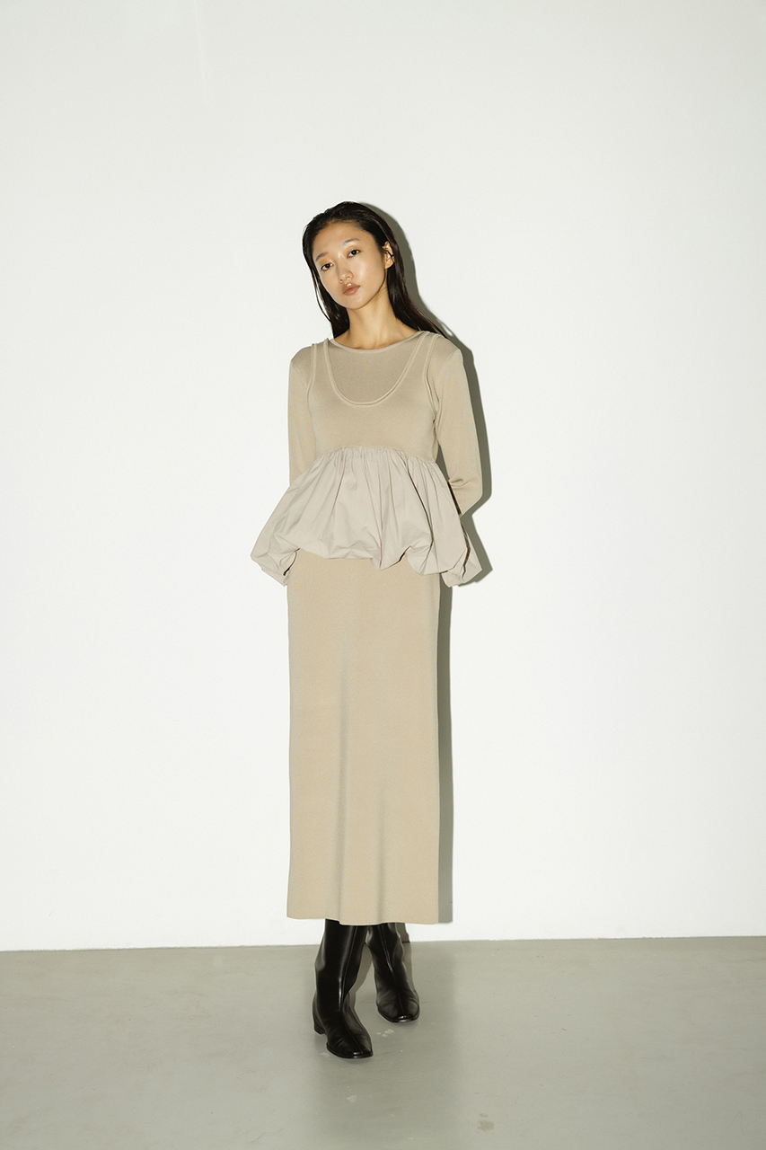 バルーンペプラムベストとナローシルエットのワンピースのセットアイテム。上品なハイゲージニットにハリ感のある布帛素材をドッキングしたベスト。たっぷりとギャザーを寄せてボリュームを出した美しいバルーンシルエットがポイント。バックスタイルが楽しめる共紐付き。ワンピースは後ろ下がりが深めにあいたデザインがポイント。裾はスリット入りなので、ナローシルエットでも歩きやすく仕上げました。ストレッチあり、透け感なし。