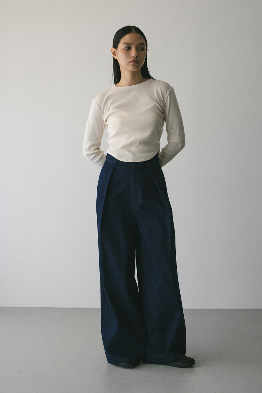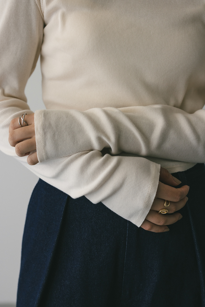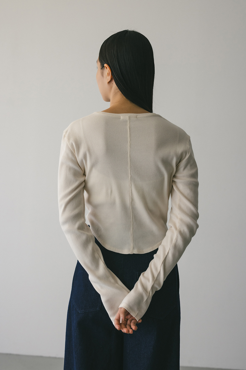 クリアで上品な印象の生地を使用したコンパクトなサイズ感で着回しやすいリブロンT。大きくラウンドしたヘムデザインがポイントでウエストをよりきれいに見せてくれる一枚。脇はぎを前に倒してサイドのもたつきをなくし、ショルダーハギは後ろに倒すことでショルダーラインをすっきり見せてくれます。ストレッチあり、透け感WHTややあり。