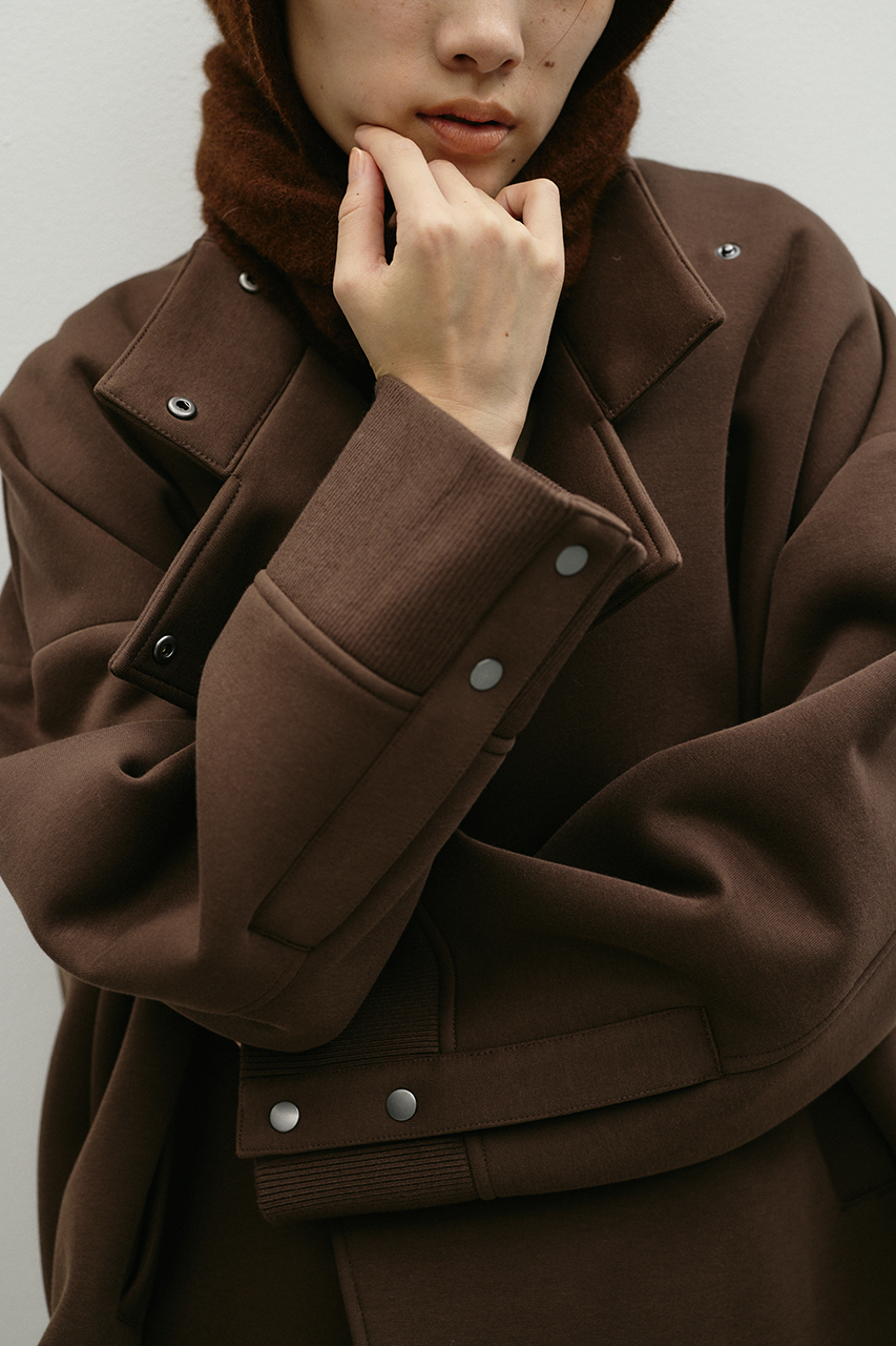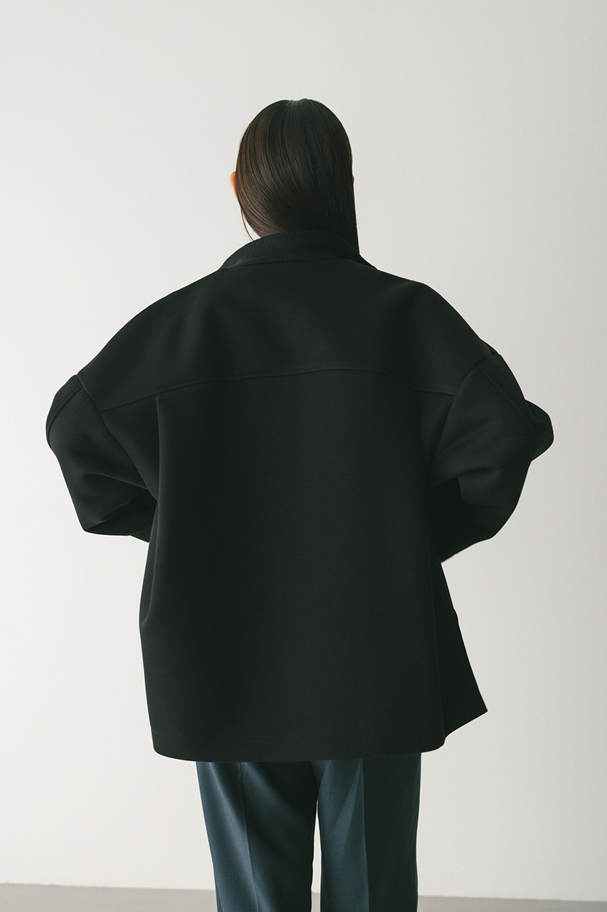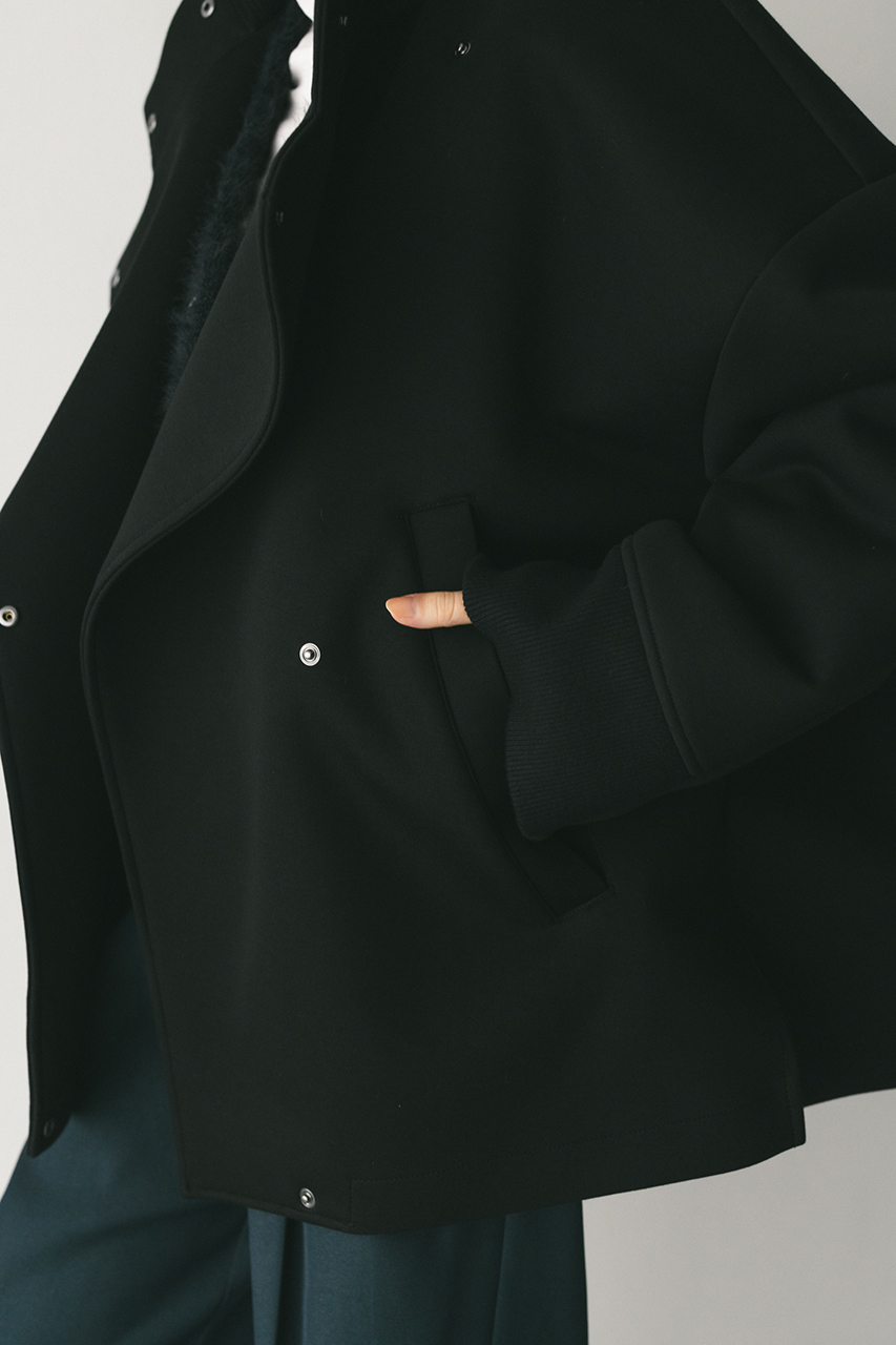 カット素材と布帛素材をボンディングしたハリのあるボリューム感がモードで上品見えするミドル丈のジャケットコート。トレンドのボンディング素材を使用することで、独特のハリ感を保ち、ボディラインを拾いにくいシルエットに仕上げた一枚。程よく厚みのある立体的なフォルムながらも、保温性もあり中にしっかり着込めるオーバーサイズがポイントです。開けて着ていただくと大きめな襟元が顔周りを華やかに見せてくれます。袖のボリューム感と、襟元と袖口のリブ素材で大人カジュアルなこなれた印象に導きます。サイドポケット付き。ストレッチなし、透け感なし。