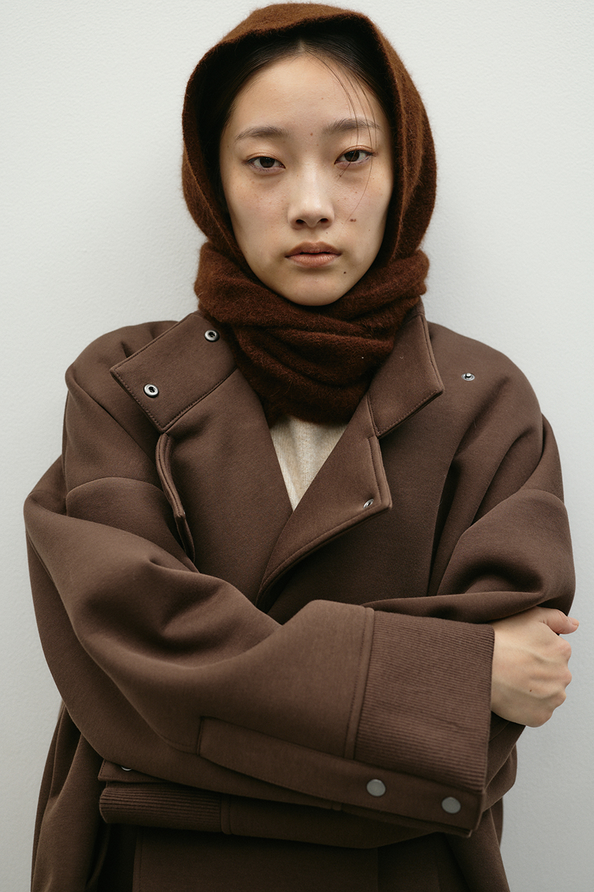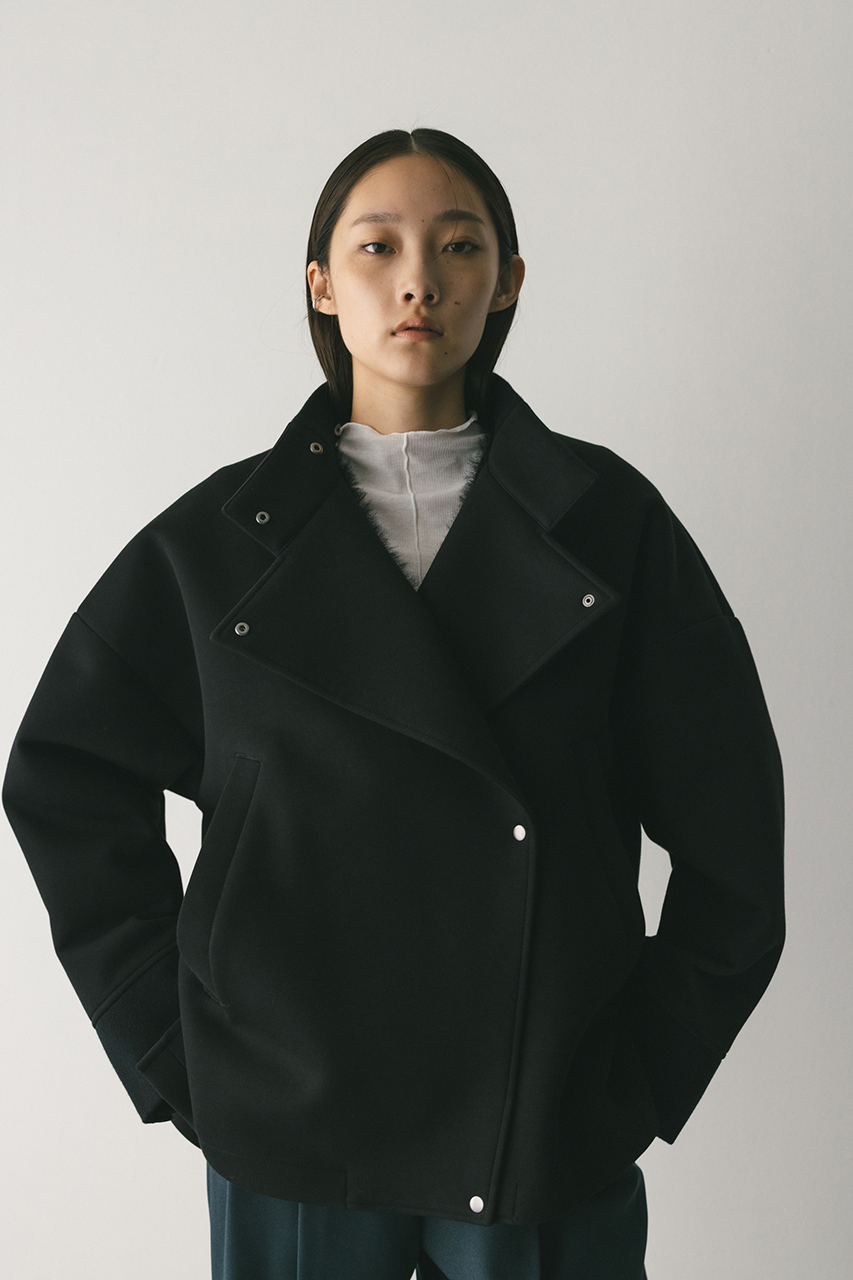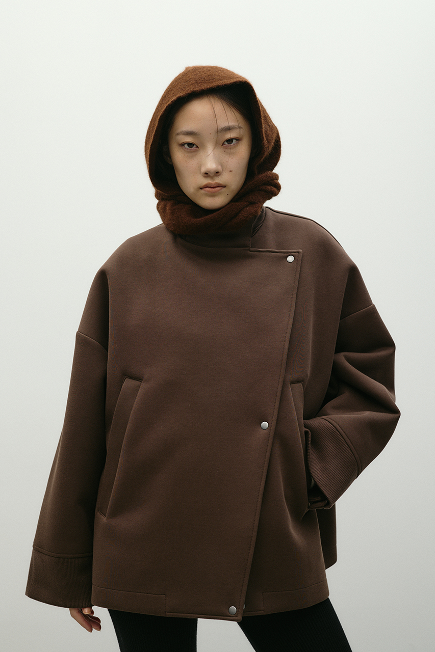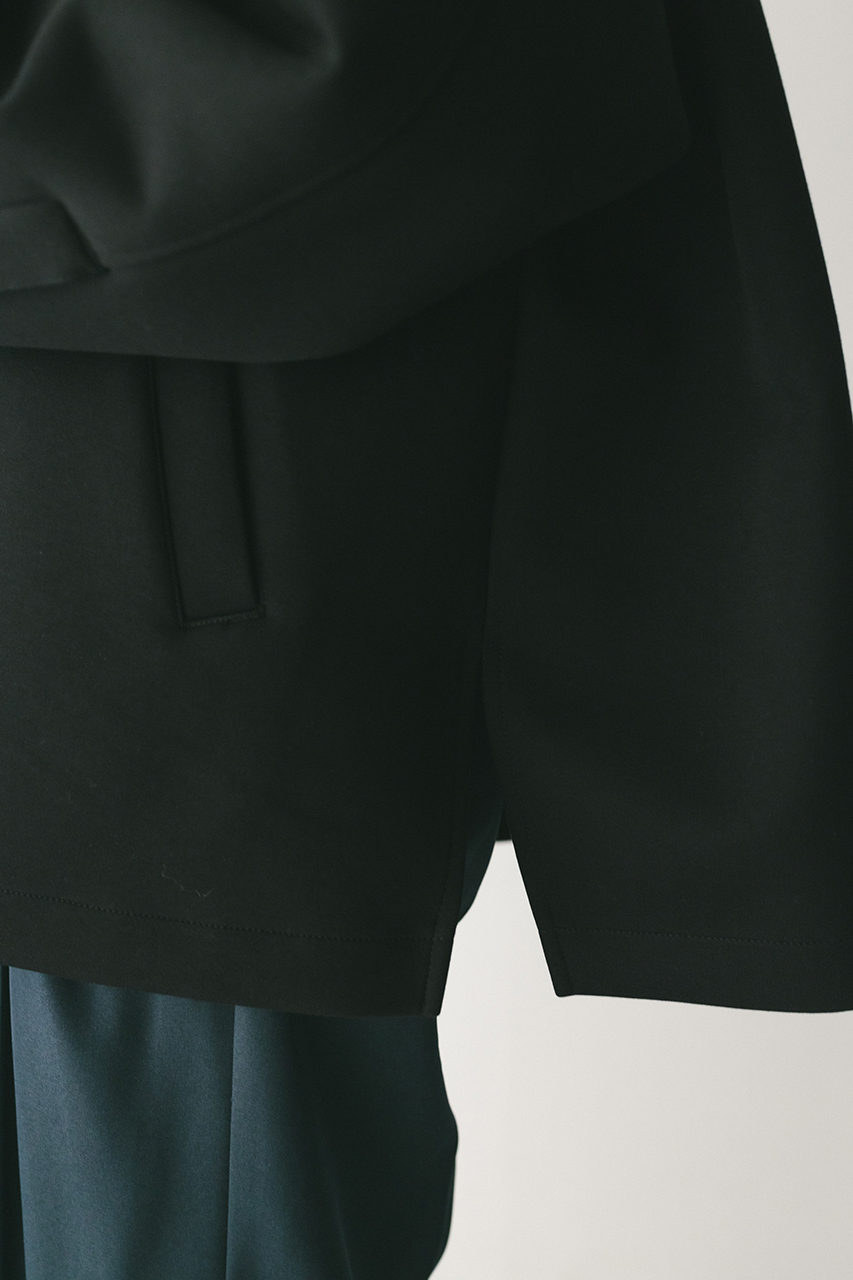 カット素材と布帛素材をボンディングしたハリのあるボリューム感がモードで上品見えするミドル丈のジャケットコート。トレンドのボンディング素材を使用することで、独特のハリ感を保ち、ボディラインを拾いにくいシルエットに仕上げた一枚。程よく厚みのある立体的なフォルムながらも、保温性もあり中にしっかり着込めるオーバーサイズがポイントです。開けて着ていただくと大きめな襟元が顔周りを華やかに見せてくれます。袖のボリューム感と、襟元と袖口のリブ素材で大人カジュアルなこなれた印象に導きます。サイドポケット付き。ストレッチなし、透け感なし。
