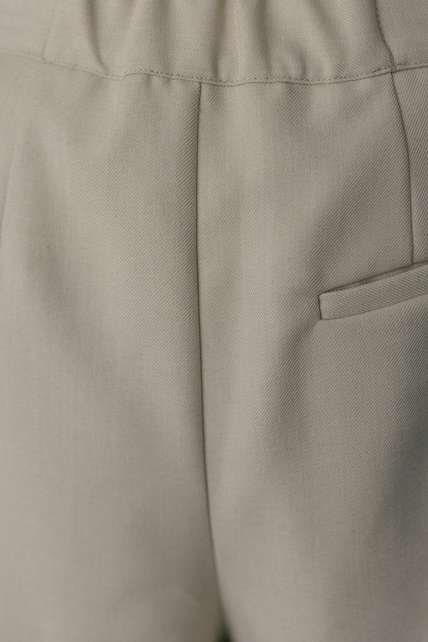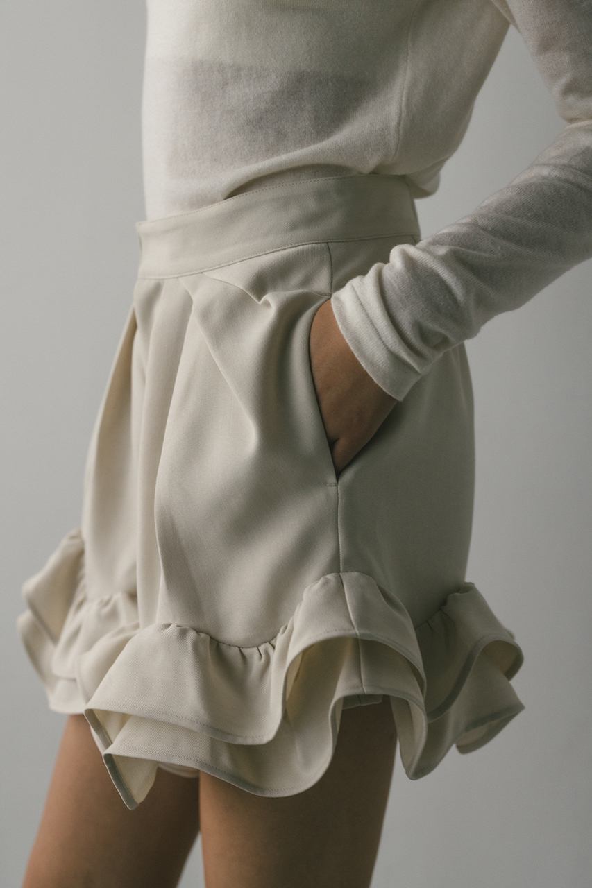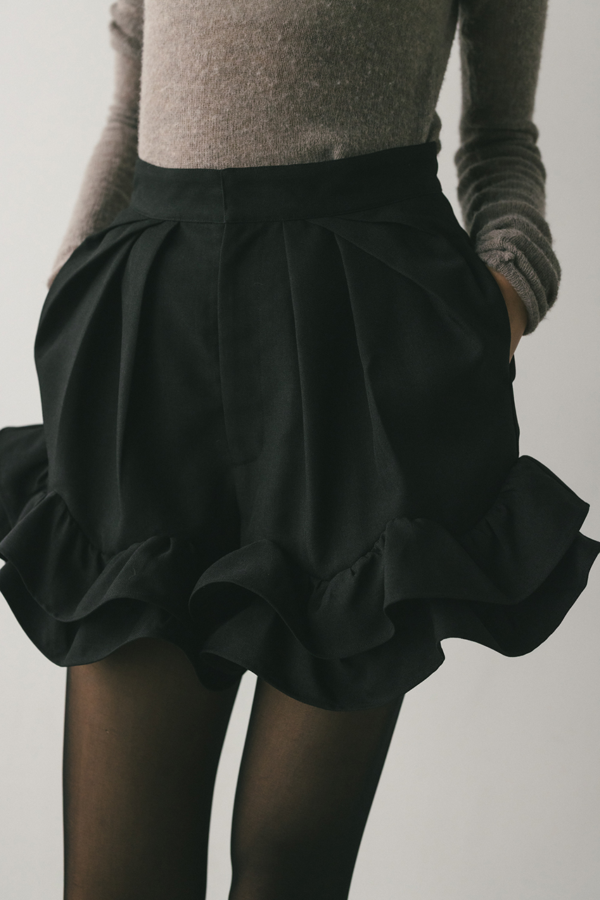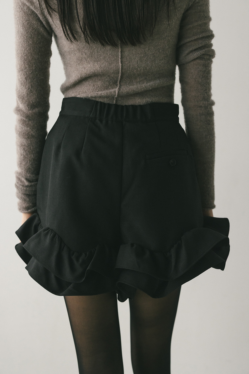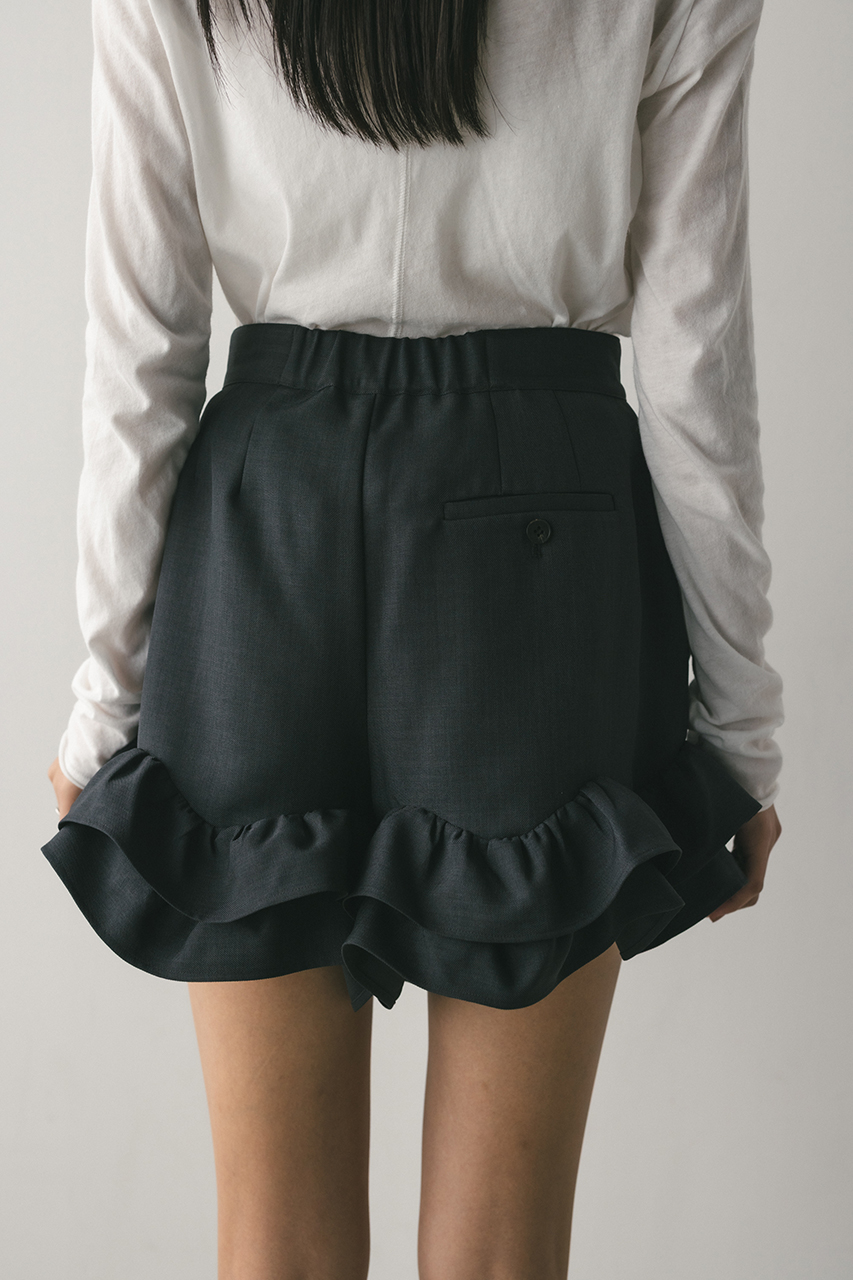 立体的な裾フリルがコーデのアクセントになるスタイルアップが叶うショートパンツ。ガーリー感強めでありながらもボリューム感サイズ感にプラスして落ち着いた色味と素材で大人っぽさを演出。ウエストは少し落として履いていただくと抜け感のあるコーデが完成します。インスタイルはもちろんですが、オーバーサイズのトップスと合わせて裾をチラッと見せるコーデもおすすめです。ストレッチなし、透け感なし。
