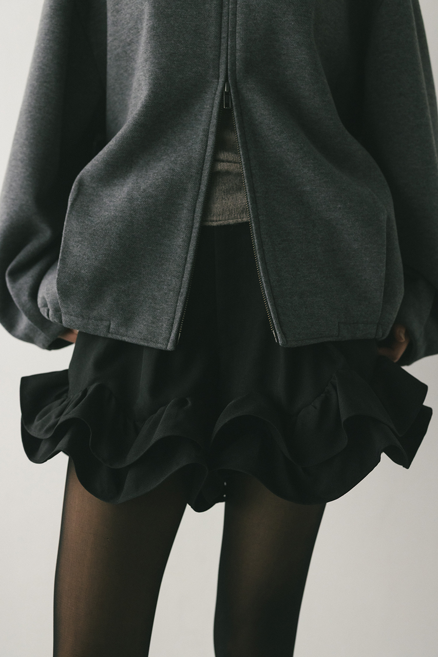 立体的な裾フリルがコーデのアクセントになるスタイルアップが叶うショートパンツ。ガーリー感強めでありながらもボリューム感サイズ感にプラスして落ち着いた色味と素材で大人っぽさを演出。ウエストは少し落として履いていただくと抜け感のあるコーデが完成します。インスタイルはもちろんですが、オーバーサイズのトップスと合わせて裾をチラッと見せるコーデもおすすめです。ストレッチなし、透け感なし。