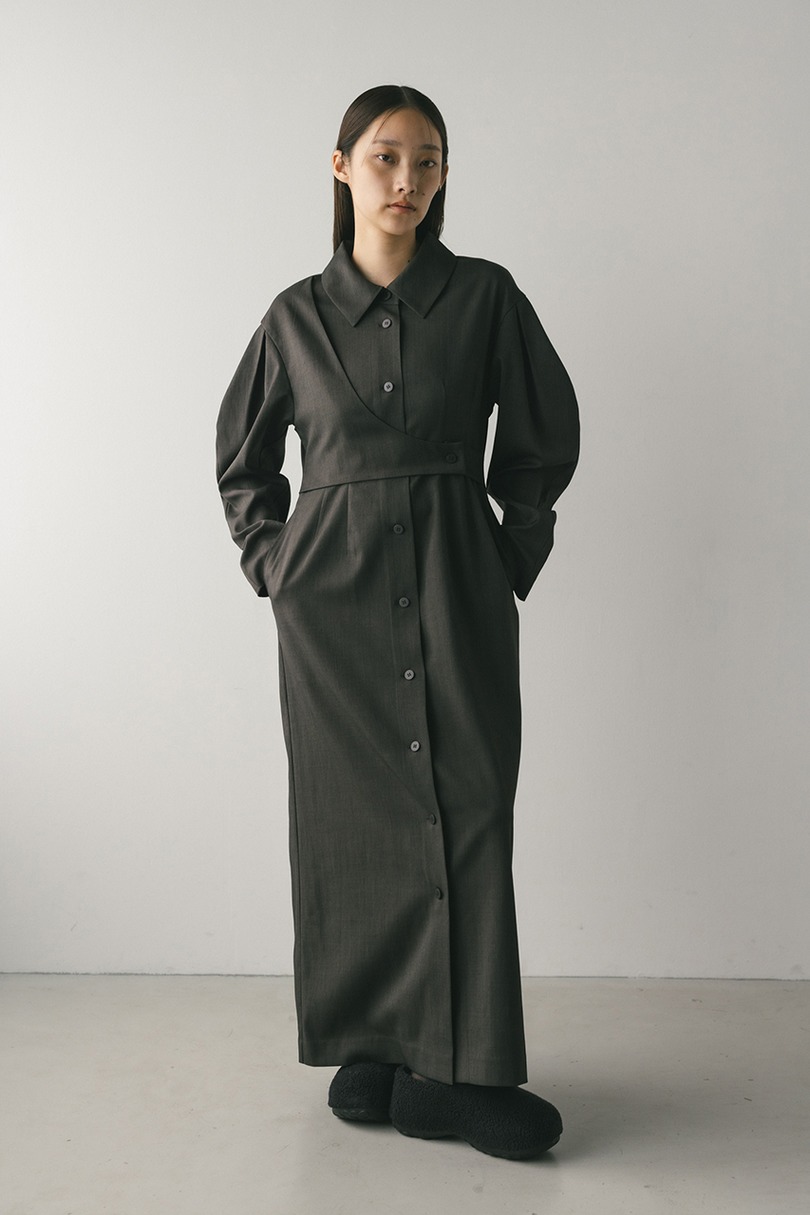 シャツワンピースにアシンメトリーのデザインビスチェをレイヤードしたようなモードな印象のワンピース。ドロップした肩とボリューム袖が全体のバランスをとりスタイルアップに見せてくれます。スタイリッシュで大人の印象のワンピースです。ストレッチなし、透け感なし。