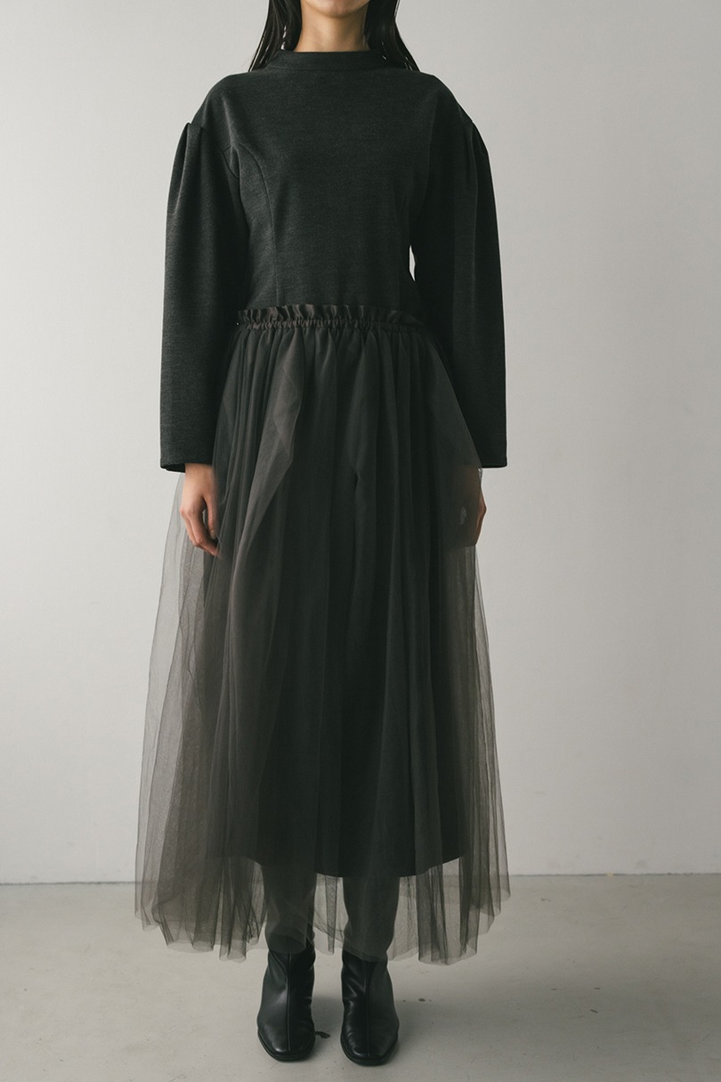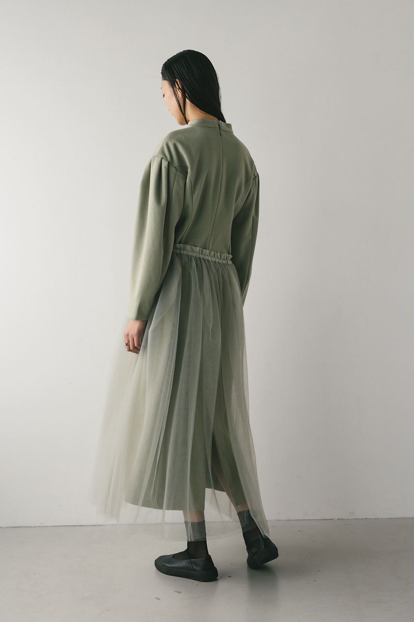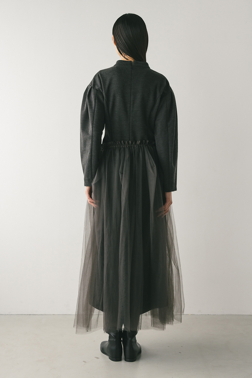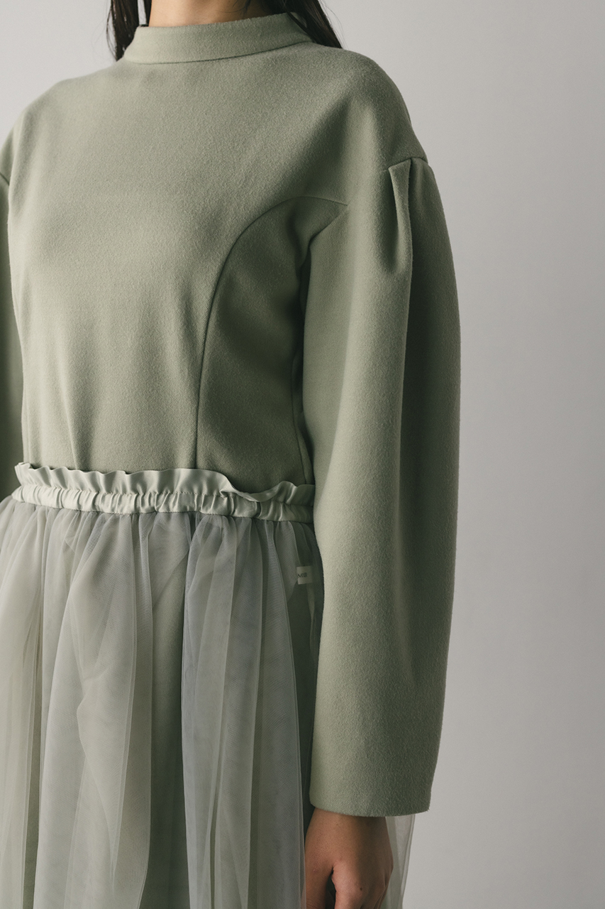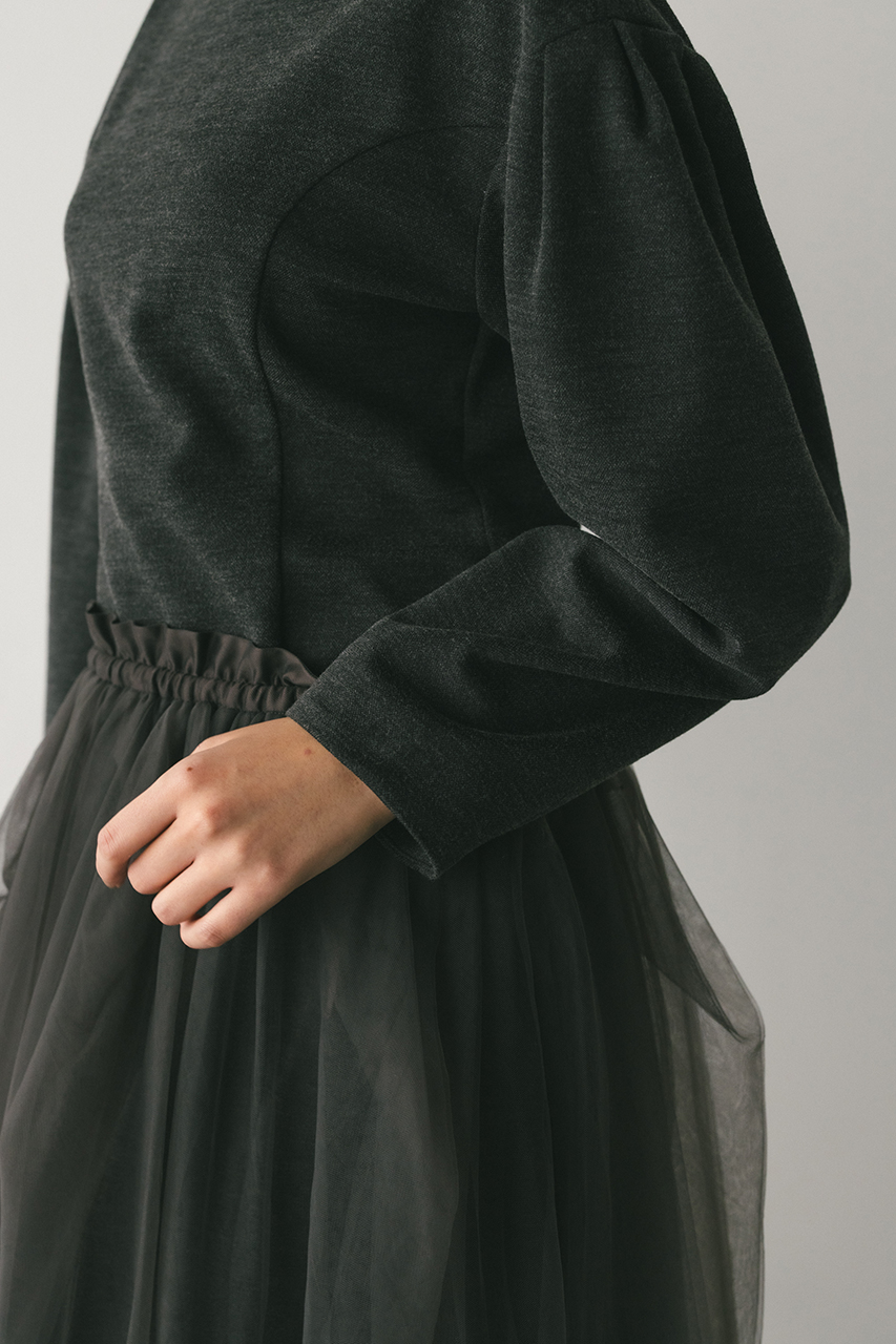 袖の丸みのある立体感とウエストタックが身体のラインをすっきりと見せてくれるエレガントな印象のワンピース。身体のラインを拾わない程よく厚みと膨らみと温かみのあるジャージ素材を使用。デイリーシーンではもちろん、オケージョンのシーンでも着用いただけます。500IAB31-4231(チュールレイヤードスカート)とセットアップ着用可能。ストレッチあり、透け感なし。