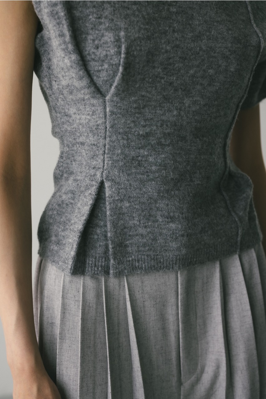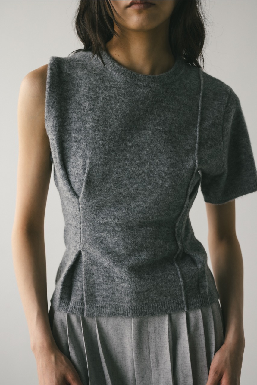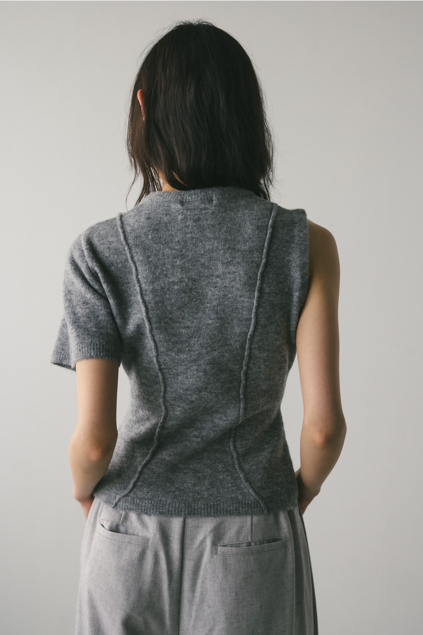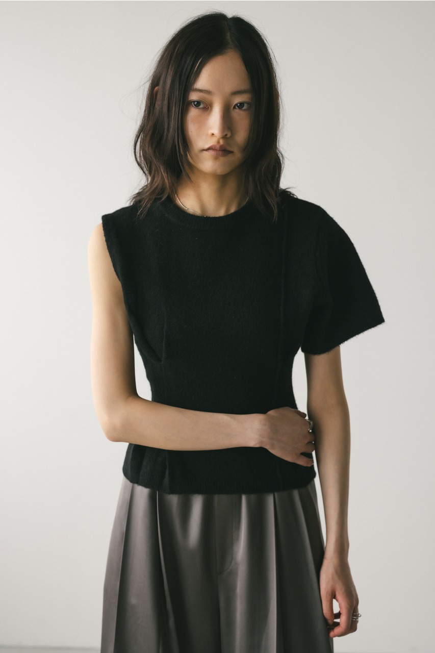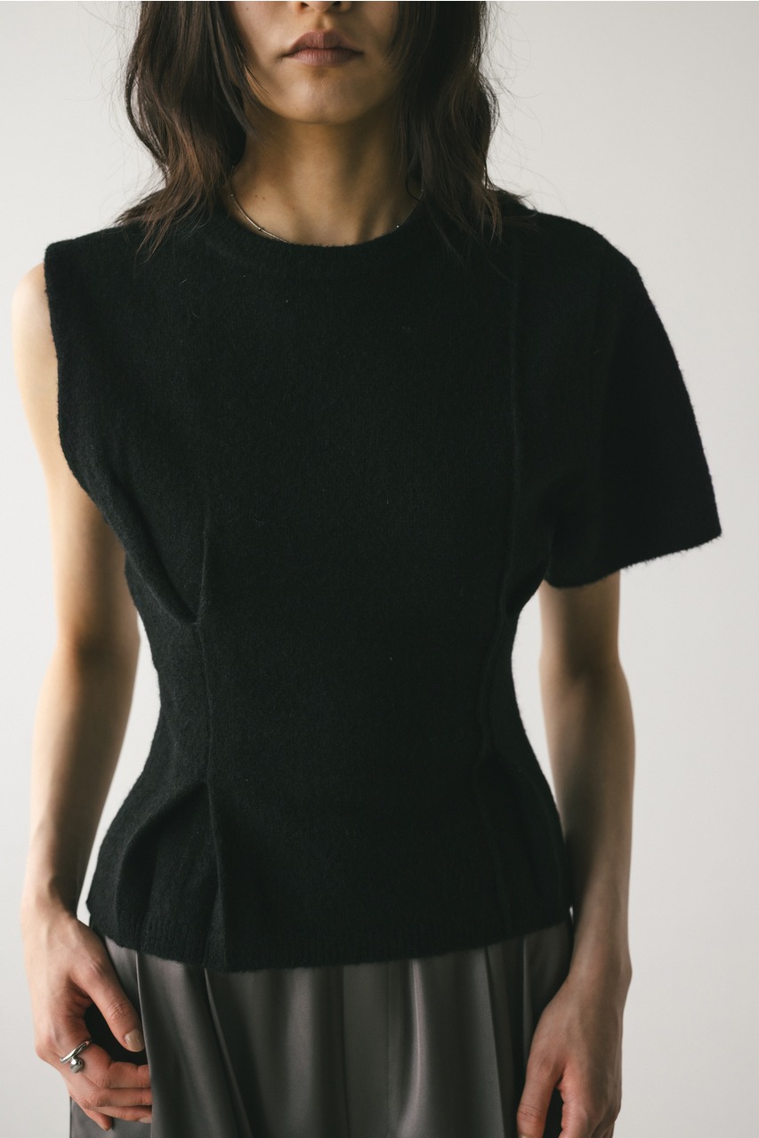 アシンメトリーデザインがモダンな温かみのあるニット素材で仕上げたデザイントップ。レイヤード使いもできるのでベストとしても着用頂けます。ストレッチあり、透け感なし。