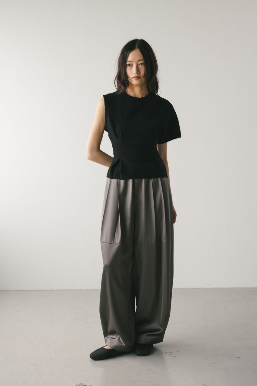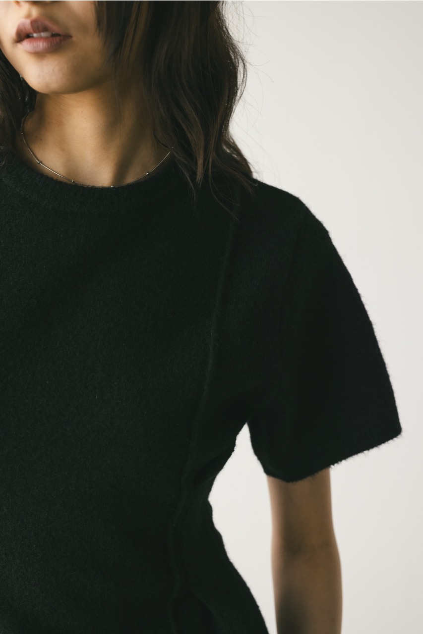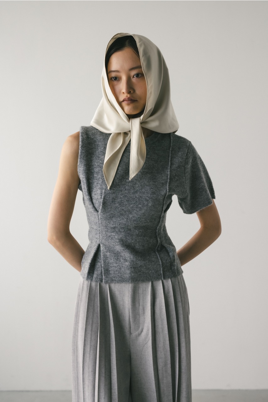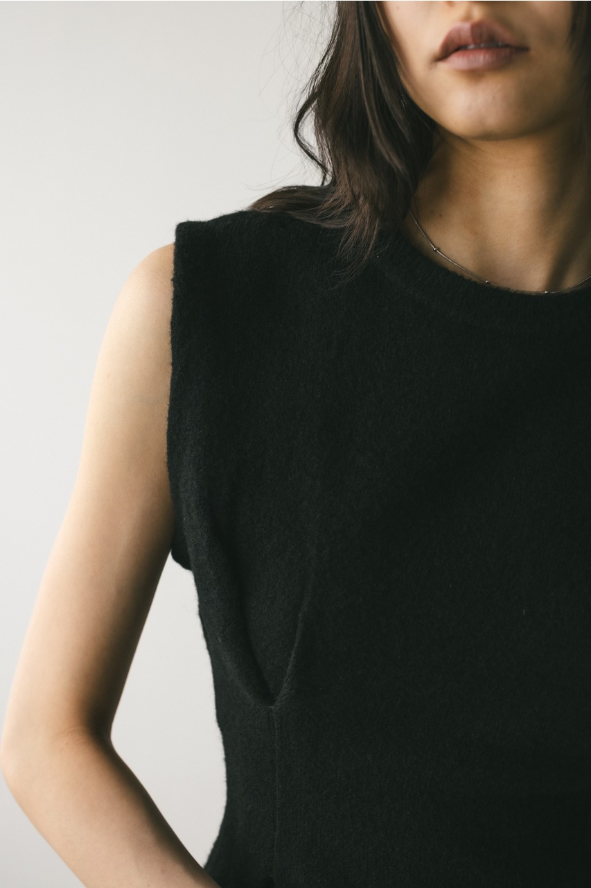 アシンメトリーデザインがモダンな温かみのあるニット素材で仕上げたデザイントップ。レイヤード使いもできるのでベストとしても着用頂けます。ストレッチあり、透け感なし。