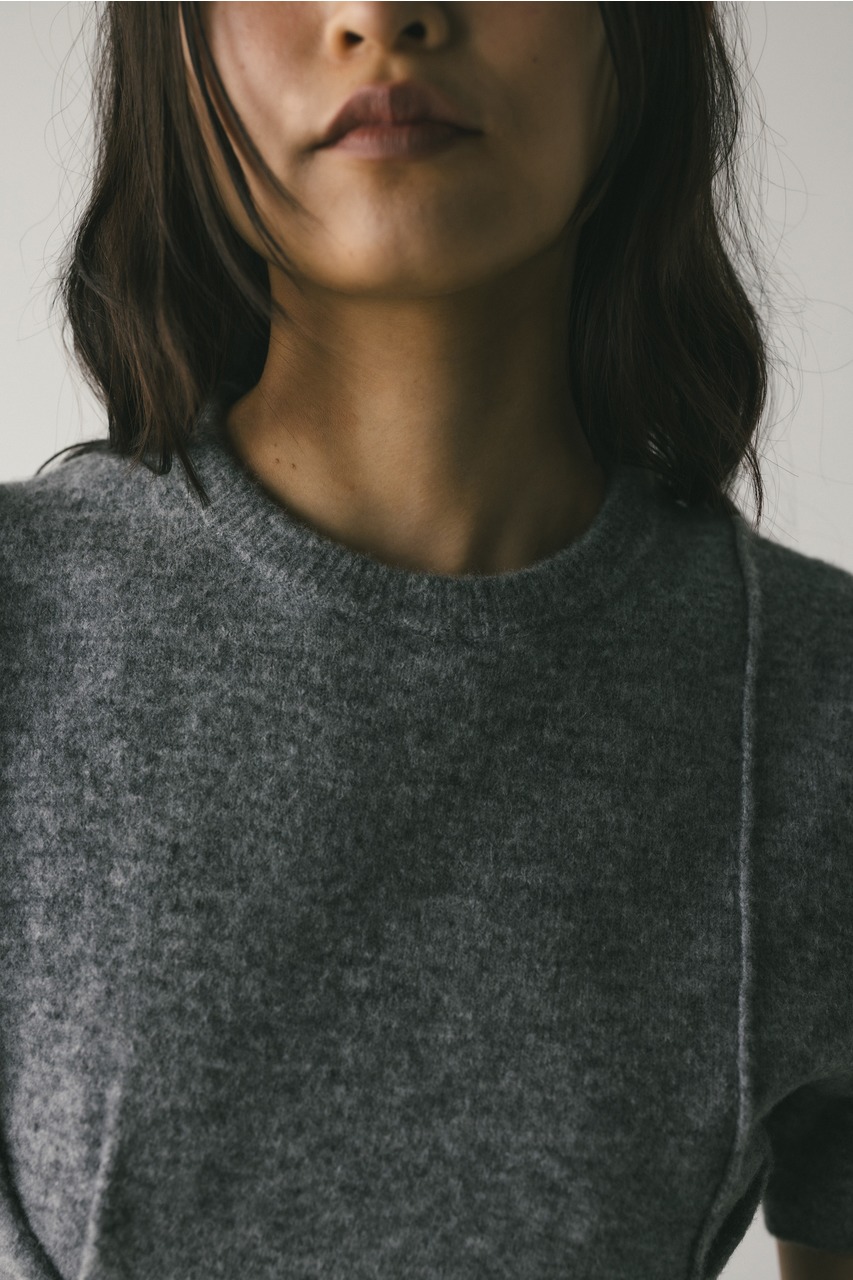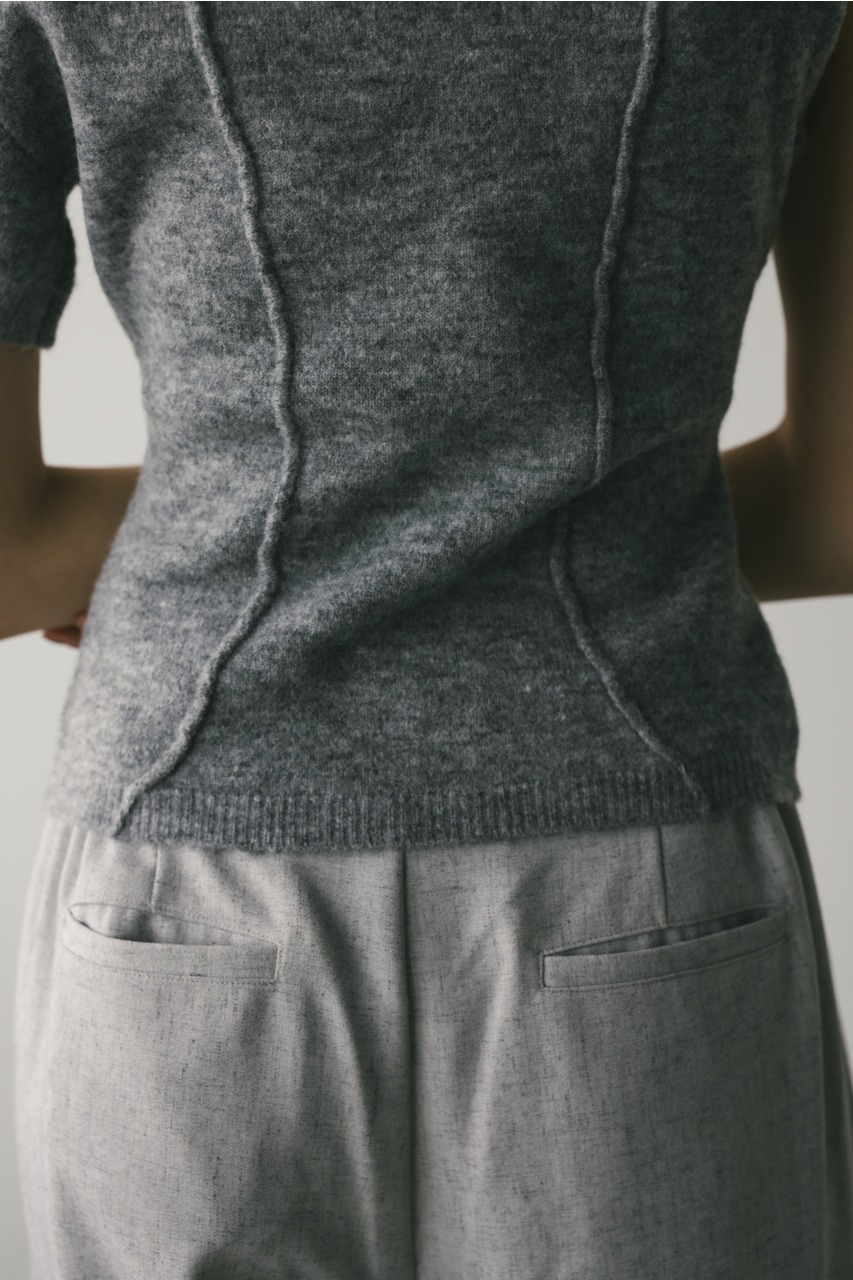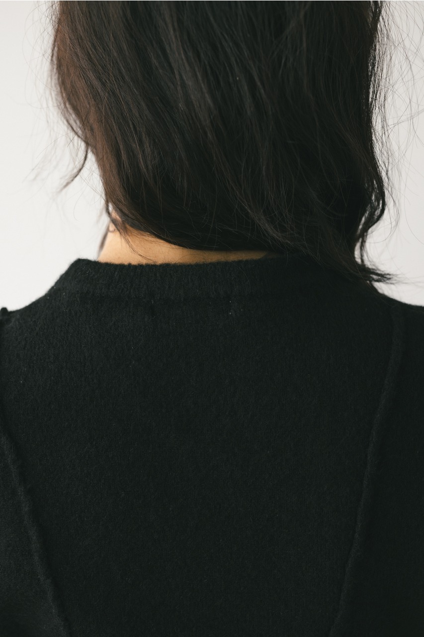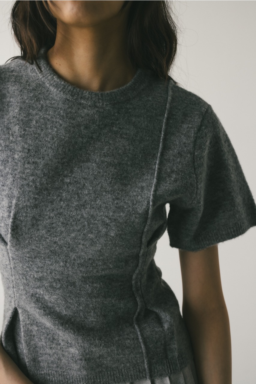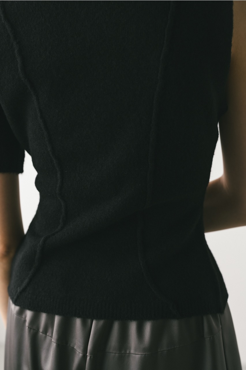 アシンメトリーデザインがモダンな温かみのあるニット素材で仕上げたデザイントップ。レイヤード使いもできるのでベストとしても着用頂けます。ストレッチあり、透け感なし。