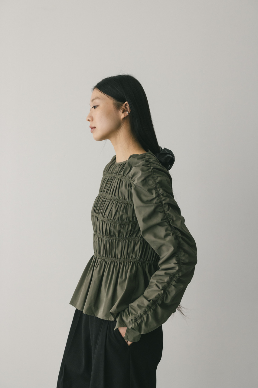 全体にシャーリングを施し、フィット感と華やかな表情を両立したブラウス。裾はペプラム仕様になっており、自然な広がりがスタイルに女性らしいメリハリをプラスします。袖にはギャザーを入れて立体感を出し、動きに合わせて柔らかな陰影を演出。デイリーからお出かけまで活躍する、存在感のある一枚です。パンツに合わせてすっきりと、スカートに合わせてフェミニンにと、幅広いスタイリングを楽しめます。ストレッチあり(シャーリング部分)、透け感なし。