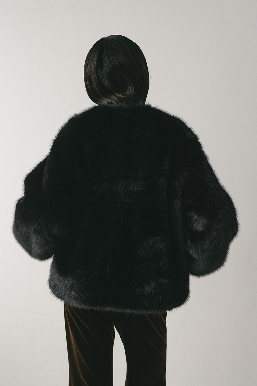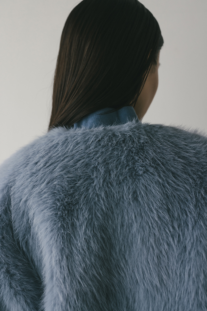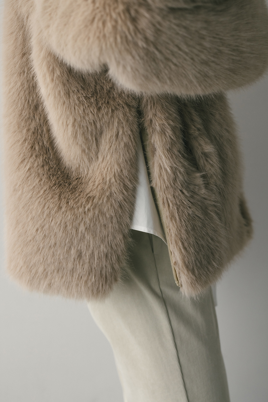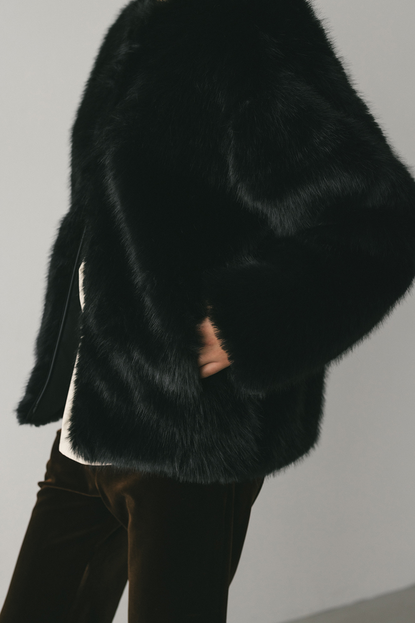 存在感のある毛足がかわいい上品なノーカラーファージャケット。ラフに羽織れるカーディガンタイプのルーズシルエットがポイント。肩接ぎを後ろに倒すことで肩が張って見えないように仕上げました。サイドにもファスナーを施しているのでレイヤードも楽しめるデザインジャケットです。フロント逆開ファスナー仕様。ストレッチなし、透け感なし。