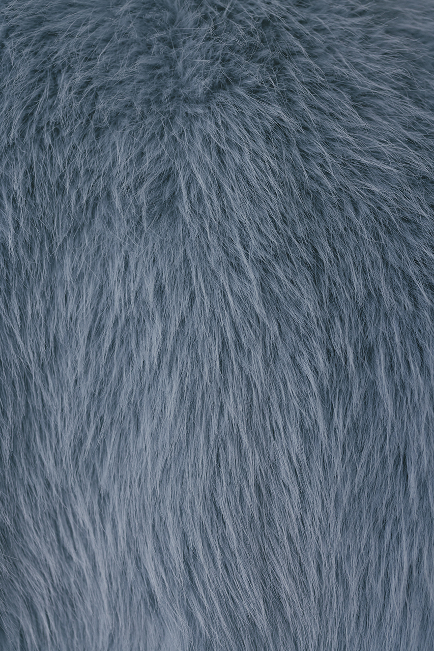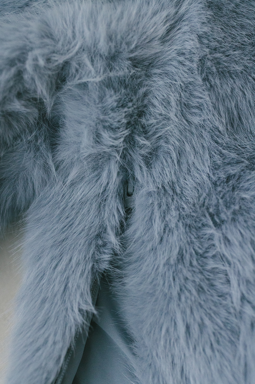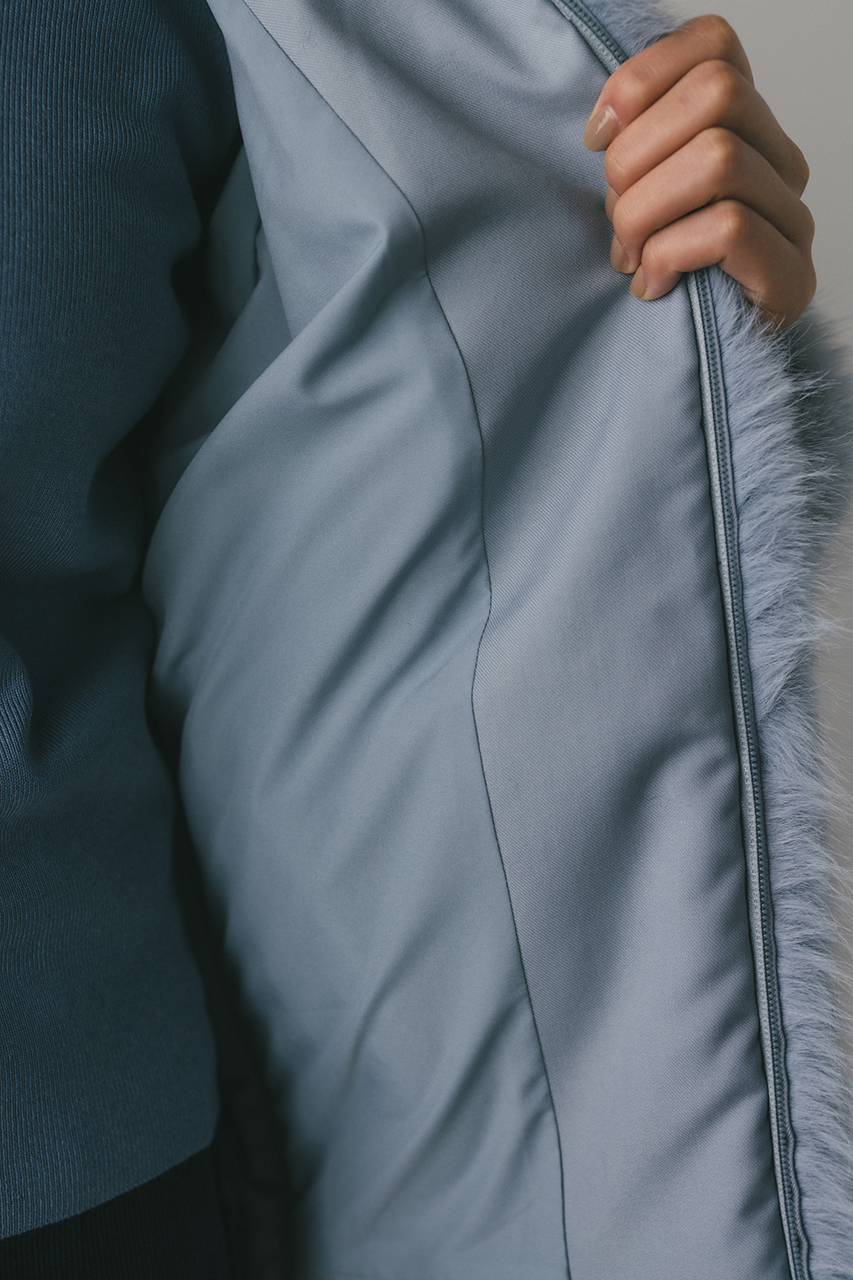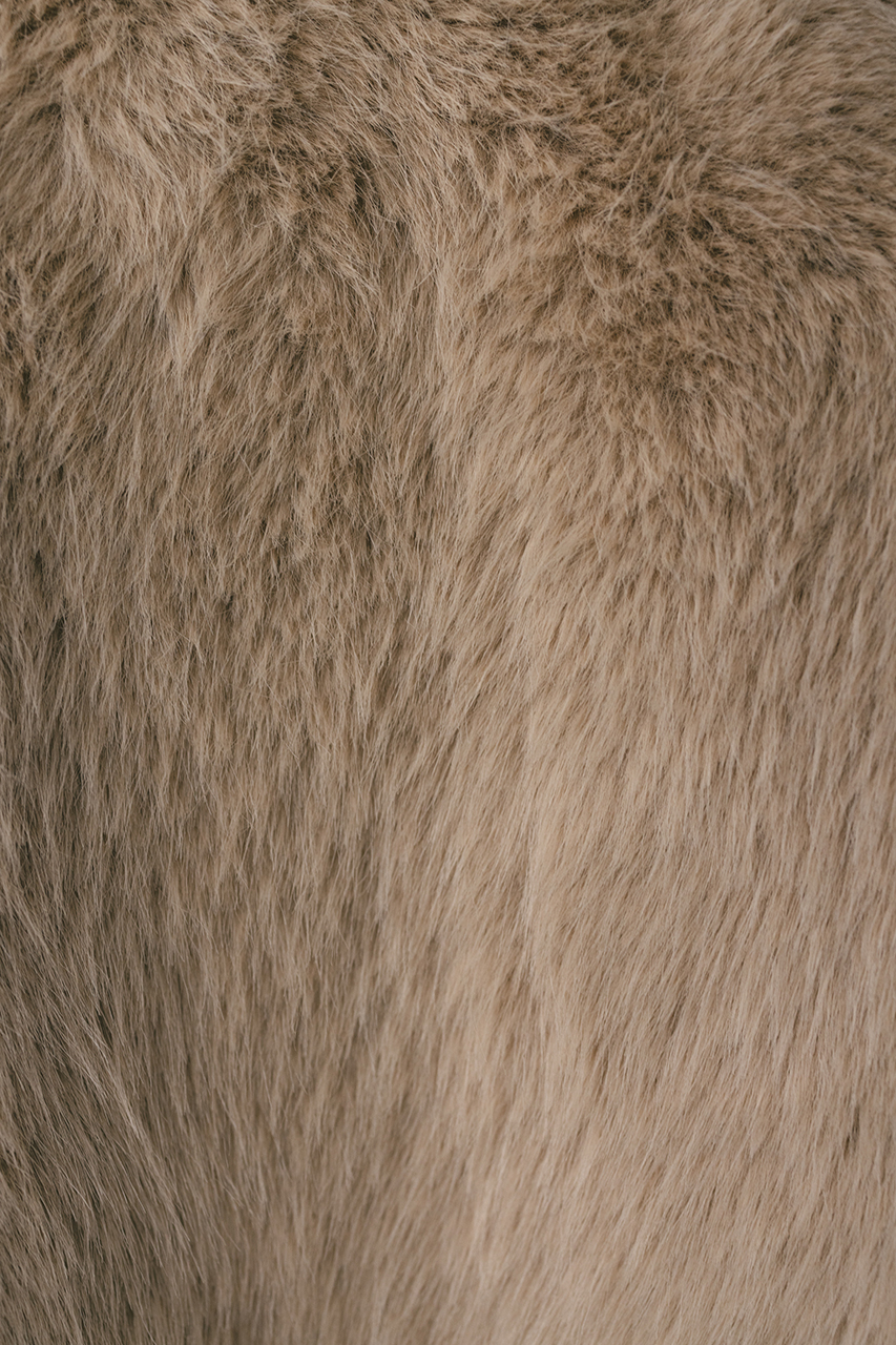 存在感のある毛足がかわいい上品なノーカラーファージャケット。ラフに羽織れるカーディガンタイプのルーズシルエットがポイント。肩接ぎを後ろに倒すことで肩が張って見えないように仕上げました。サイドにもファスナーを施しているのでレイヤードも楽しめるデザインジャケットです。フロント逆開ファスナー仕様。ストレッチなし、透け感なし。