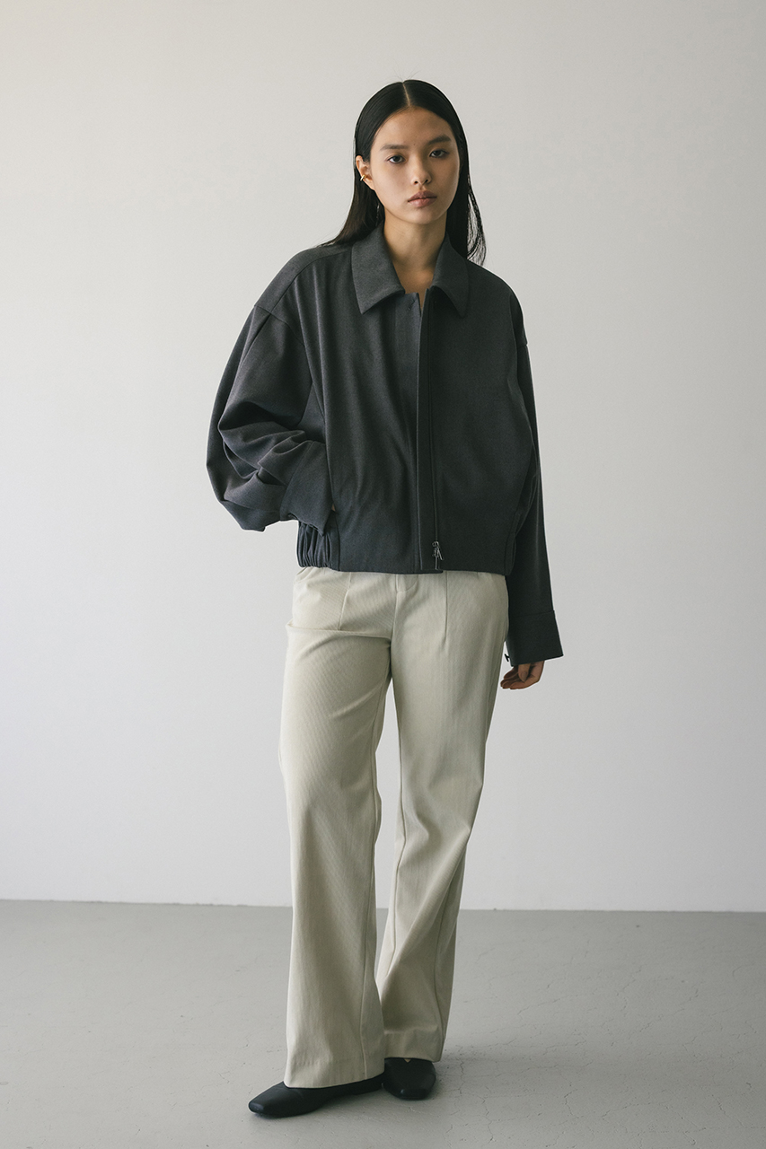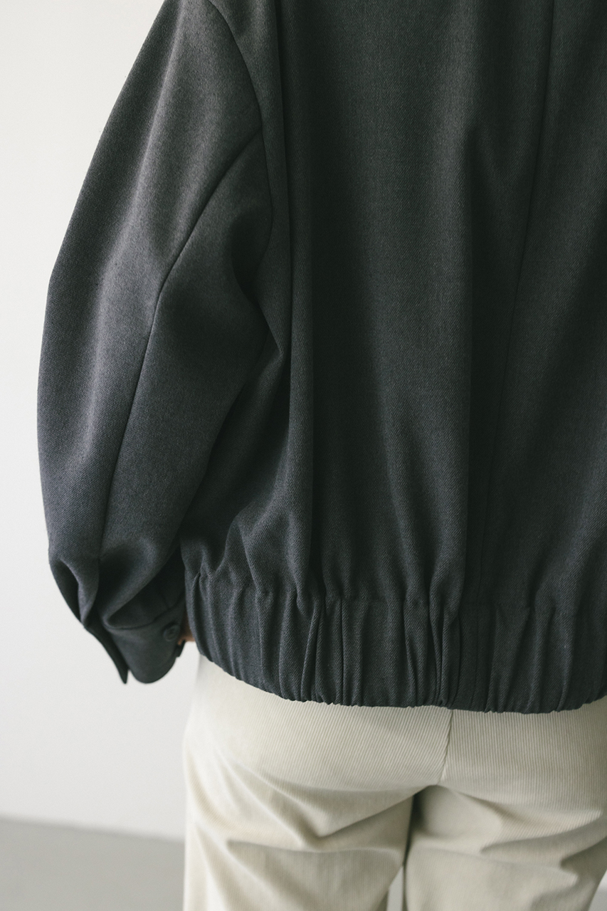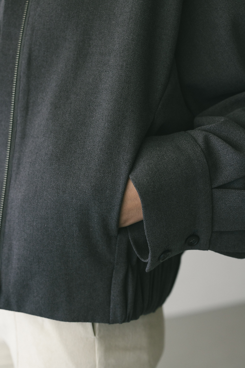 抜け感のある裾ゴムデザインと袖タックワイドスリーブがポイントのミディアム丈のブルゾン。逆開ファスナーでスタイリングしやすく、様々なスタイリングに馴染むアウター。ロングシーズン着用頂ける一重仕立てで仕上げました。袖口は調整可能。500IAS31-1171(フォルムショートパンツ)とセットアップ着用可能。透け感なし、ストレッチややあり。