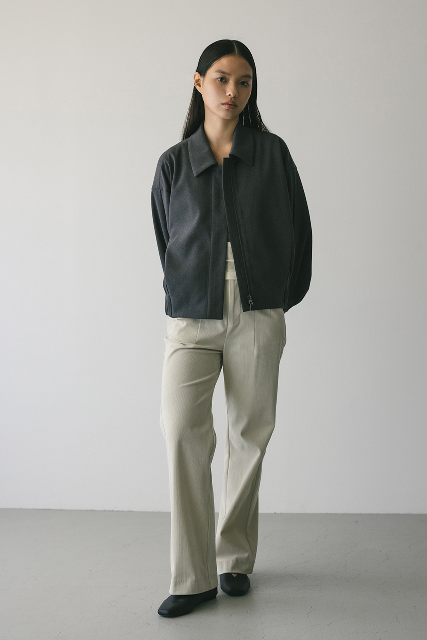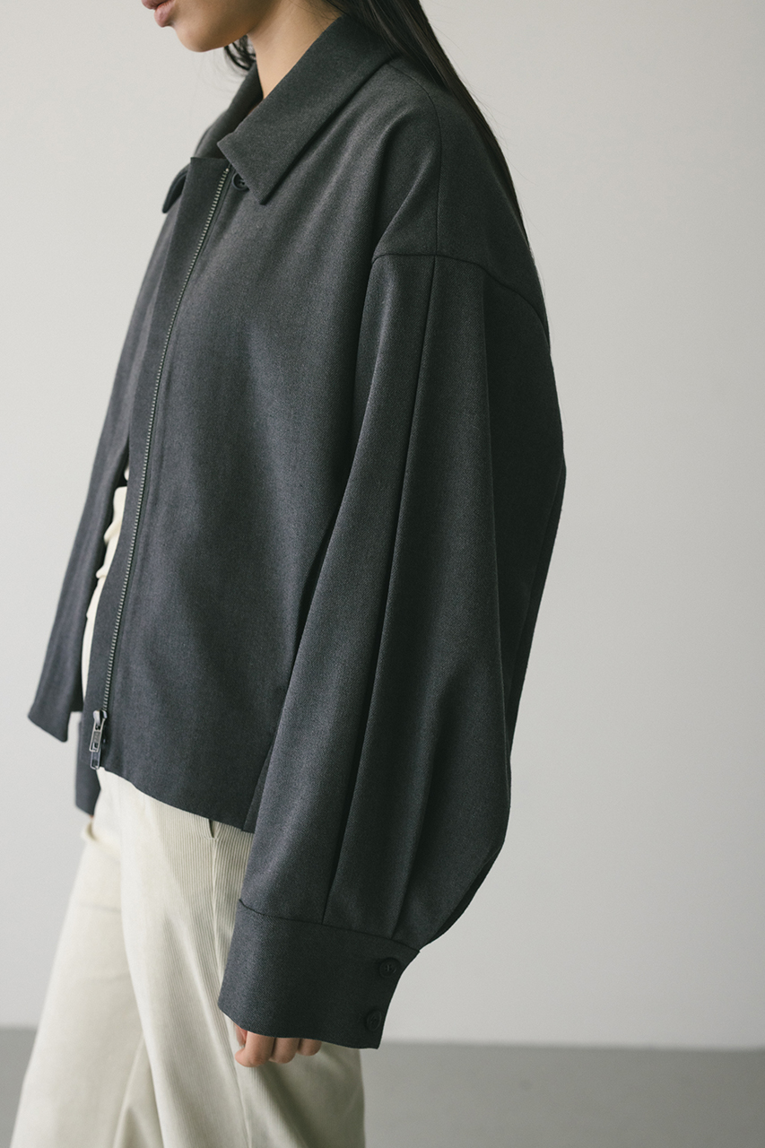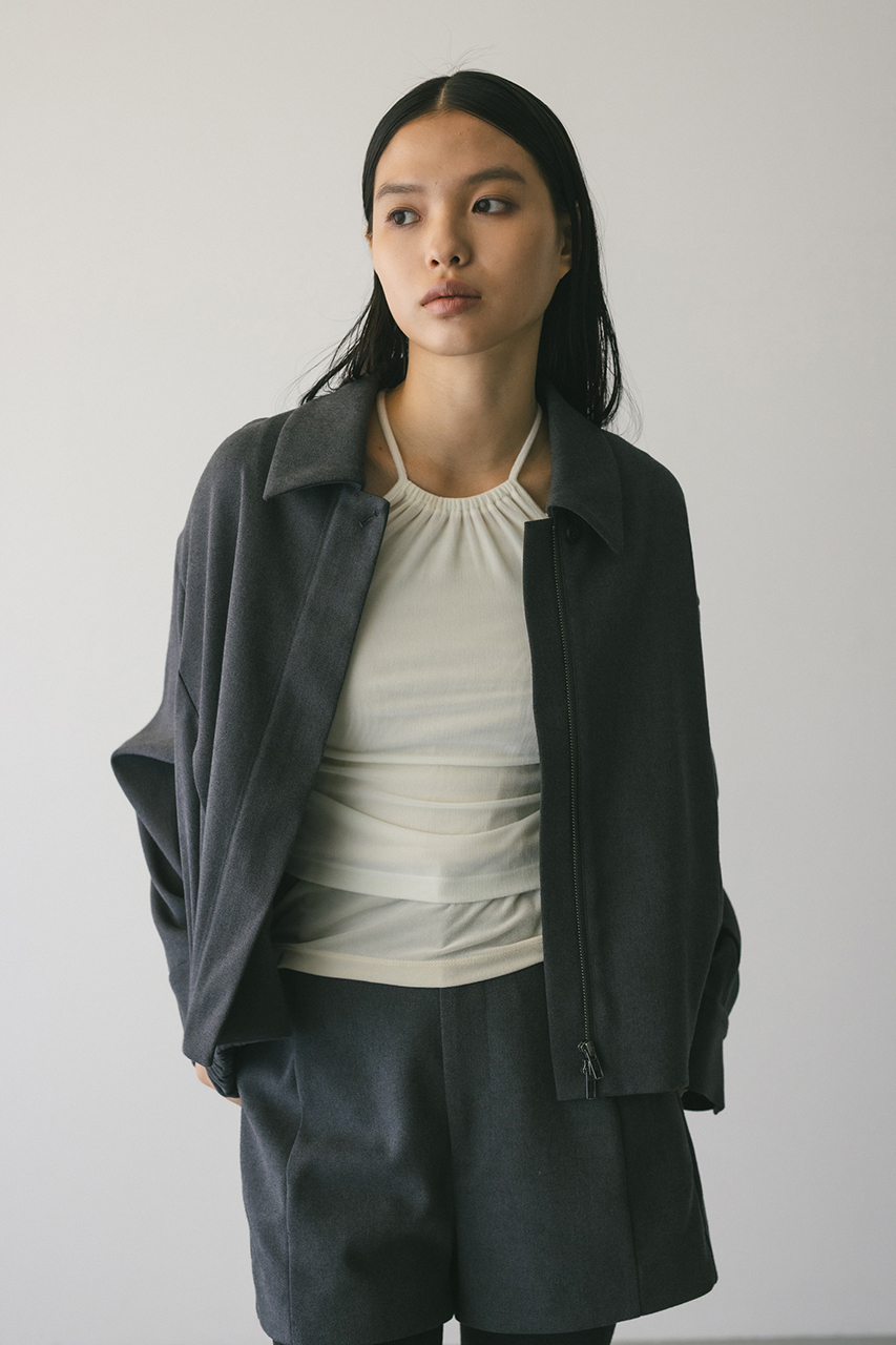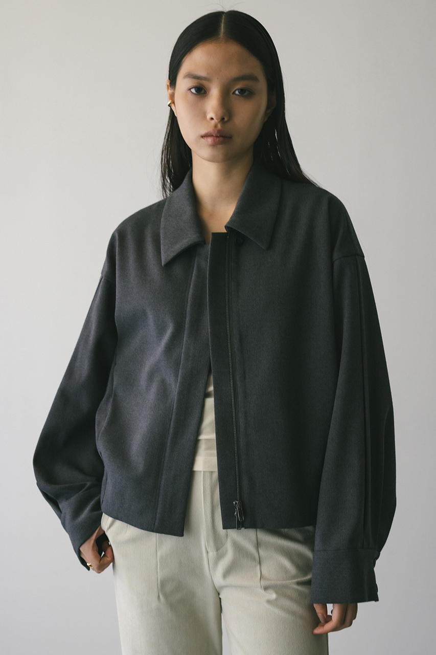 抜け感のある裾ゴムデザインと袖タックワイドスリーブがポイントのミディアム丈のブルゾン。逆開ファスナーでスタイリングしやすく、様々なスタイリングに馴染むアウター。ロングシーズン着用頂ける一重仕立てで仕上げました。袖口は調整可能。500IAS31-1171(フォルムショートパンツ)とセットアップ着用可能。透け感なし、ストレッチややあり。
