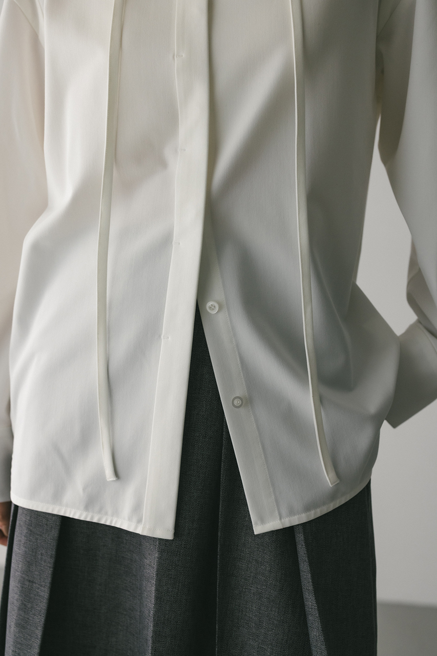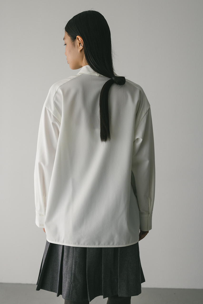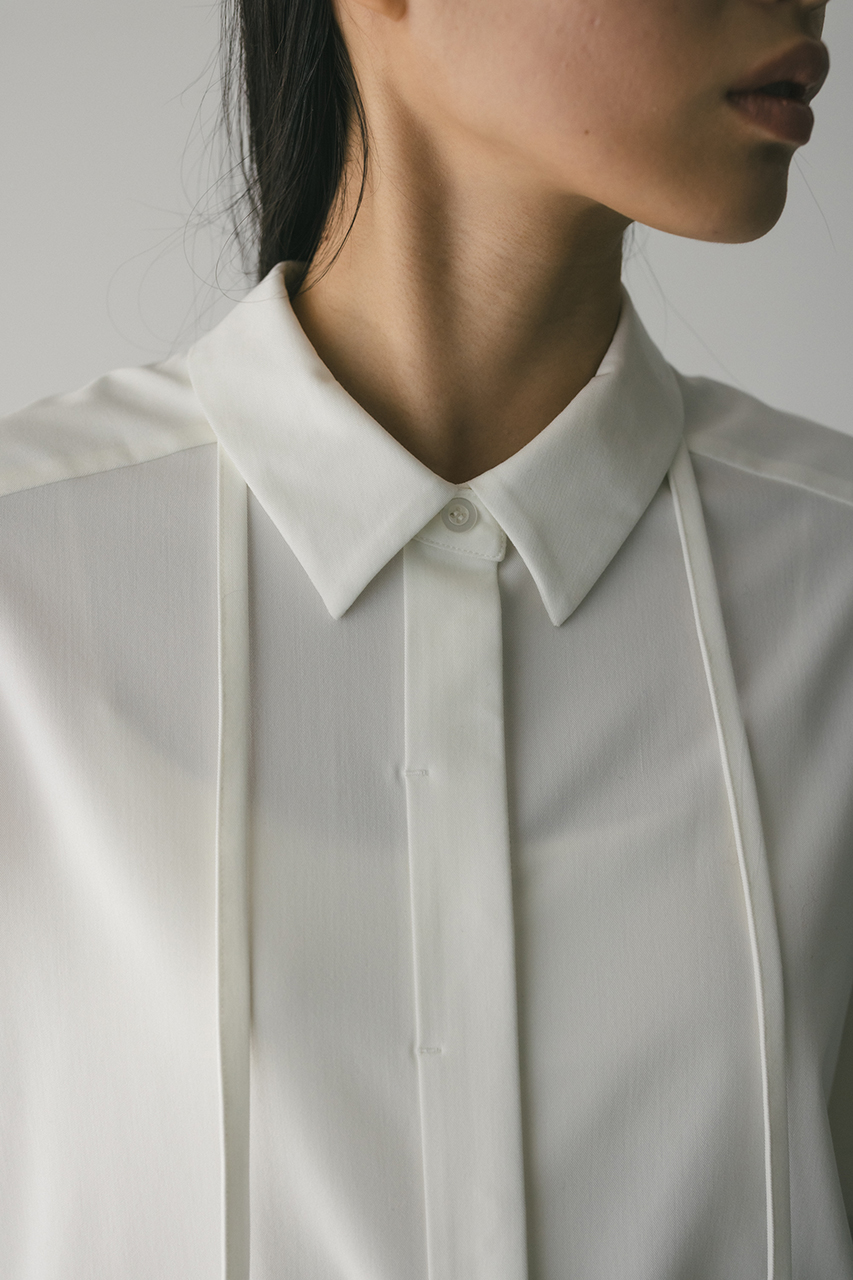 取り外し可能な共地のチョーカー紐がついたマニッシュシャツ。チョーカーを襟の下や首に巻くことで、アクセントが加わりぐっとこなれた印象に導きます。スタミキらしい程よく厚みのある生地を使用し、一枚でも羽織りとしても使い回しできる万能シャツです。ストレッチなし、透け感WHTややあり。