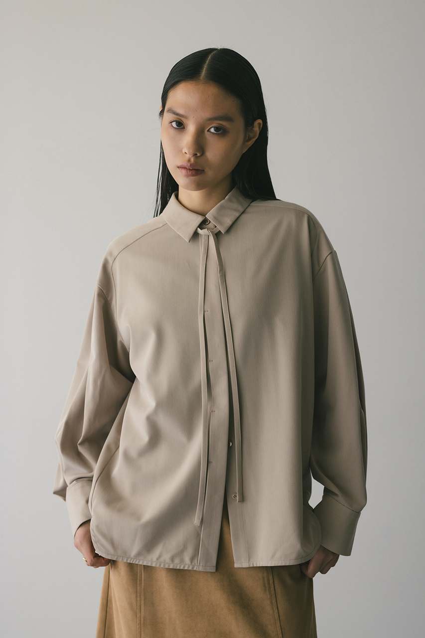 取り外し可能な共地のチョーカー紐がついたマニッシュシャツ。チョーカーを襟の下や首に巻くことで、アクセントが加わりぐっとこなれた印象に導きます。スタミキらしい程よく厚みのある生地を使用し、一枚でも羽織りとしても使い回しできる万能シャツです。ストレッチなし、透け感WHTややあり。