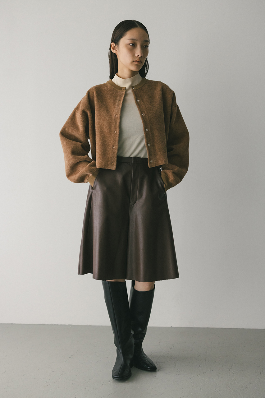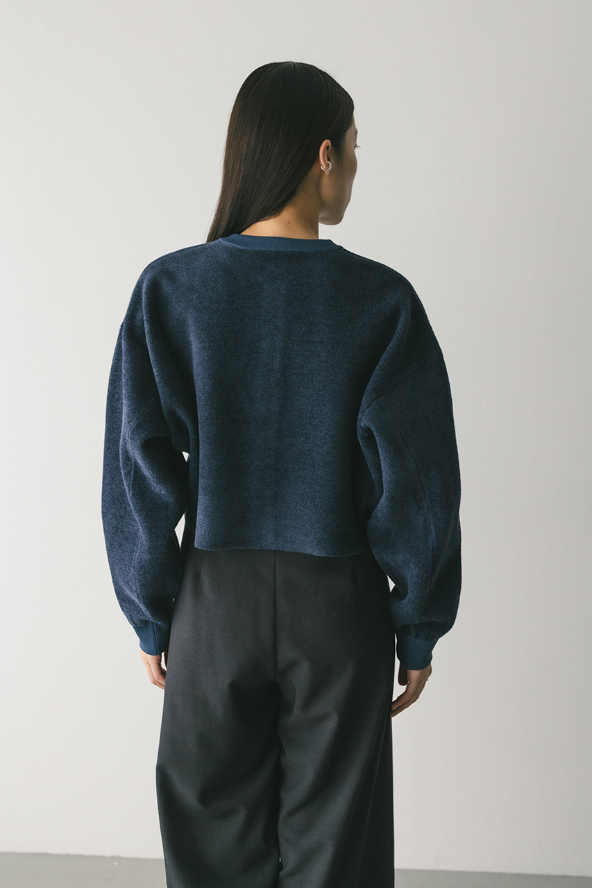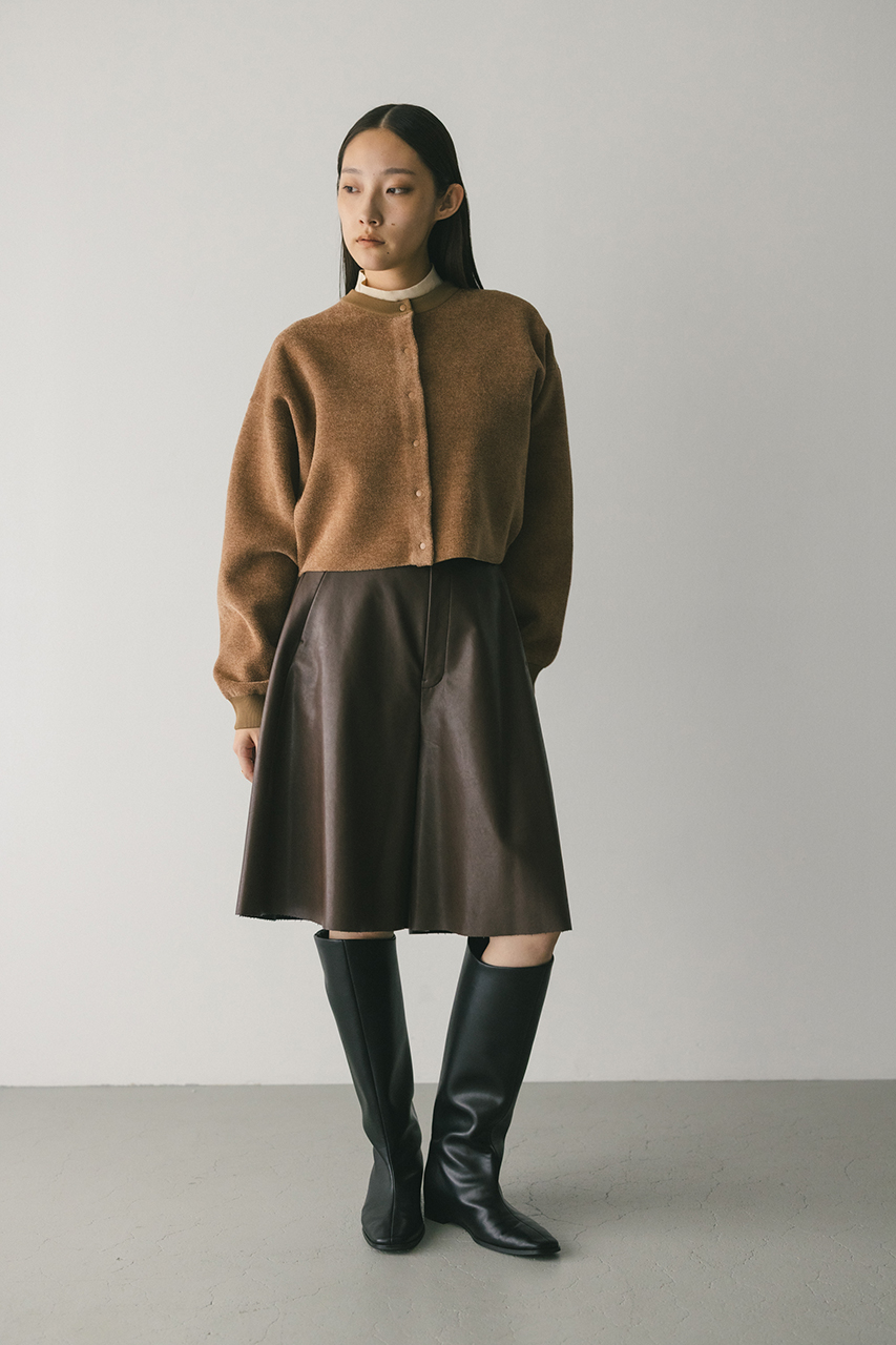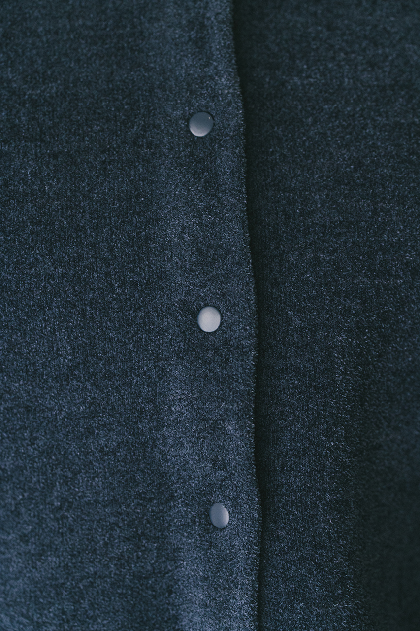 ベロアヤーンとなめらかで上品艶のポリエステル糸を編み立てたリバーシブルベロアニットカーデ。膨らみのある厚みでフォルムがしっかり立つ存在感のある一枚です。スナップドットが可愛いポイント。500IAS70-2261(バックオープンベロアショートニット)とアンサンブルでの着用もおすすめです。ストレッチあり、透け感なし。
