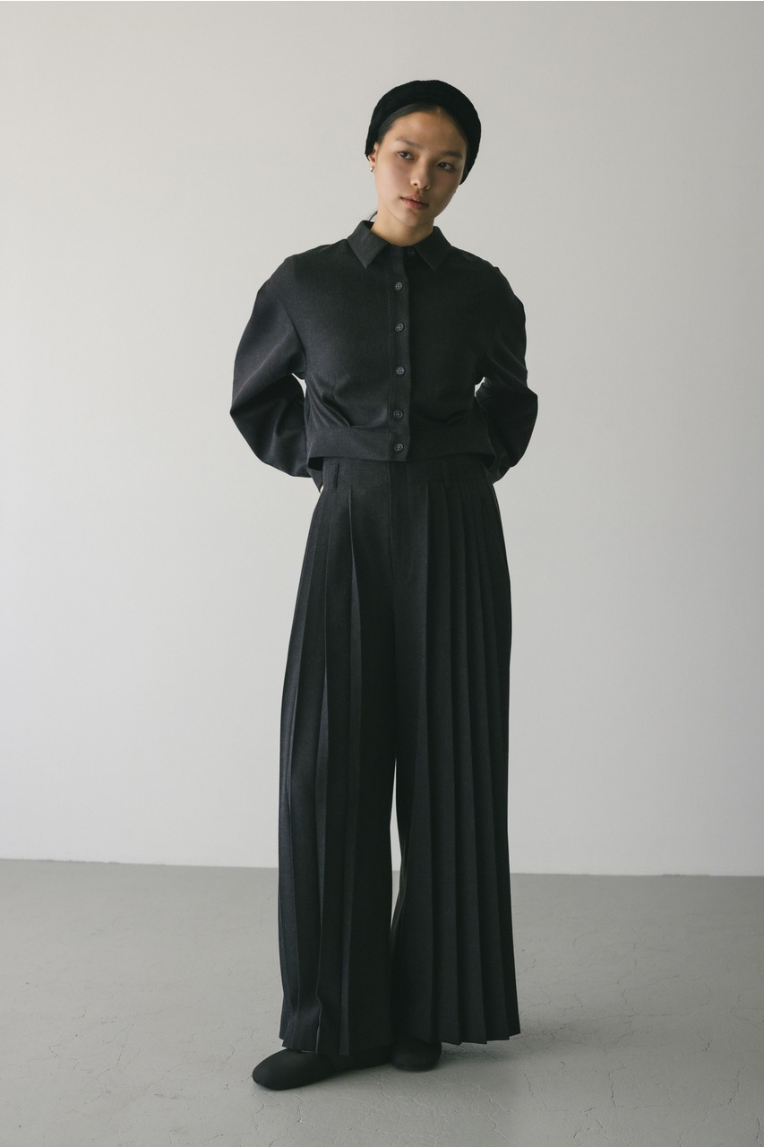 色を混ぜて作られた独特のカラーリングが可愛いメランジ生地を使用したショートシャツ。単色では出せない味わい深い色合いが魅力でこなれ感を演出し、上品な印象に導きます。前後共にタックディテールを施したスタミキらしい立体感のあるシルエットがデザインポイント。ドロップショルダーで肩の抜け感もありつつ、袖のカフスできちんと感も演出。前後差のある丈感でスタイルアップが叶います。500IAT31-0711(メランジタックワイドパンツ)とセットアップ着用可能。ストレッチなし、透け感なし。