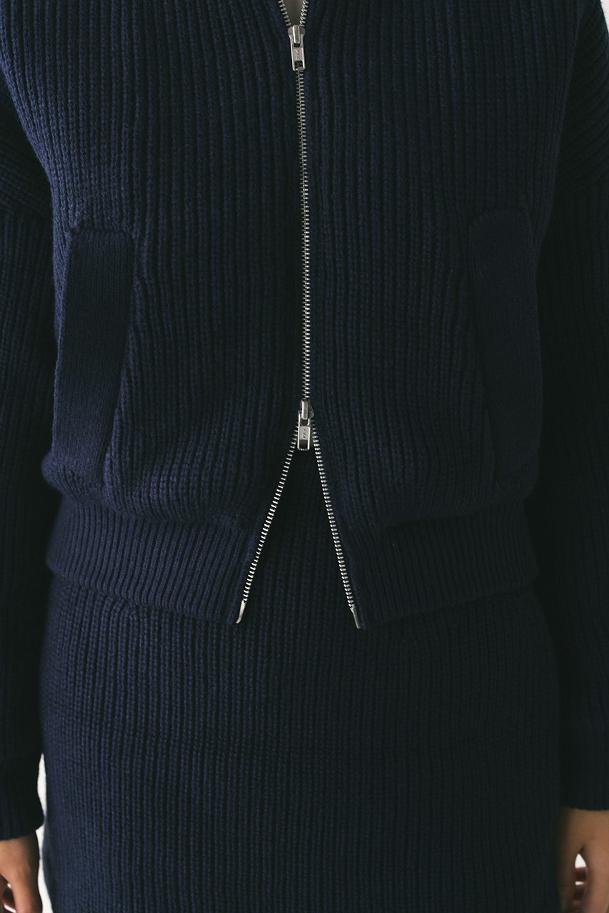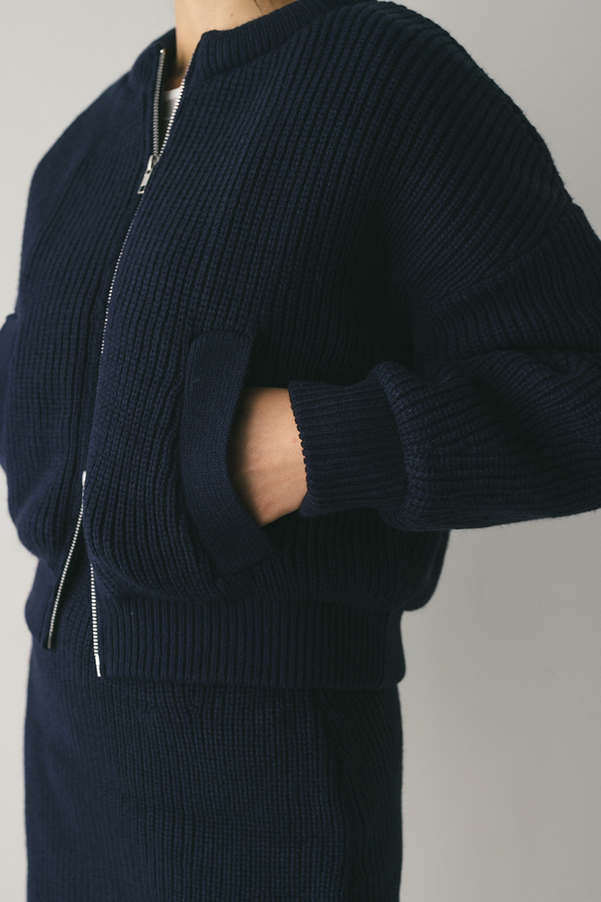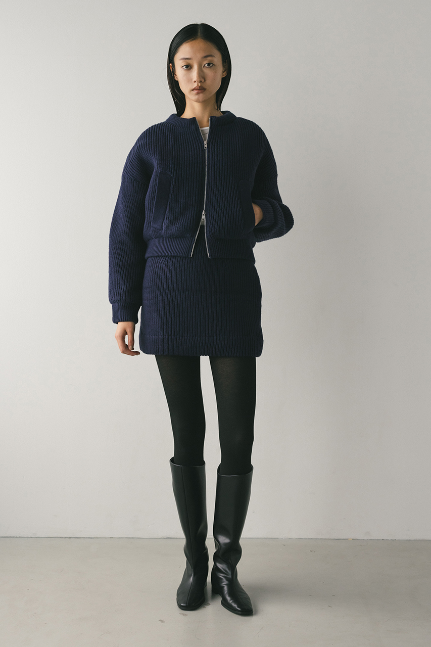 中綿ジャケットを暖か味のあるニット素材で編立てたニットパッファーブルゾン。ふっくらとした風合いの糸を使用し、方畦編みで編み立てる事で独特の立体感と高級感のでる編地に仕上げました。ボリューム感のあるシルエットと丸みのある袖のシルエットがデザインポイント。両開ジップ仕様。500IAT31-0961(ニットパッファーミニスカート)とセットアップ着用可能。ストレットあり、透け感なし。