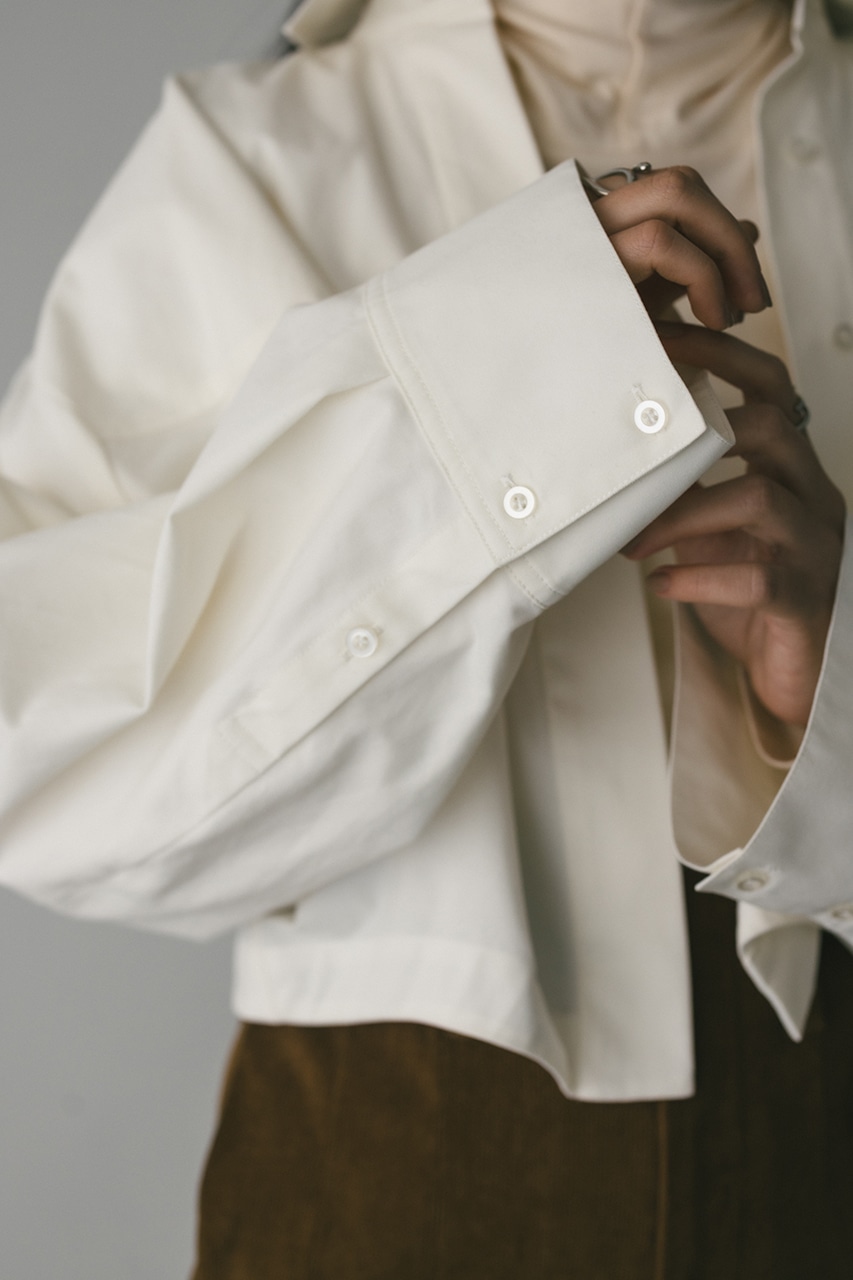 袖口のワイドスリーブと前にふったジャケットのような袖のシルエットがモードなショートシャツ。コンパクトな丈感とふくらみのあるパターンでつくる立体感のある丸いシルエットがポイント。前身頃は比翼仕立てですっきりとしたデザインに仕上げました。しっかりとした張り感のあるシャツ生地を使用しているのでトップスとしてはもちろん、羽織としても着用いただけます。ストレッチなし、透け感なし。