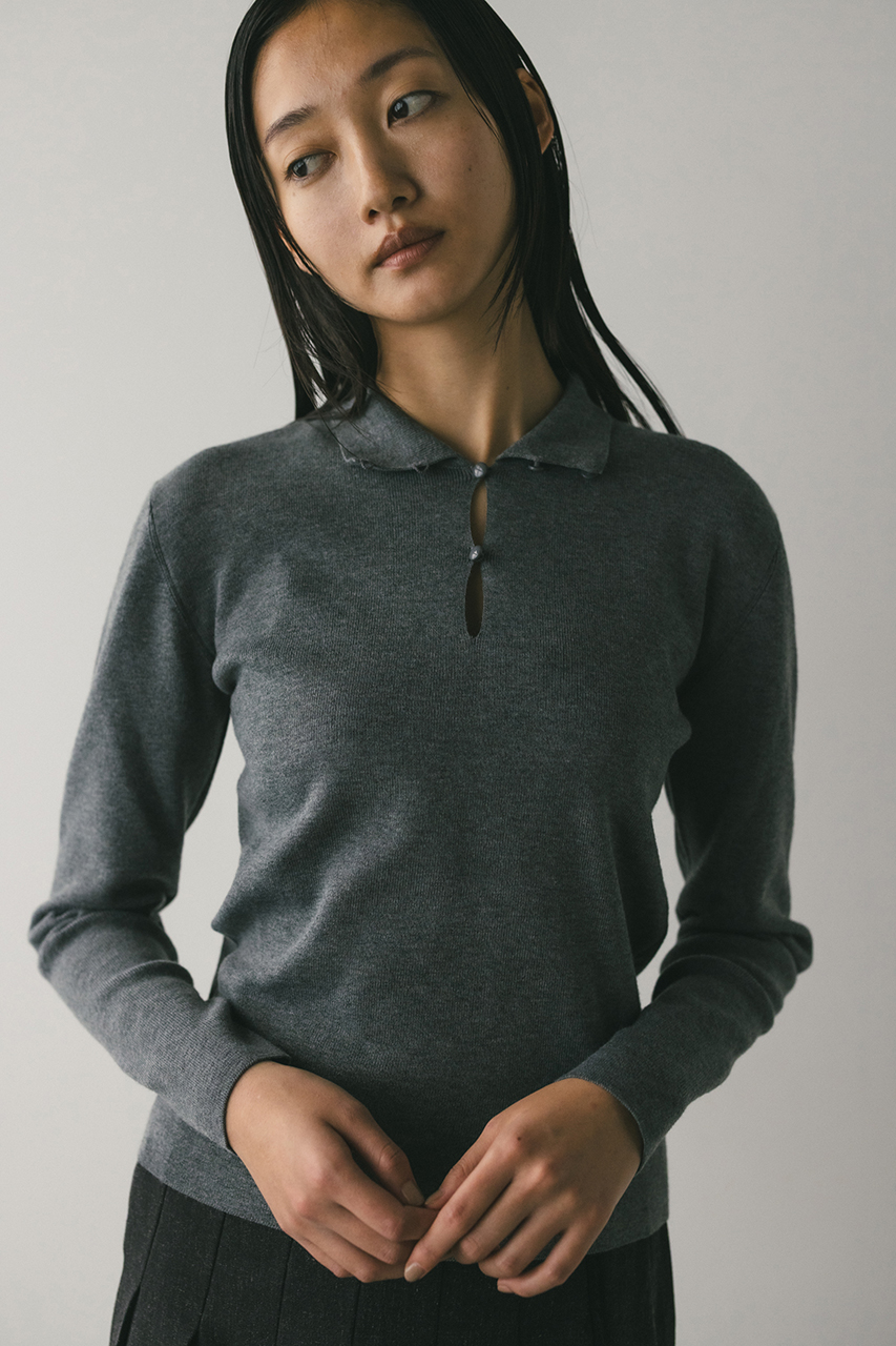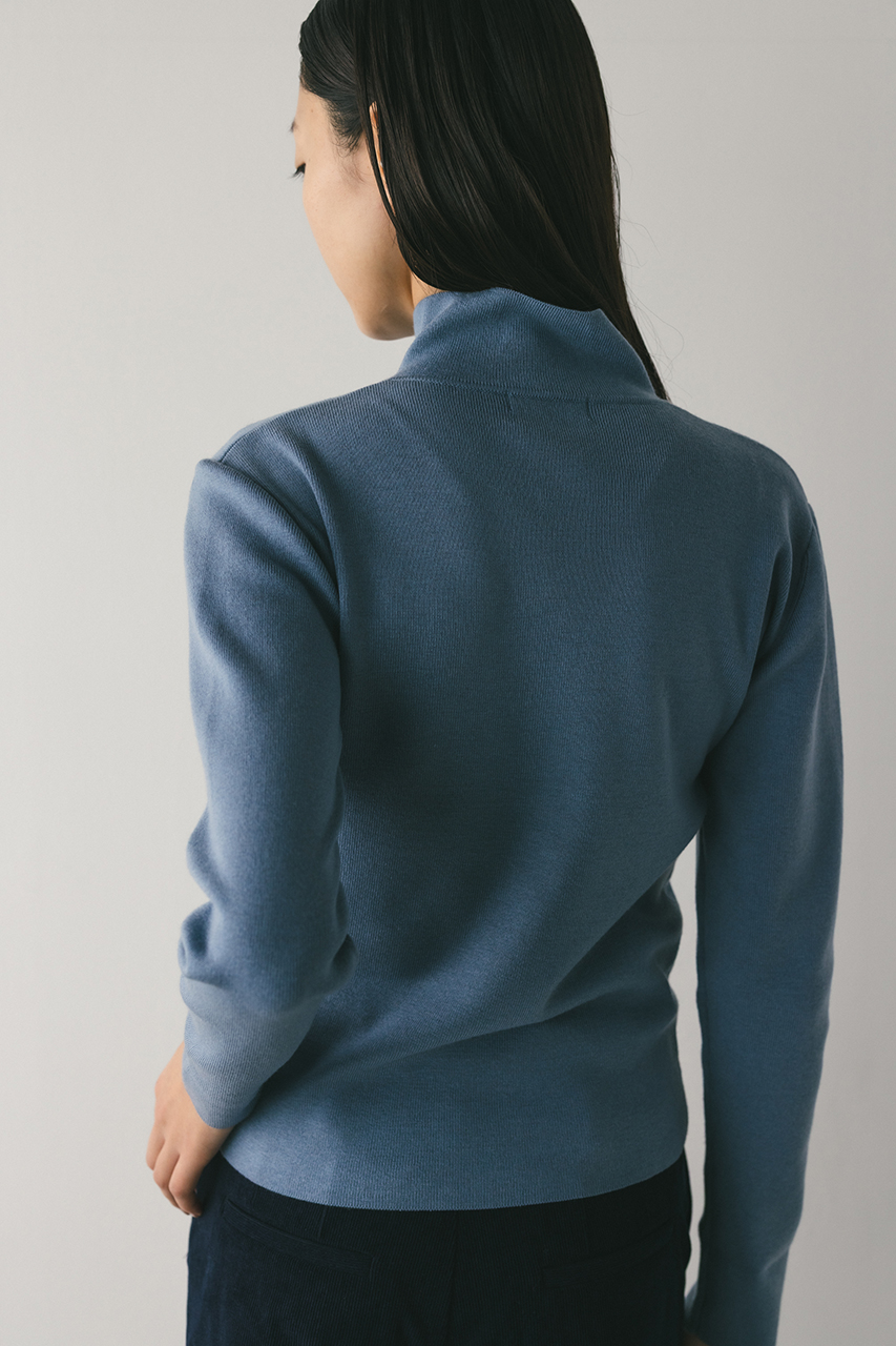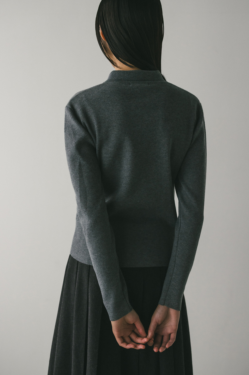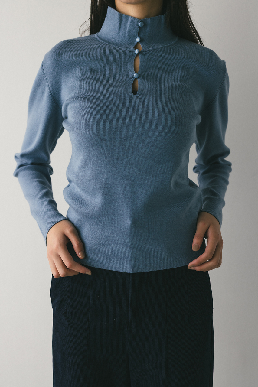 フロントの涙開きが女性らしい抜け感をプラスしてくれる美シルエットのニットトップ。ネック部分はボタンを閉めるとハイネック、開けると襟ネックと2WAYで着用いただけます。ストレッチ糸をプレーティングして仕上げているので身体に程よくフィットし、着心地の良い一枚。ストレッチあり、透け感なし。