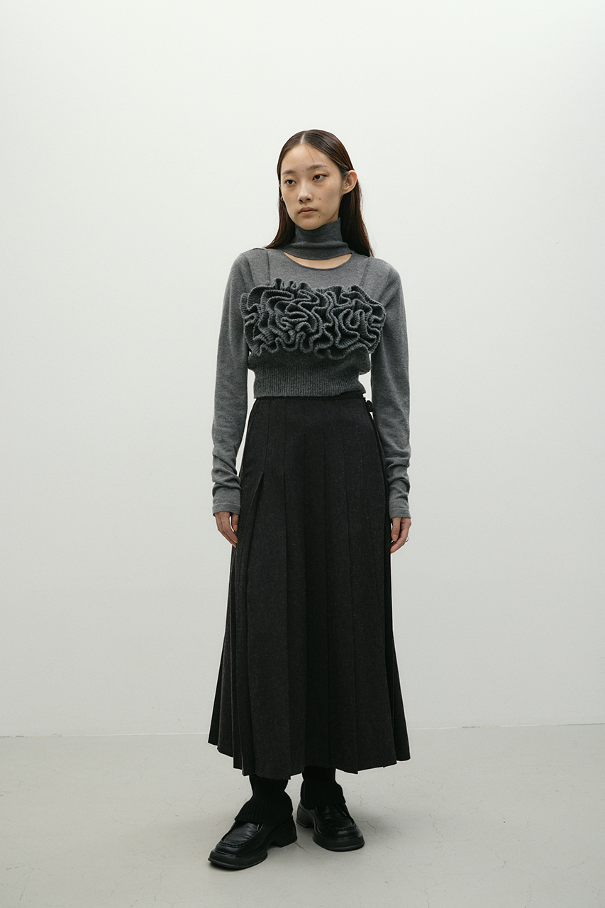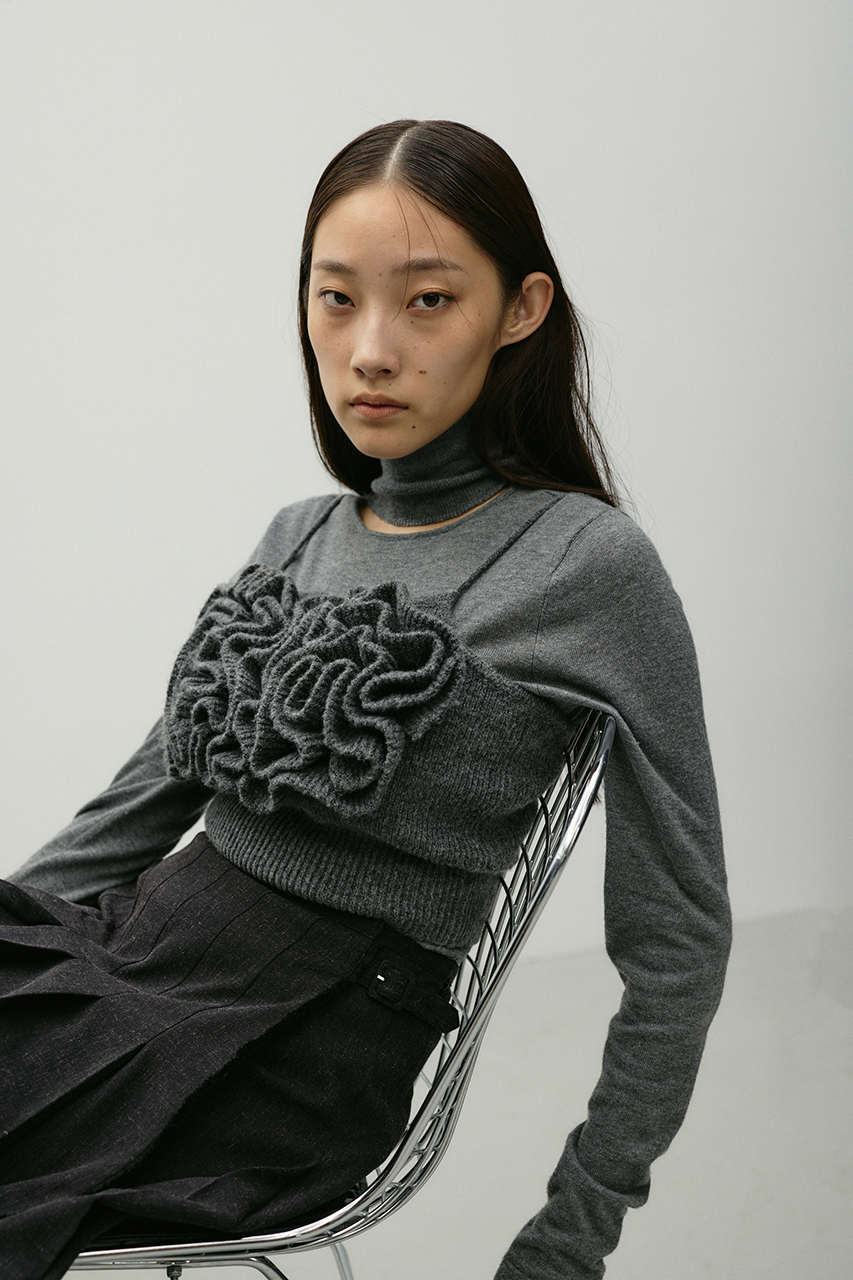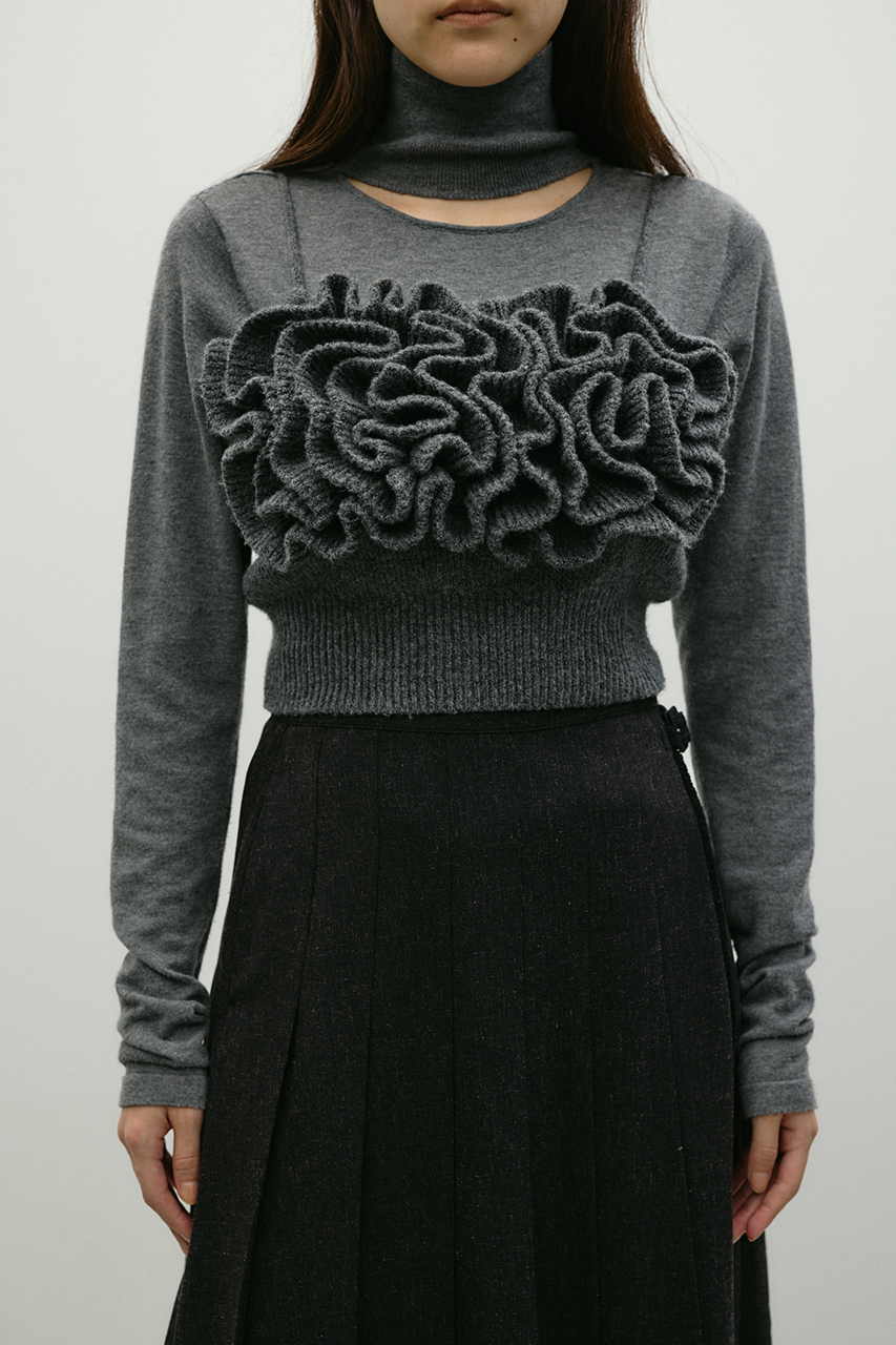 ランダムに付けたニットフリルがポイントのニットビスチェ。立体感のある可愛いフリルは、動きのでるようにランダム感とフリルのつけ位置にこだわったデザイン。脇部分はあえてフリルをはずし、脇はうごきやすく、フリルの幅を狭くすることで着痩せ見えするように仕上げました。ニットやシャツとレイヤードして着用していただくのがおすすめです。ストレッチあり、透け感なし。