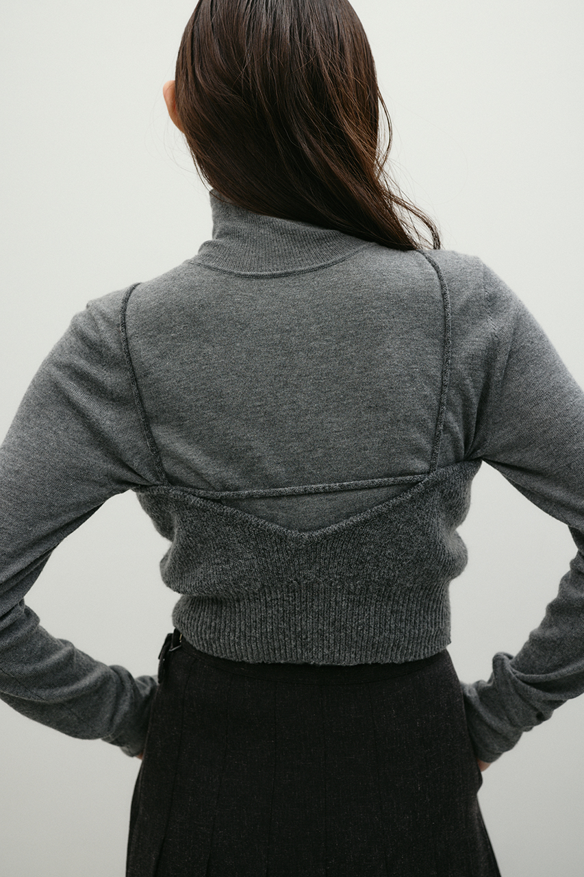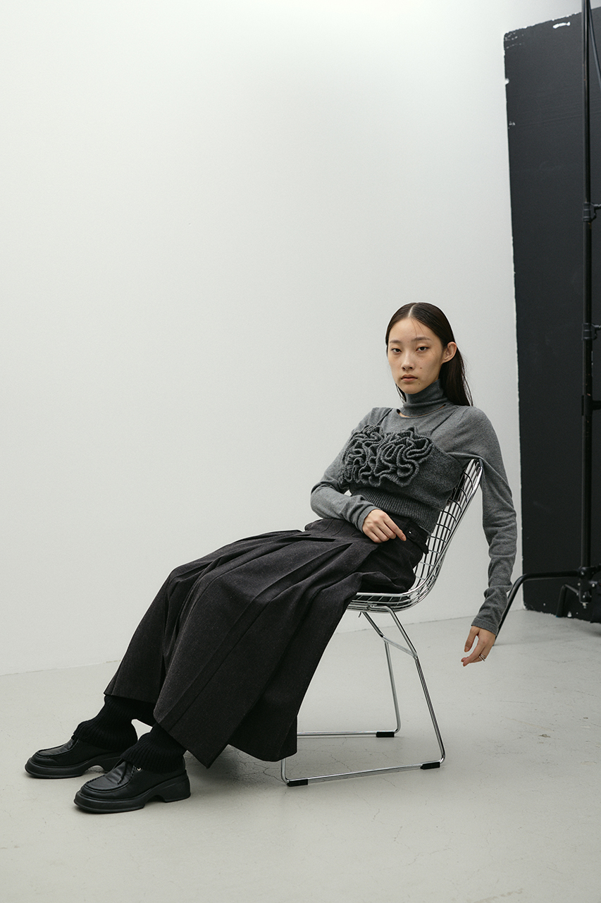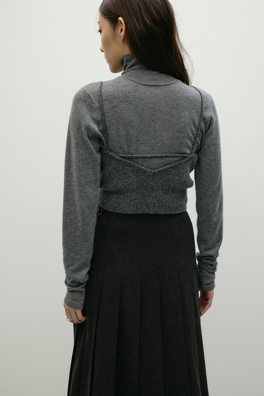 ランダムに付けたニットフリルがポイントのニットビスチェ。立体感のある可愛いフリルは、動きのでるようにランダム感とフリルのつけ位置にこだわったデザイン。脇部分はあえてフリルをはずし、脇はうごきやすく、フリルの幅を狭くすることで着痩せ見えするように仕上げました。ニットやシャツとレイヤードして着用していただくのがおすすめです。ストレッチあり、透け感なし。