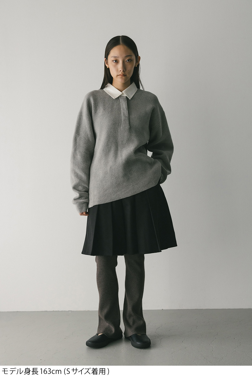 ニットで編み上げたベロアライクな質感がポイントのラガーニットトップ。毛足の短いモール糸を使用し、厚みのでるよう接結編みで仕上げた非常に高級見えする一枚。接結編みにすることで程よく厚みを出しつつ、ニットでも形崩れしにくいふんわりとした柔らかい肌触りに仕上げました。ラグビージャージのコットン衿などオーセンティックなディテールを活かしつつ、肩位置を落としたドロップショルダーデザインで、大人のトレンドスタイルに導きます。ストレッチあり、透け感なし。