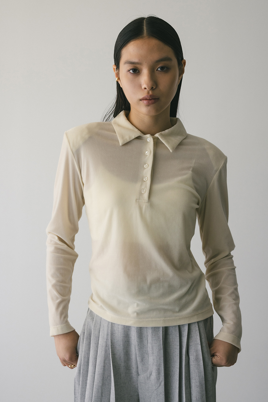 大人の抜け感を演出してくれるシアー感のあるメッシュベロア生地を使用したポロトップ。肩パットを施したパワーショルダーシルエットがポイント。あえての細身シルエットで上品な印象に導きます。ストレッチあり、透け感ややあり。