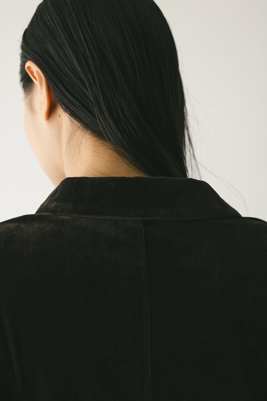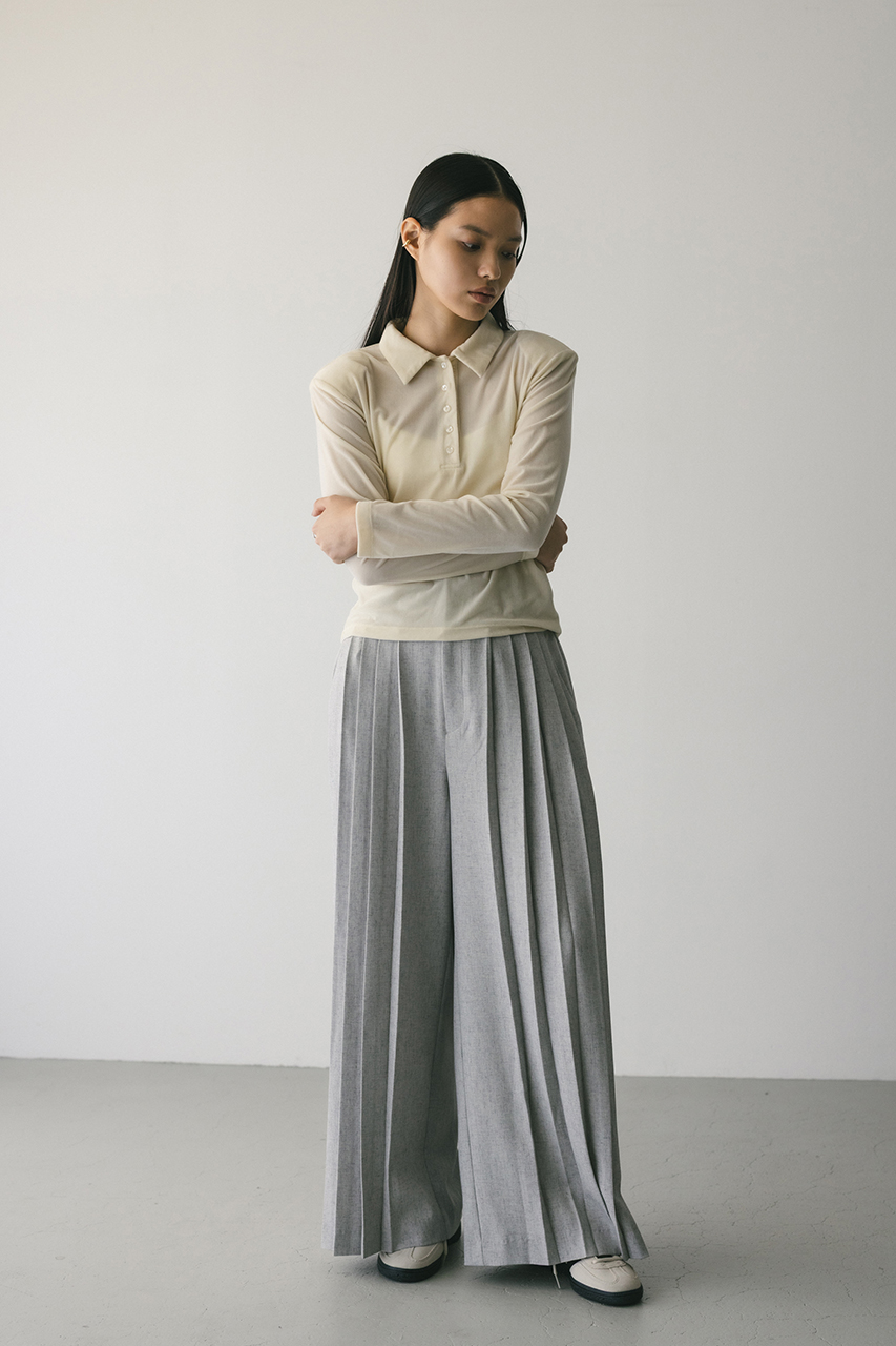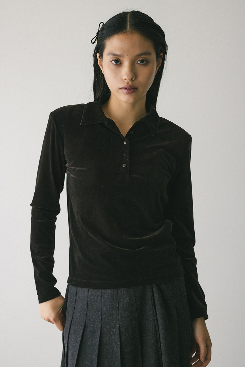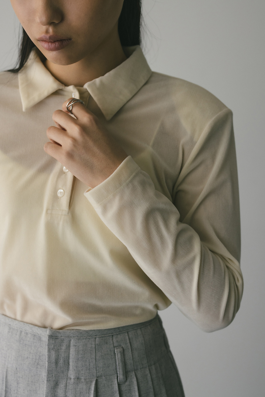 大人の抜け感を演出してくれるシアー感のあるメッシュベロア生地を使用したポロトップ。肩パットを施したパワーショルダーシルエットがポイント。あえての細身シルエットで上品な印象に導きます。ストレッチあり、透け感ややあり。