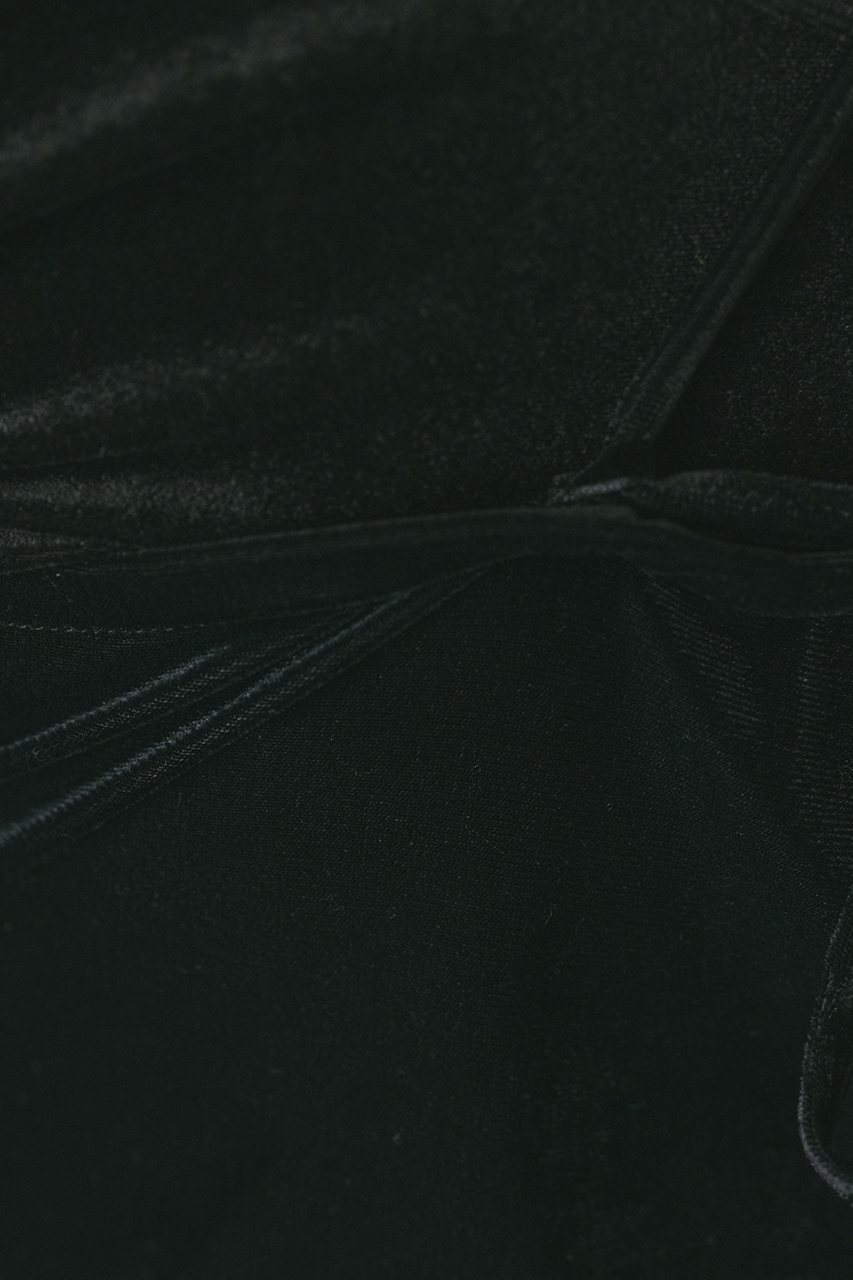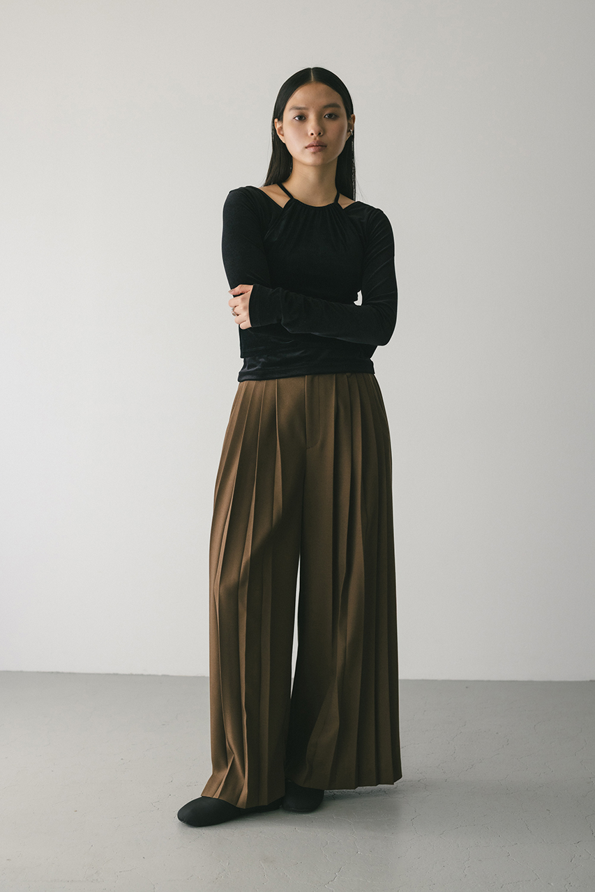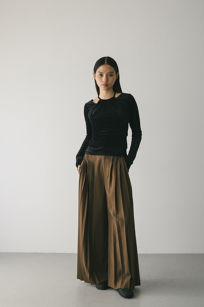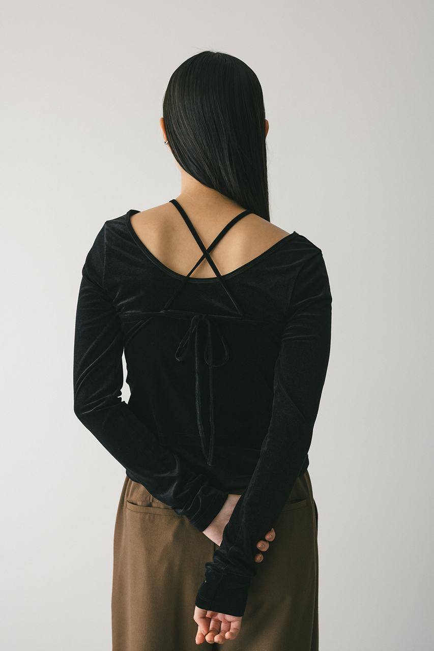 2素材のベロア生地を使用したレイヤードトップ。前後共に大きく開けたネックラインがデコルテをきれいに見せてくれるロンT。透け感のある生地を使用しているので大人な抜け感を演出します。ホルターネックはやや厚みのあるベロア生地を使用。ネック部分はギャザーをよせたデザインで首周りを華やかに見せてくれます。肩紐はネック部分で結んでも、バックにループがついているのでキャミソールとしても着ていただける2WAY仕様です。ストレッチあり、透け感ロンTややあり