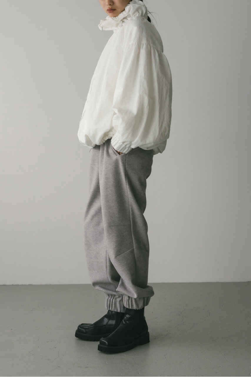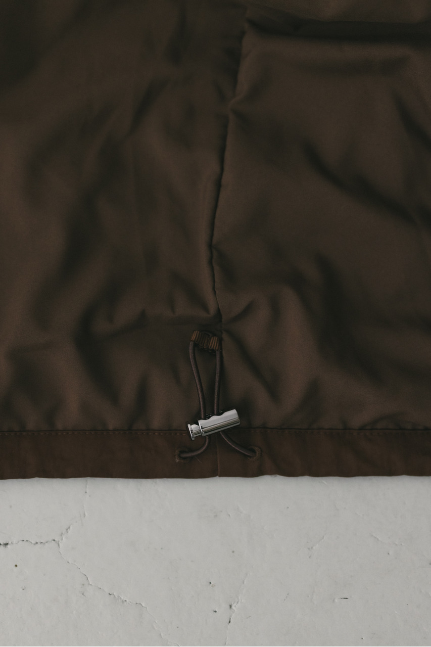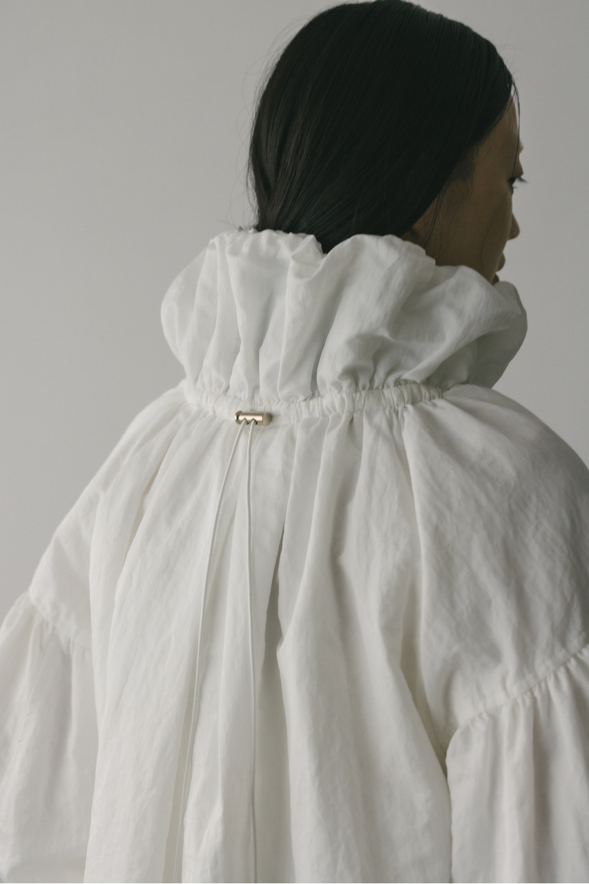 襟にギャザーをたっぷりと寄せニュアンスをもたせた中綿入りブルゾン。上品な光沢感と適度な柔らかさとハリ感を合わせ持ったこだわりのナイロン素材を使用。ファスナーを上まで閉めたスタンドネックスタイルや少し開けて折り返した襟も楽しめます。後ろ襟に施された長めのドロストコードと深く入ったタックによりバックスタイルもこなれた印象に。ギャザーを寄せたゆったりとした丸みのある袖なので、厚手のニットも着用いただけます。裾は調整できるストッパー&ゴム仕様。ポケットあり。裏地あり。ストレッチなし、透け感なし。